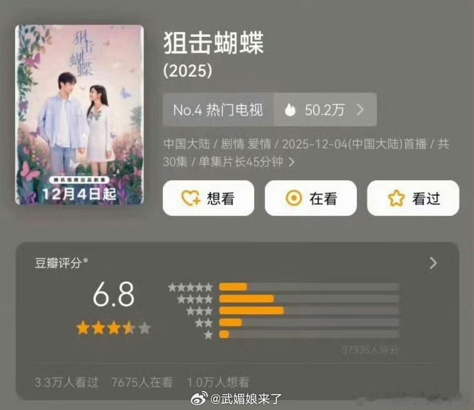 陈妍希、周柯宇《狙击蝴蝶》豆瓣开分6.8打分人数3.7万➕三、四星比例最高这个
