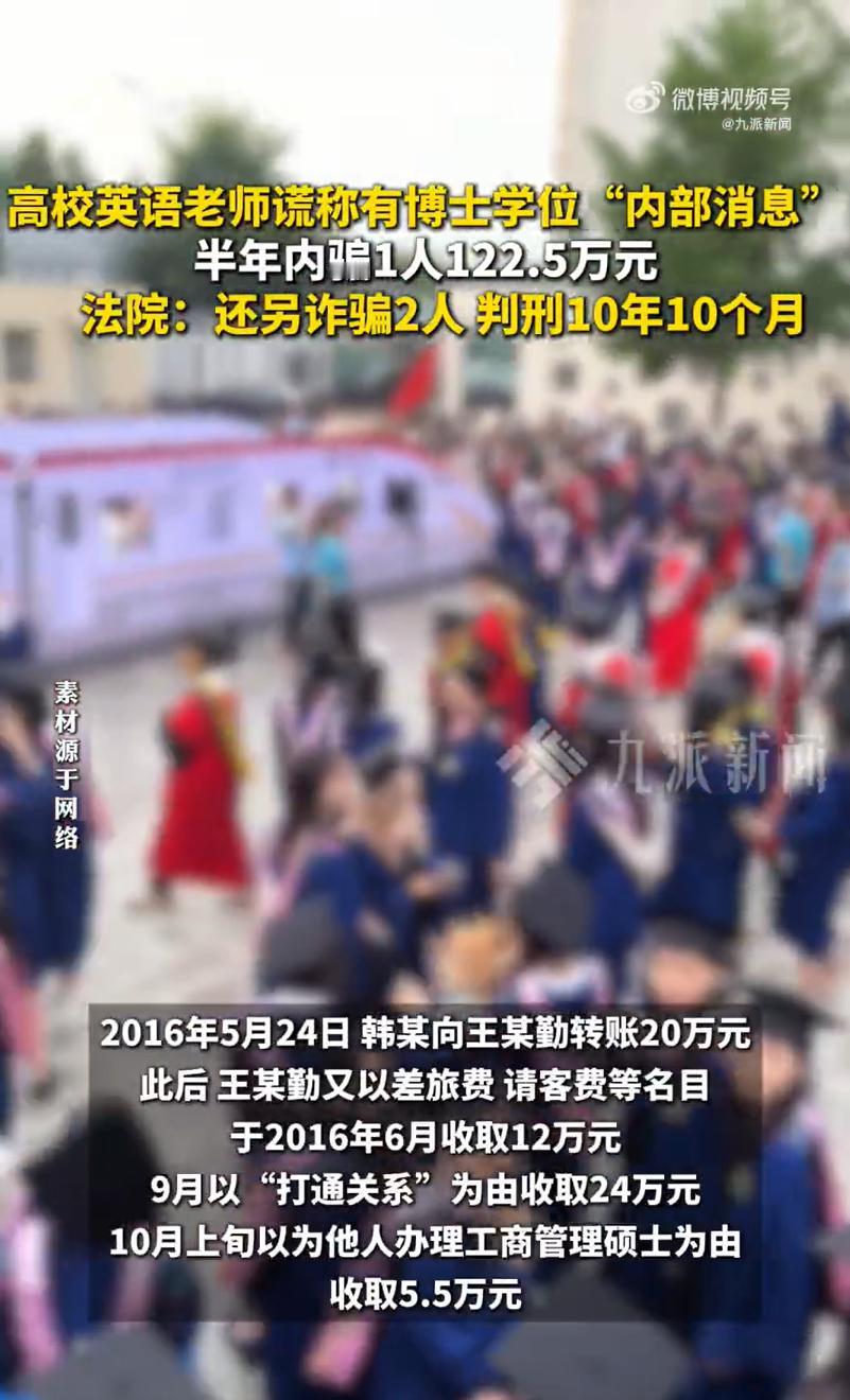 高校教师谎称包拿博士诈骗122万,还诈骗另外2人,获刑10年10个月 2015年秋,硕士研究生毕业的王某勤入职山西太原某高校,担任英语教师,并负责在职人员学历提升相关工作。已经拥有在职研究生学历的韩某约王某勤吃饭,王某勤声称,只要获得博士学位,不仅能很快晋升副教授,还能享受人才奖励政策。韩某怦然心动,但其不具备入围资格,王某勤称其可以提供帮助。 2016年5月24日,韩某向王某勤转账20万元。此后,王某勤又以差旅费、请客费等名目,于2016年6月收取12万元;9月以“打通关系”为由收取24万元;10月上旬以为他人办理工商管理硕士为由收取5.5万元;10月18日以差旅费、导师推荐费等名目收取27万元;10月25日、11月19日分别收取推荐费、论文发表费23万元、6万元。2017年1月,王某勤又以支付尾款为由收取5万元。上述款项共计122.5万元。 2017年4月,博士研究生录取名单公布,韩某未被录取,向学校核实后发现受骗。此后至2024年7月,王某勤陆续退还韩某43万元,并三次出具欠条。2024年8月,韩某提起民事诉讼,法院认为案件涉嫌诈骗犯罪,建议报警。 警方立案后查明,王某勤另有两起诈骗事实。2025年1月14日,山西省灵丘县人民检察院以诈骗罪对王某勤提起公诉。法院审理认为,王某勤以非法占有为目的,虚构事实、隐瞒真相,骗取韩某、董某、赵某钱款共计86.5万元,数额特别巨大。 法院认定,所谓“委托办理升学、转学籍、学历提升”等行为,违背招生和教育管理秩序不构成合同诈骗。王某勤多次诈骗、多名被害人,应依法从重处罚。 2025年3月21日,灵丘县人民法院一审判决:王某勤犯诈骗罪,判处有期徒刑十年十个月,并处罚金10万元;责令退赔韩某79.5万元、董某4万元、赵某3万元。一审宣判后,王某勤未提出上诉,判决已生效。 来源:九派新闻