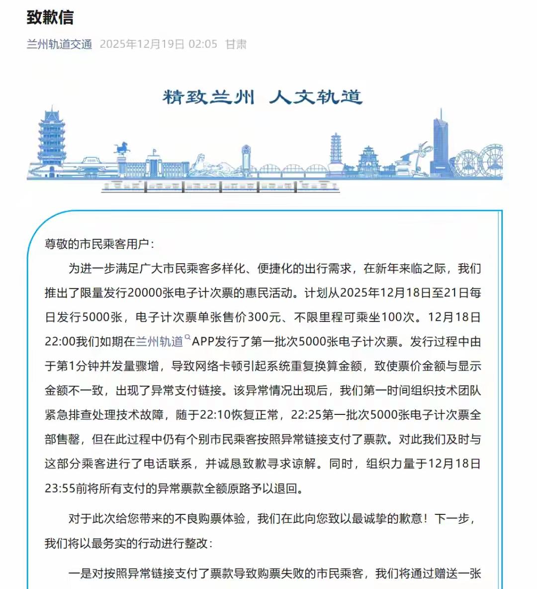兰州地铁支付系统出现故障,乘客支付300元的时候,变成了300万! 由于兰州地铁是第1次卖这种套票,在支付方面没有做好相关的操作,结果导致部分旅客支付的时候变成了3万,还有部分顾客支付的时候变成了300万。 发生这种情况之后,兰州地铁迅速行动起来,与发生支付故障的用户进行联系并且进行了退款。12月19日深夜,兰州轨道交通发文向广大乘客道歉。 关于支付系统出现故障还是挺多的,近几年最出名的是支付宝支付故障,付款的时候直接打折20%,最后支付宝是承担了所有费用,相当于发生故障期间所有付款的人都占了20%的便宜。 兰州地铁此次故障是多收钱的,所以积极退款这是正确的,发公告也是为了向大家解释为什么会发生这种情况。 各位是怎么看的?欢迎评论区留言。