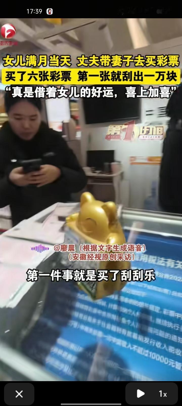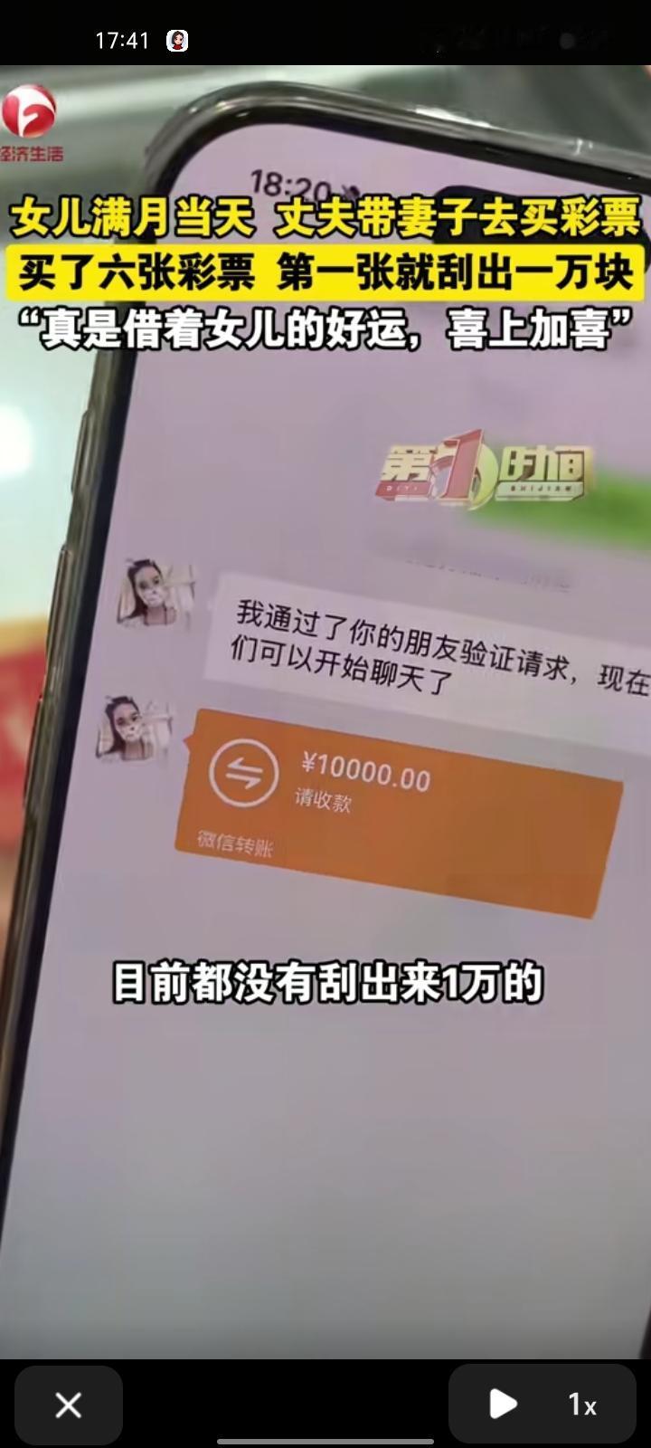 12月17日,北京。网友发视频称,闺女满月当天,自己拉着妻子去商场吃烤肉,到商场第一件事就是买刮刮乐 买了六张彩票,没想到第一张就刮出一万块,连彩票站的人说目前都没人刮出一万的。都说宝宝是带着财运来的,真是借着闺女的好运,喜上加喜。