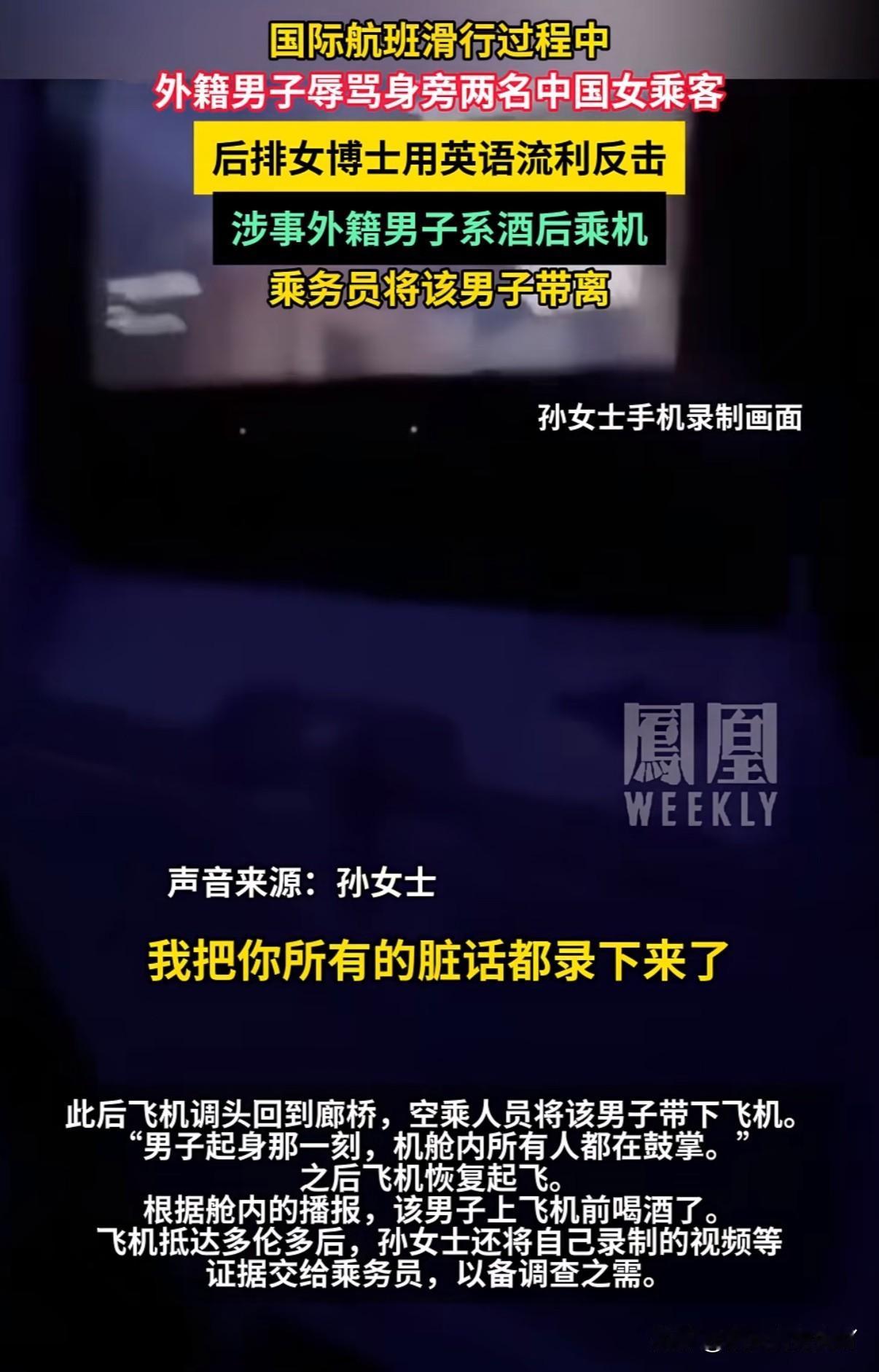 外国醉酒男子哈尔滨飞机上用英文辱骂邻座女孩被后排女生用流利英文反击最终外国男子被赶下飞机 事发12月15号由哈尔滨起飞经首尔转机至多伦多的加拿大航空ac62航班,在滑行时外国男子不停骚扰并用英文辱骂邻座两个中国女生,“蠢🐷、哑巴、包括f开头的词”两个女生不知道是不是听不懂始终未发一言,后排来自哈尔滨的女博士挺身而出与外国男子理论并找来空乘,最终外国男子被赶下飞机 孙博士不仅勇敢而且非常聪明,她制止之后马上跟工作人员说这个男的是“racist”,本来这个男的还在那鬼叫,一听这词立刻就oh闭麦了[泪奔]唯一可惜的是英语限制了东北话的发挥,很多骂人的词表达不出来