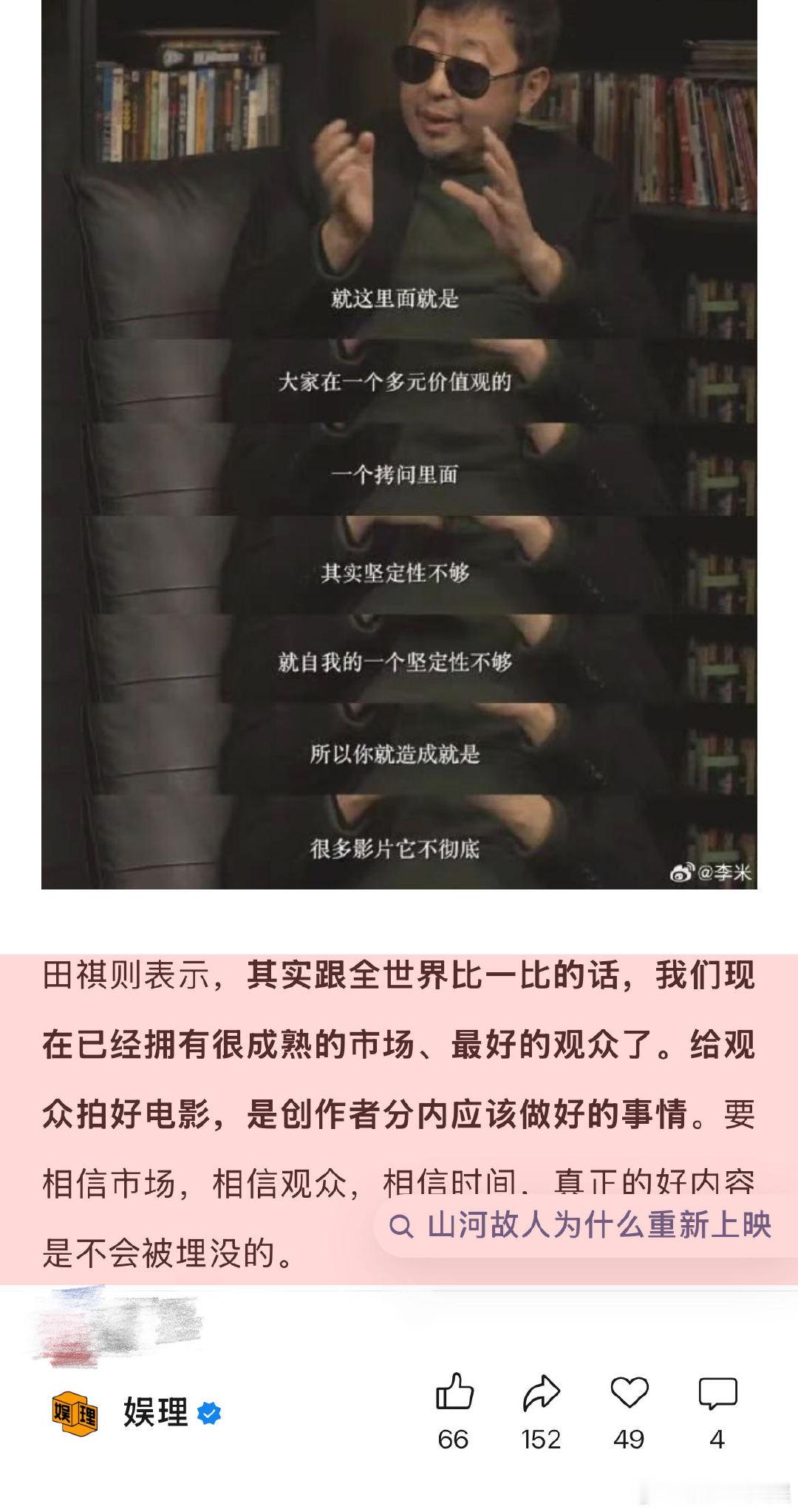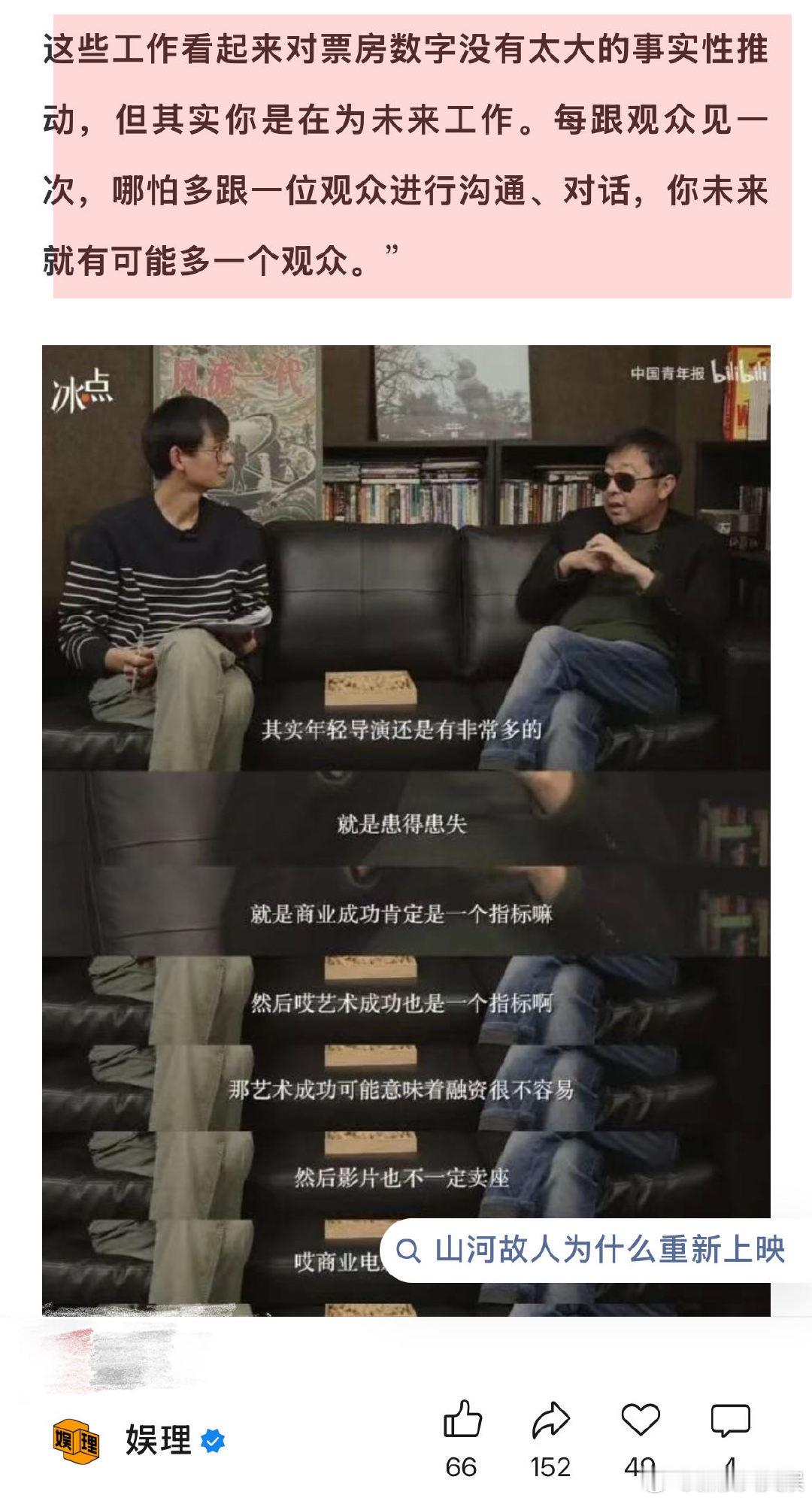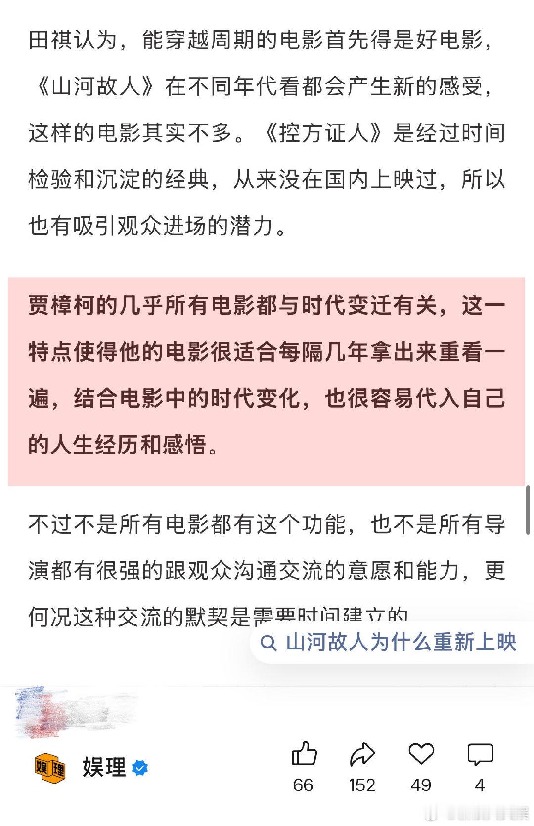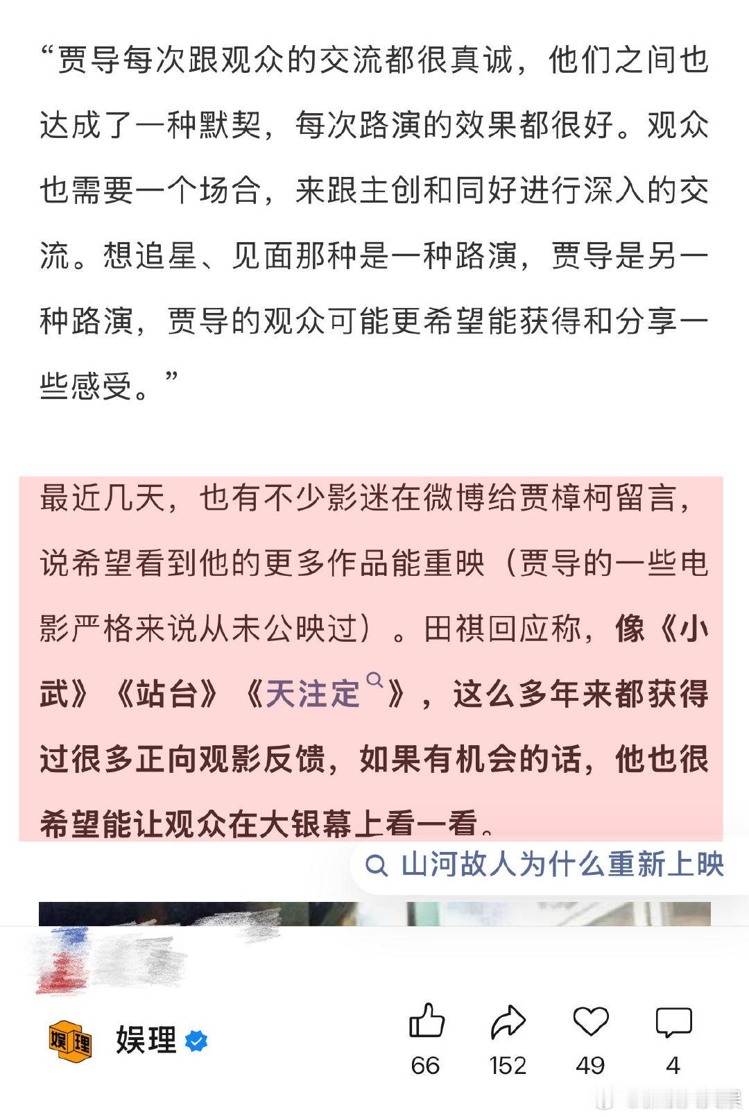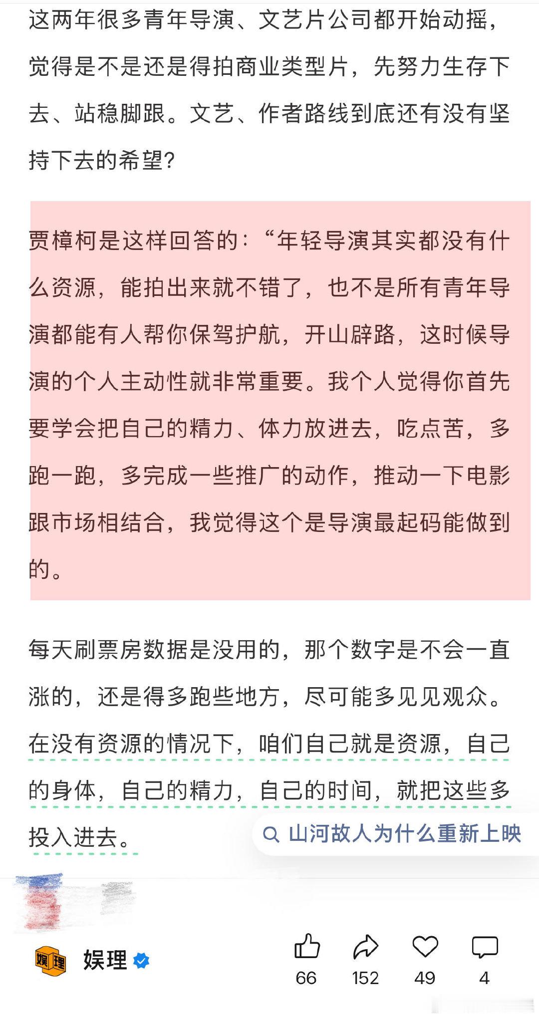 贾樟柯谈文艺片路演的意义 为什么山河故人复映能拿下500万票房 最近几天,也有不少影迷在微博给贾樟柯留言,说希望看到他的更多作品能重映(贾导的一些电影严格来说从未公映过)。田祺回应称,像《小武》《站台》《天注定》,这么多年来都获得过很多正向观影反馈,如果有机会的话,他也很希望能让观众在大银幕上看一看…娱理独家↓