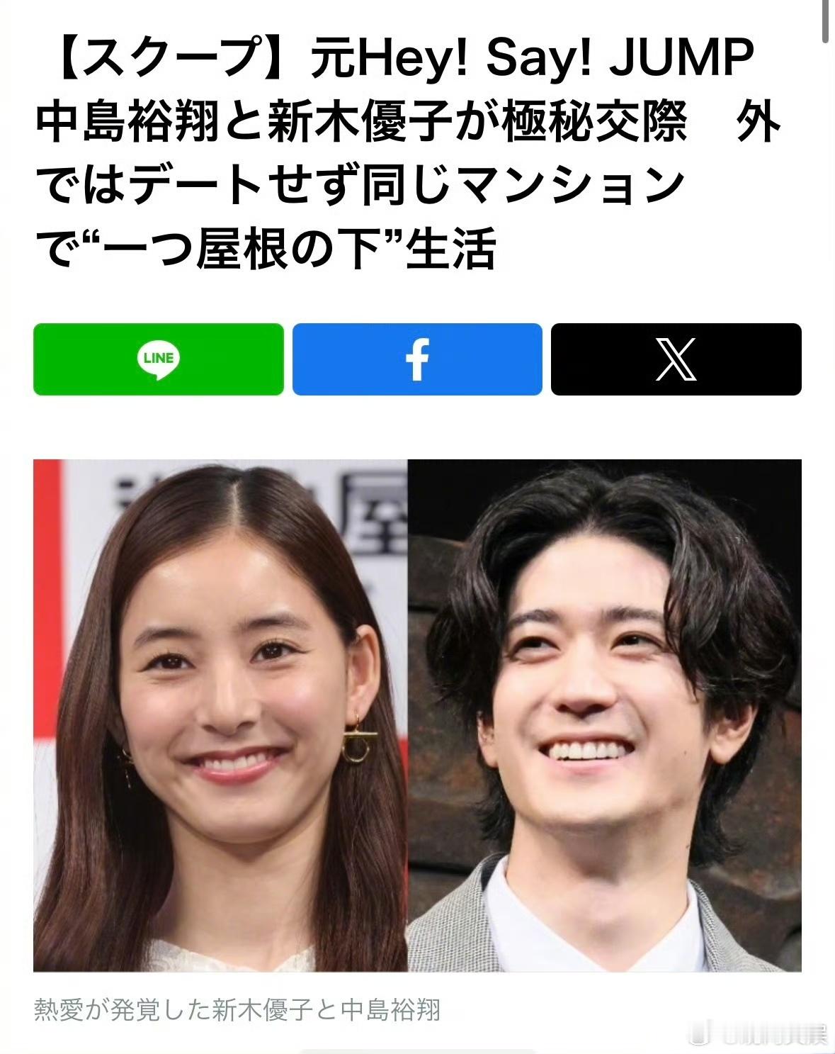 中岛裕翔新木优子恋情Hey! Say! JUMP前成员中岛裕翔(32)与演员新木优子(32)被曝正在恋爱,据《女七》报道,中岛裕翔的熟人透露新木优子在今年夏天就搬到了中岛家楼上,两人开始“半同居”的生活。新木优子好友称两个人从不在外约会,今年新木优子的生日是两人一起在家中庆祝。记者向双方事务所求证交往及结婚事宜,截止发稿没有收到回复。据悉,两人2017年在电影《明天也有好吃的饭》饰演恋人结识,随后在电视剧《金装律师》系列中连续合作,大概3年前关系拉近。