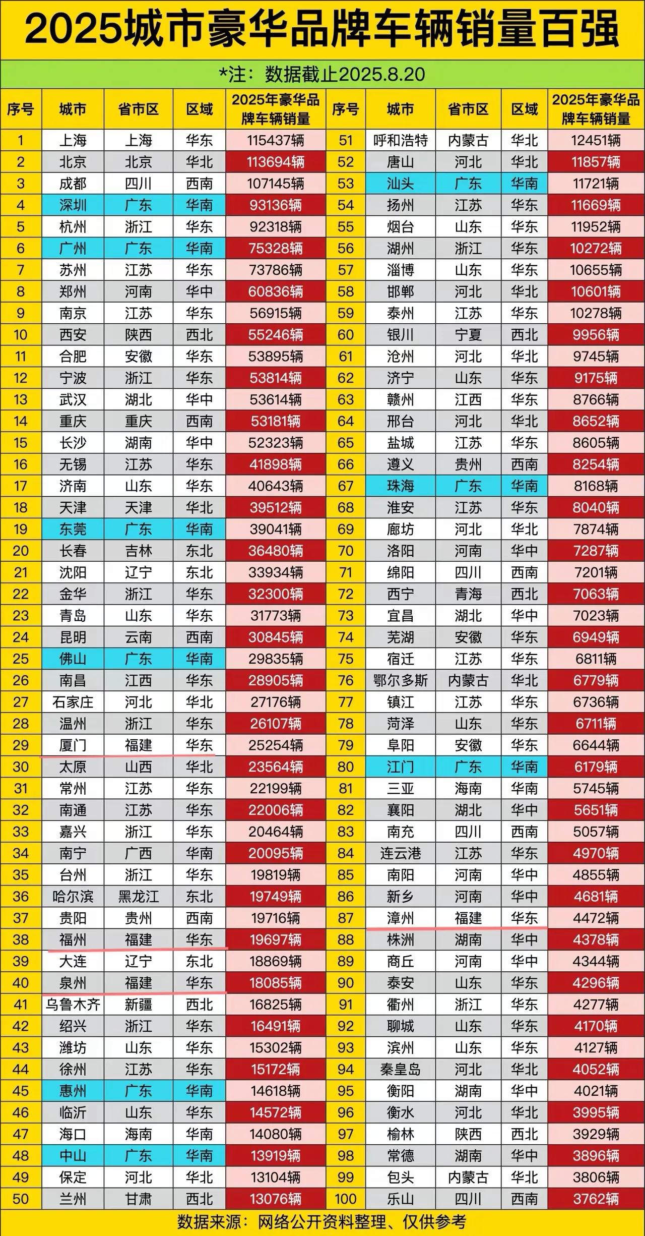 2025年福建省4城市入围豪华品牌车辆销量百强