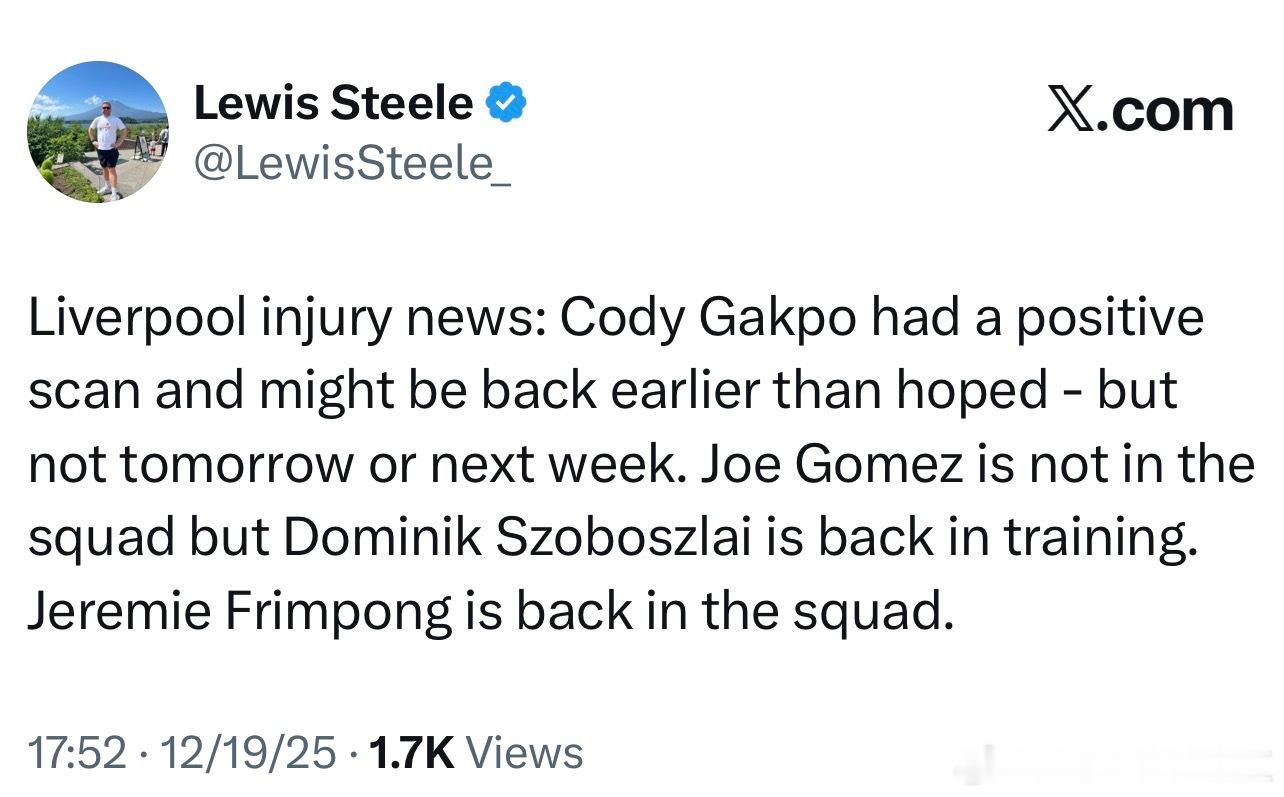 斯洛特谈我军的伤病情况,加克波的扫描结果还算不错有可能会比预期的时间更早回来,但是本周和下周的比赛还是赶不上的。戈麦斯也还不太行。但是索博已经随队训练了,弗林蓬也回来了。