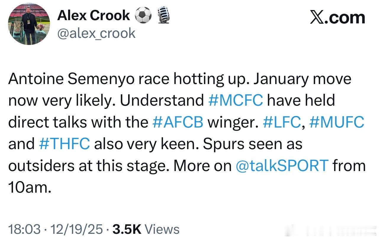 目前来看塞梅约冬窗转会的可能性已经很大了,曼城方面已经和塞梅约这边直接接触了。曼联利物浦和热刺也对球员感兴趣,但现在热刺在竞争中处于劣势了。