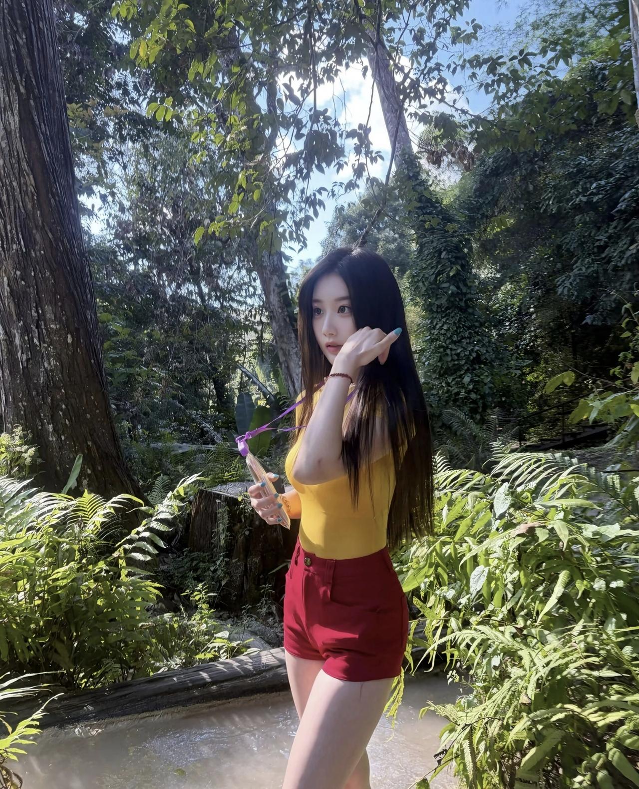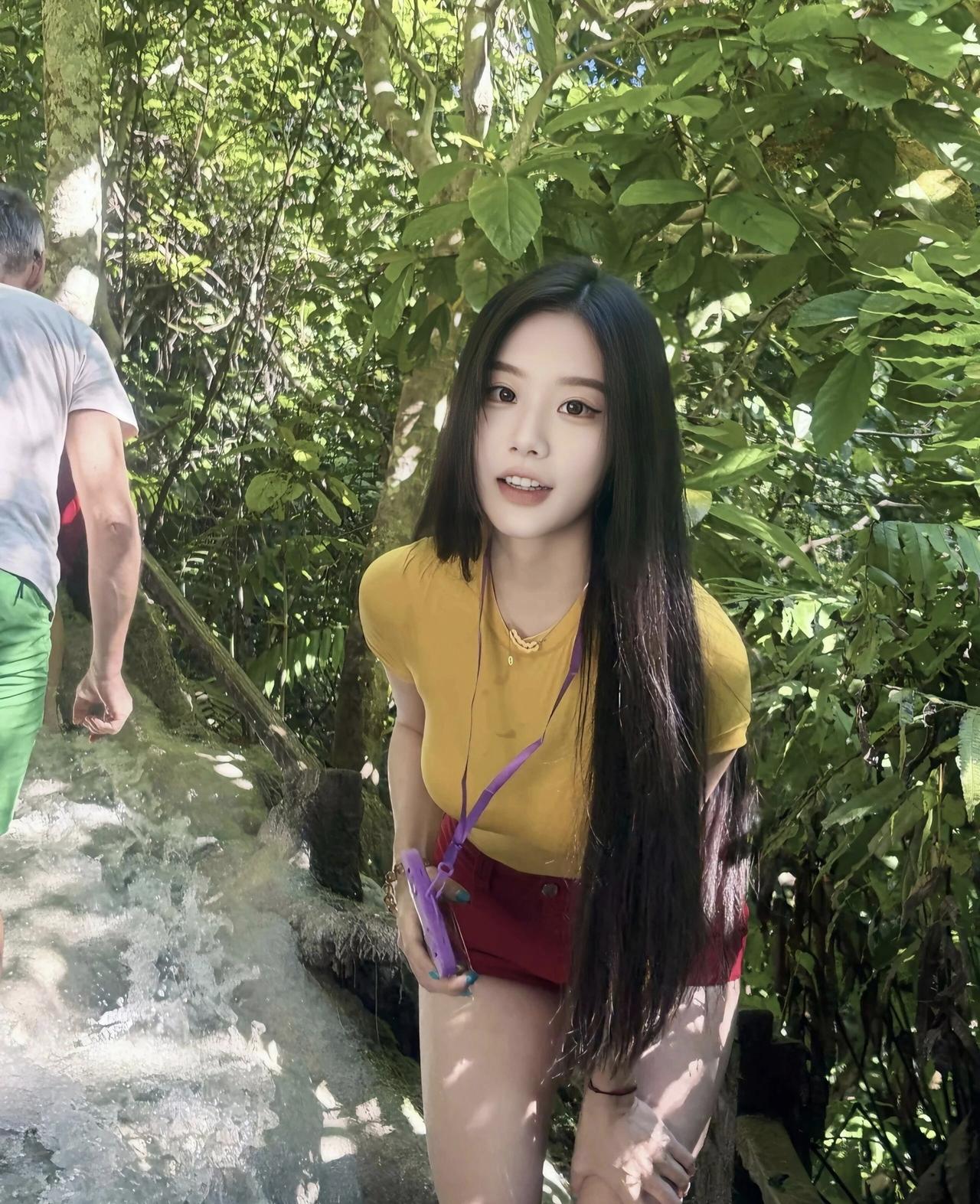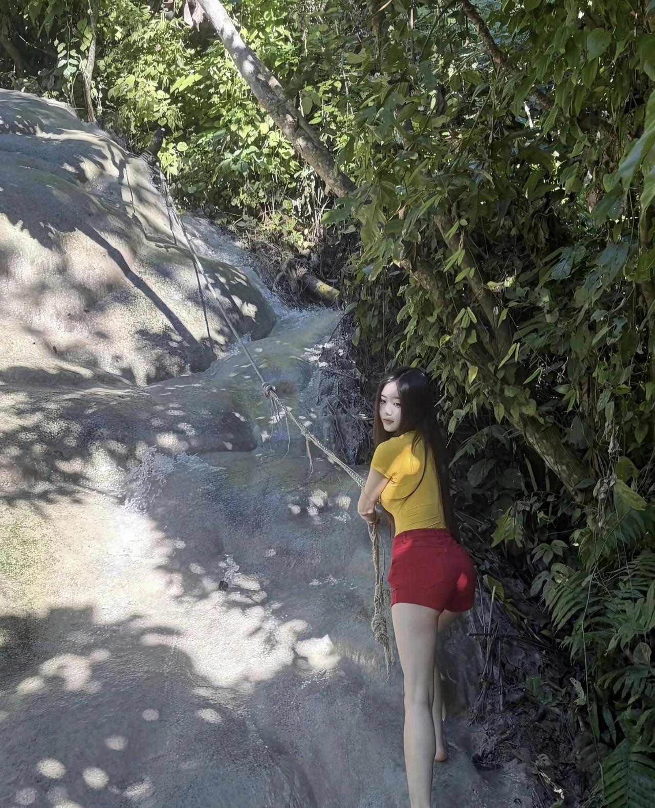 红衫撞进满目的绿意里,风撩动发丝时,连笑意都染上了林间的温柔,在自然的怀抱里,把
