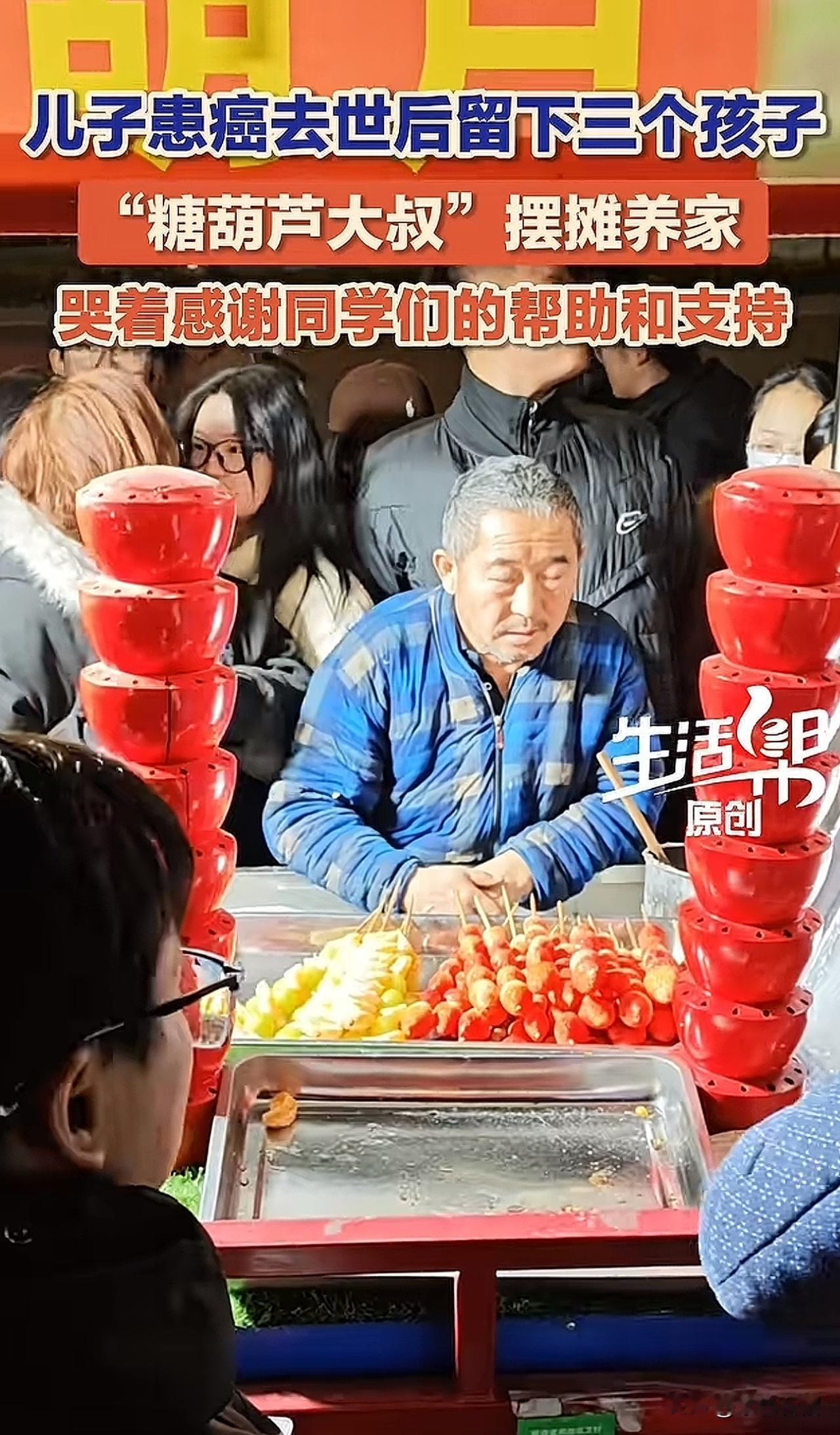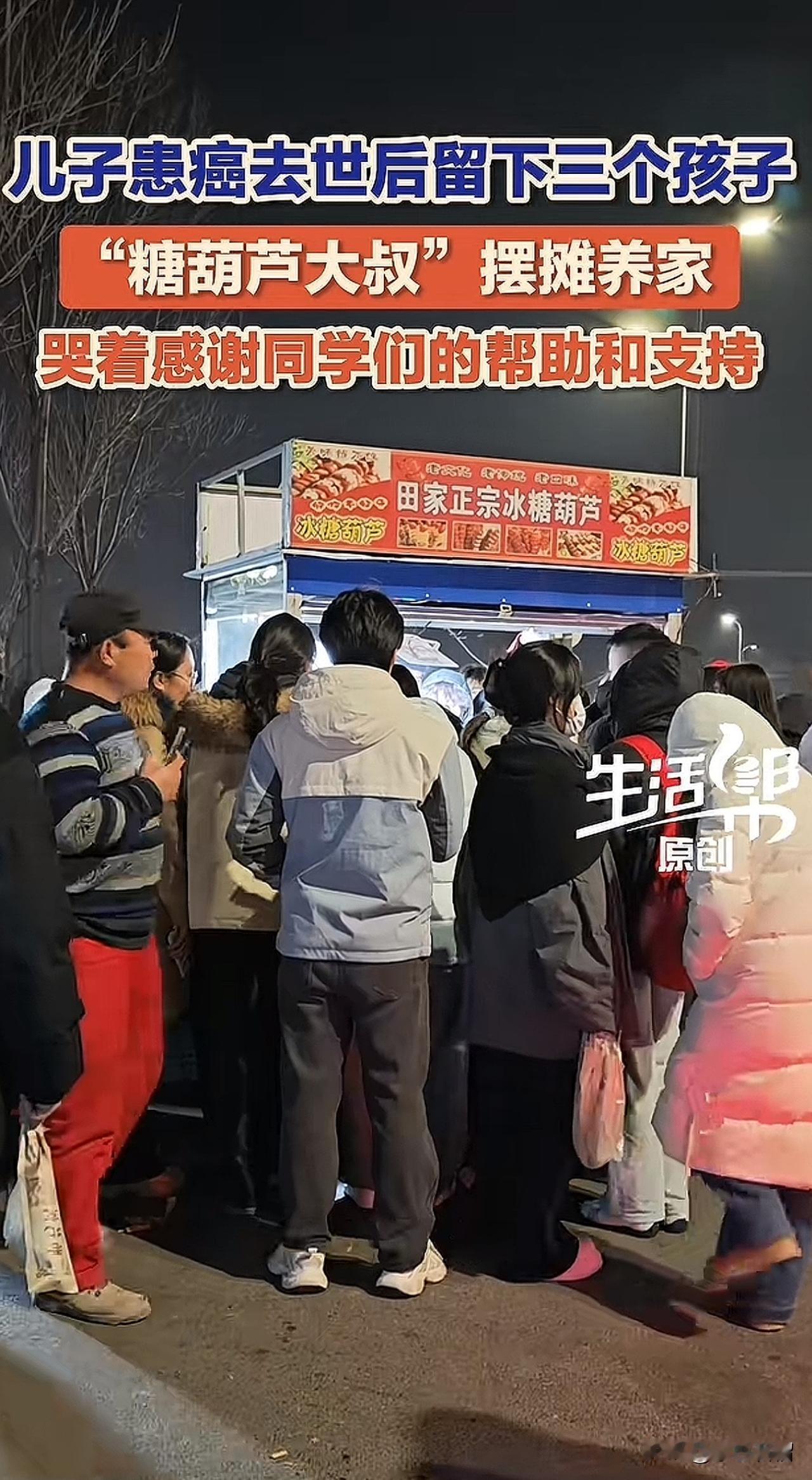 看得我热泪盈眶! 山东的田大爷在山东石油化工学院门口售卖糖葫芦。谁能料到,几个月前,大爷的儿子得了肝癌,经过几个月的治疗,花了30多万治疗费后,12月份,大爷的儿子还是走了,家里留下三个年幼的孩子,家里还有大爷已经九旬的父母。于是,60岁的田大爷只能强忍着丧子的悲痛出摊卖糖葫芦,以此维持家庭生计。 没想到,附近的摊主得知田大爷的遭遇后发了朋友圈,附近的大学生和市民知晓后,纷纷前来支持大爷的生意,队伍一度拍了几百号人,要买糖葫芦需要等一个多小时,但是大家都安安静静等在摊位前,谁都没有离开。 有人买四串糖葫芦付了1000元,有人直接扫码付款却不取糖葫芦,还有人给大爷送来了各类生活用品和食品。当地幼儿园也为大爷的几个孙子减免了学费。 面对这些善良的人,田大爷感动得哽咽不已。他希望大家不要再给他转钱了,他想凭借自己的劳动照顾家庭、养活家人。 这个世界或许千疮百孔,但总有人伸出援手,帮忙修补。希望在大家的帮助与支持下,田大爷家的日子能渐渐好转。人间自有真情在,众人拾柴火焰高,相信大爷一家能早日走出困境! (图片来源网络)