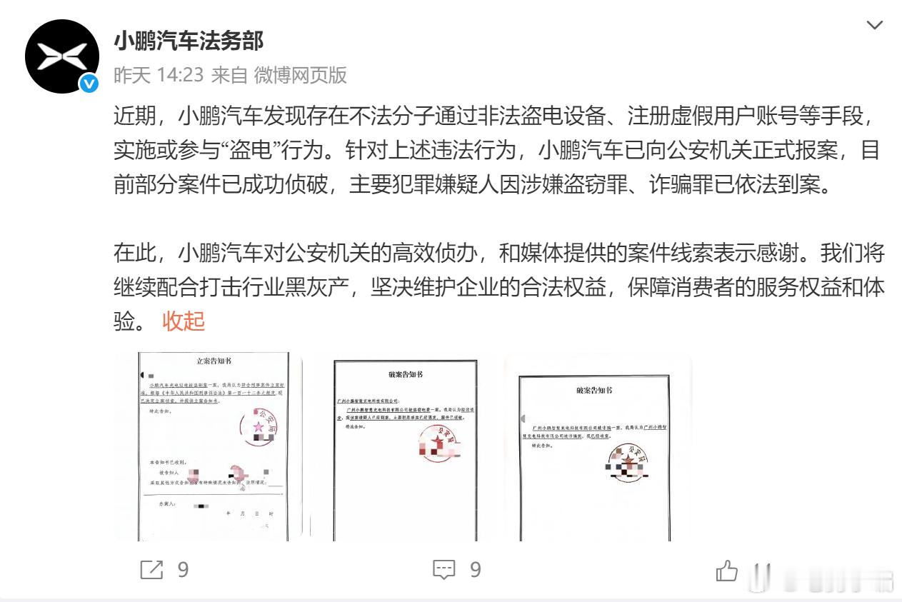 小鹏汽车遭盗电!真是世界之大无奇不有,还有偷充电桩的电的。小鹏法务部发文称,不法分子是通过非法盗电设备、注册虚假用户账号等手段,对小鹏充电站实施盗电行为。目前部分案件已成功侦破。小鹏汽车小鹏新能源汽车