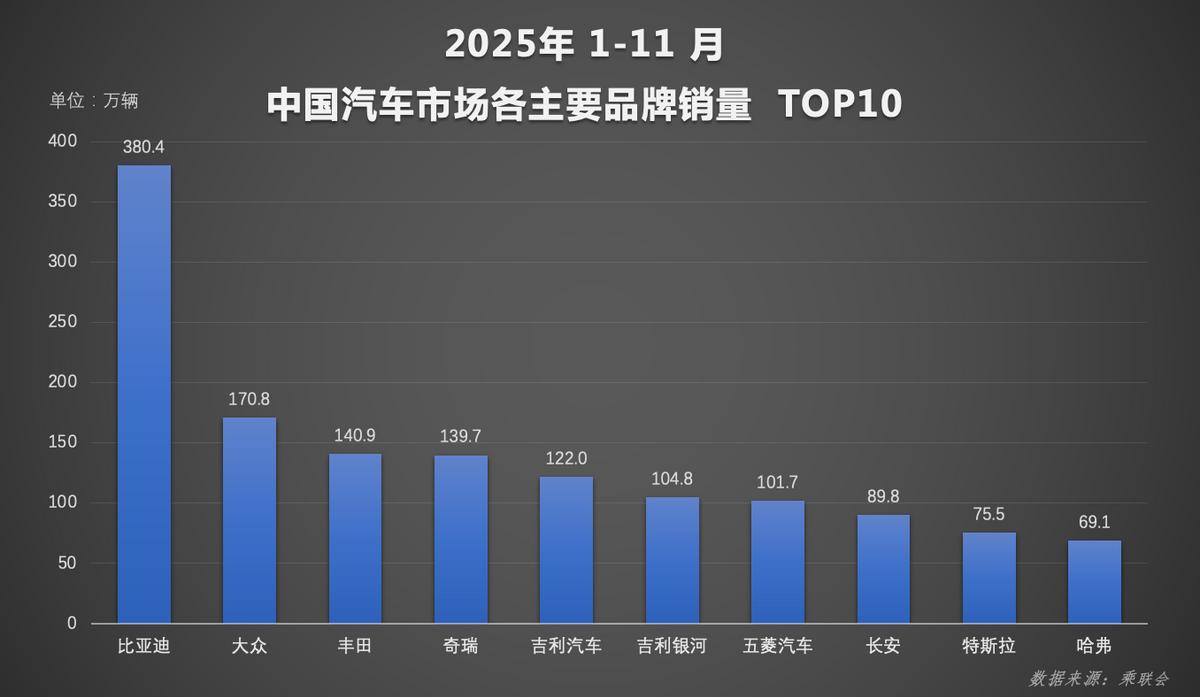 没错,说的就是比亚迪!原因是比亚迪表现亮眼持续领跑!2025年11月月销量超48万辆,前11个月累计销量418.2万辆,同比增长11.3%,年度销量目标完成率超九成!