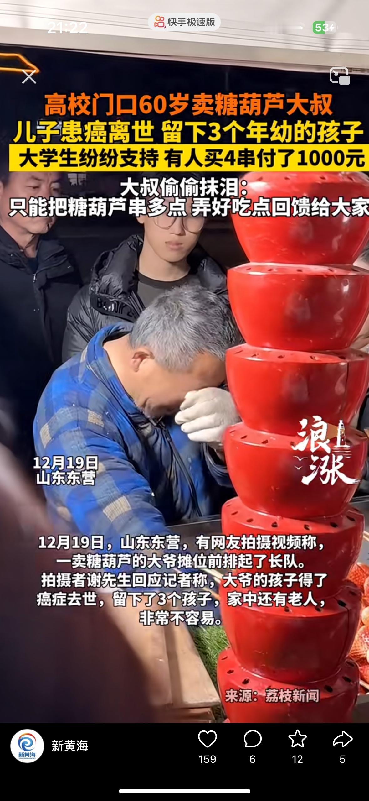 我相信大爷的眼泪一定是被同学们的真诚所感动了 一位60多岁的大爷在高校门口卖糖葫芦,那么多摊贩,唯独他的摊排起了长长的队伍 他的儿子患癌离世, 刚经历了白发人送黑发人的痛苦,又要扛起生活的重担,因为他还有3个年幼的孙子要养! 30多米的长队,同学们默默无声,却用爱为他筑起了长长的队伍,有人一次买了20多根糖葫芦,更有人买了4串糖葫芦付款1000。大学生不是多么有钱,而是他们懂得温暖他人,大爷偷偷抹泪正是真情流露,相信好人有好报,一切都会好起来的