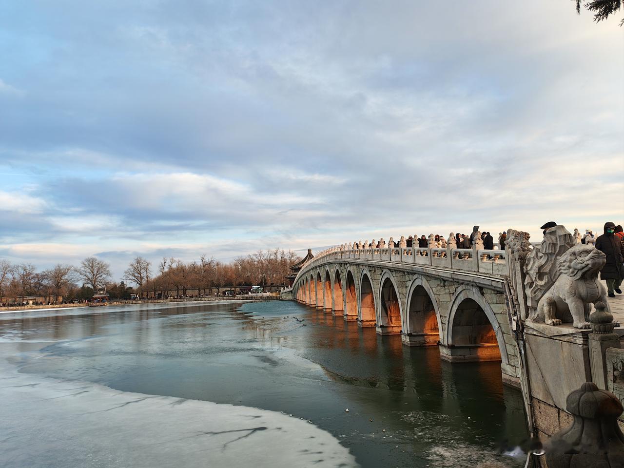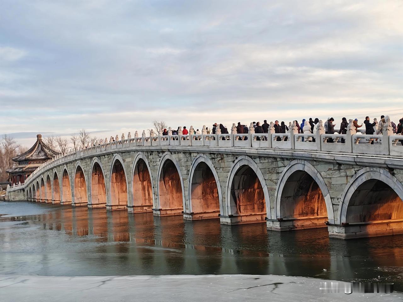 今天下午到颐和园去看金光穿十七孔桥俗称金光穿十七洞。金光穿十七孔桥是指每年冬至前