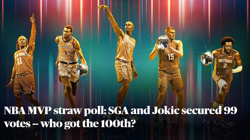 NBA赛季来到三分之一的节点,于是ESPN的蒂姆·邦坦普斯又启动了自己年复一年的工作:MVP模拟投票。还是按照老规矩,在全美找100位记者来模拟真实投票阵容,在赛季之中找几个时间节点来进行当下的模拟投票。本赛季的第一次模拟投票结果现已公布,在总计100张选票中,亚历山大和约基奇拿走了其中99张第一顺位票,剩下的唯一一票归属卢卡·东契奇。以赛季迄今球队战绩和个人发挥而言,亚历山大和约基奇将投票再次变成二人转显然在情理之中,本次投票亚历山大拿下57张第一顺位,约基奇42张,因此亚历山大总分以微弱优势占先。比较有趣的是,所有100票中,约基奇有99票在前二顺位,而亚历山大则是98票,也有少量记者没有将他们放进前二,当然这些散票基本可以视作离群数据,不影响整个调查的结论。而在剩下2/3个赛季里,其他球员要成为搅局者,说实话难度极大。哪怕坎宁安领着活塞冲到东部第一,但个人能力、比赛稳定性、高阶数据上都和两人有差距——那么拿到剩余仅有那张第一选票的卢卡,几乎是能杀进战团的唯一人选,但以东契奇之强,基础数据之华丽,却仍在各方面都处于落后。所以还是那句话,在大概率的剧情里:无论是约基奇6年4MVP,还是亚历山大连续两年冲大满贯,我们其实都在见证夸张的历史正在发生。