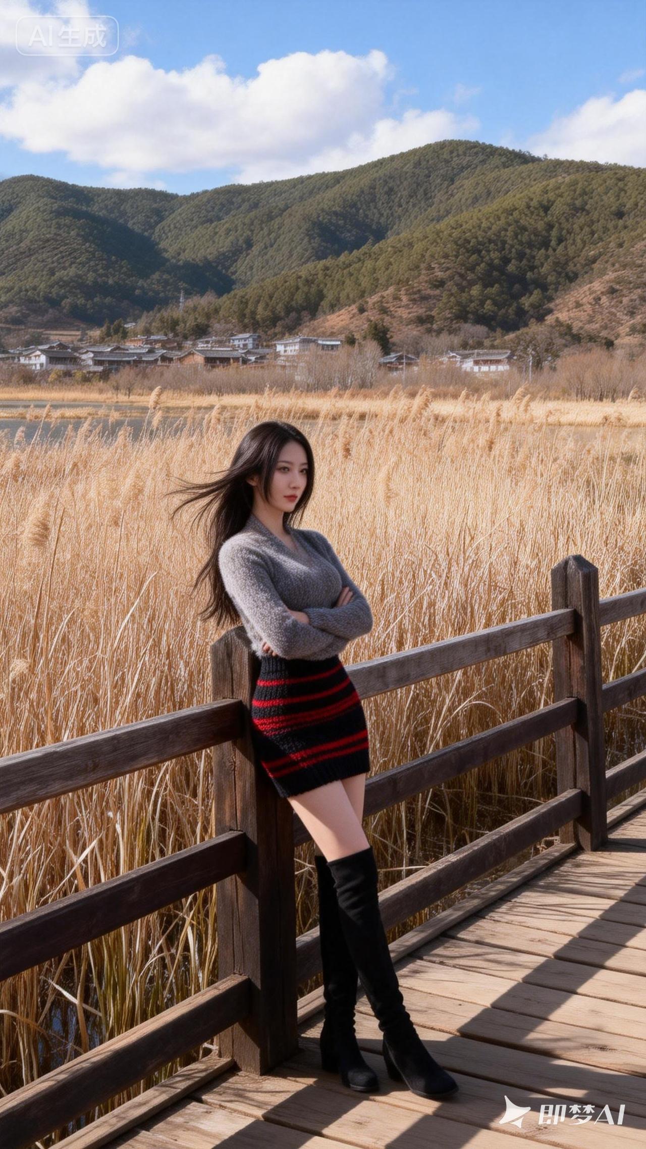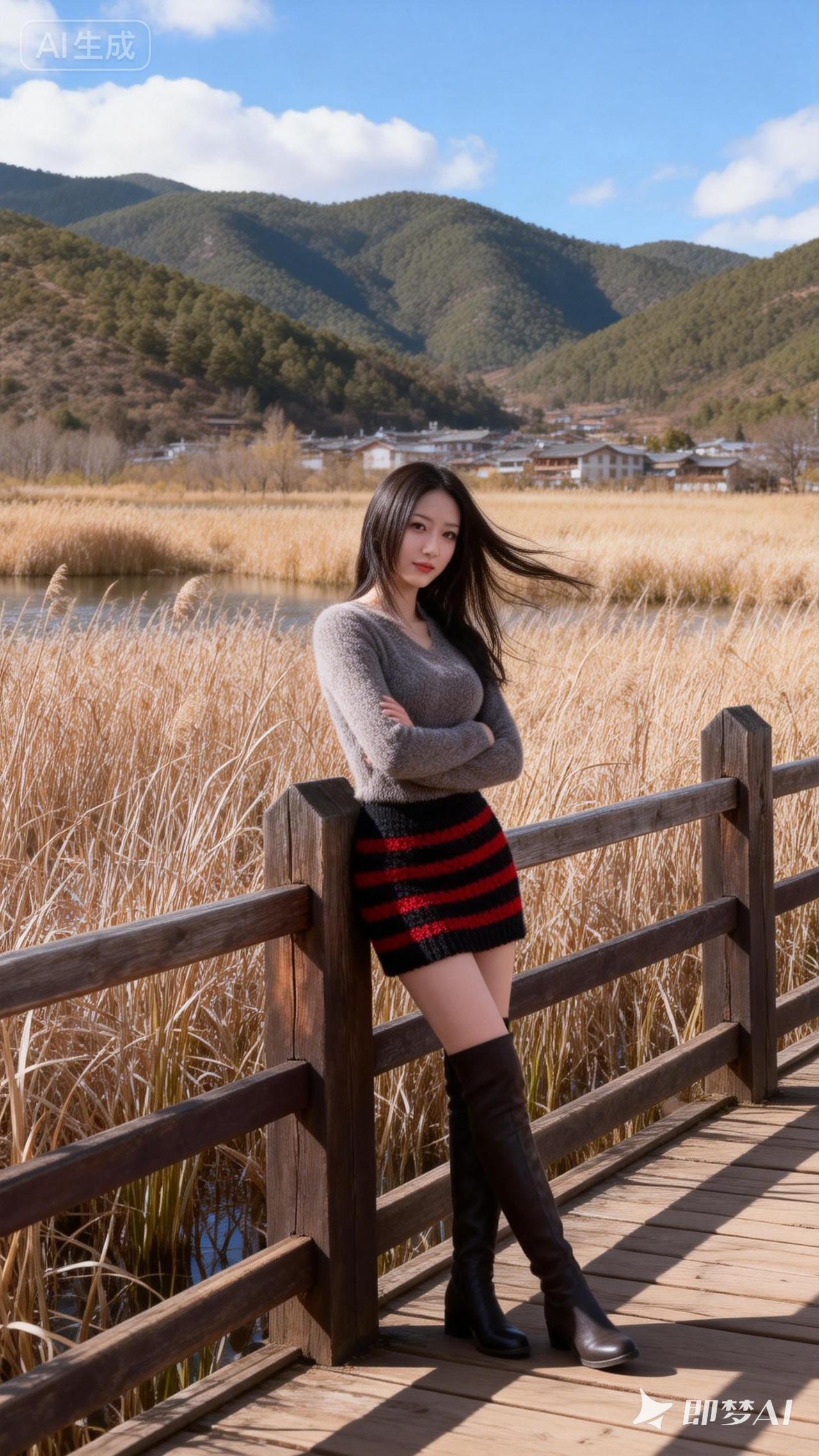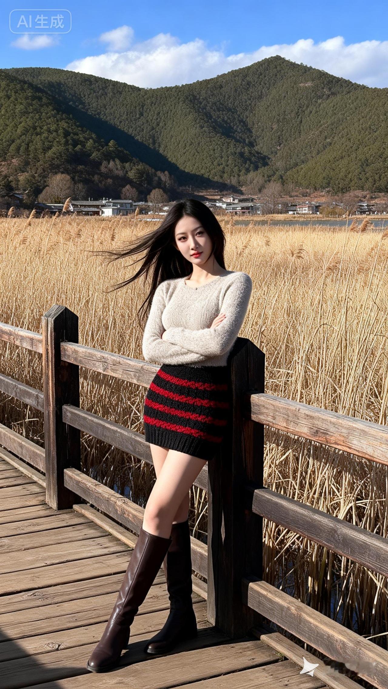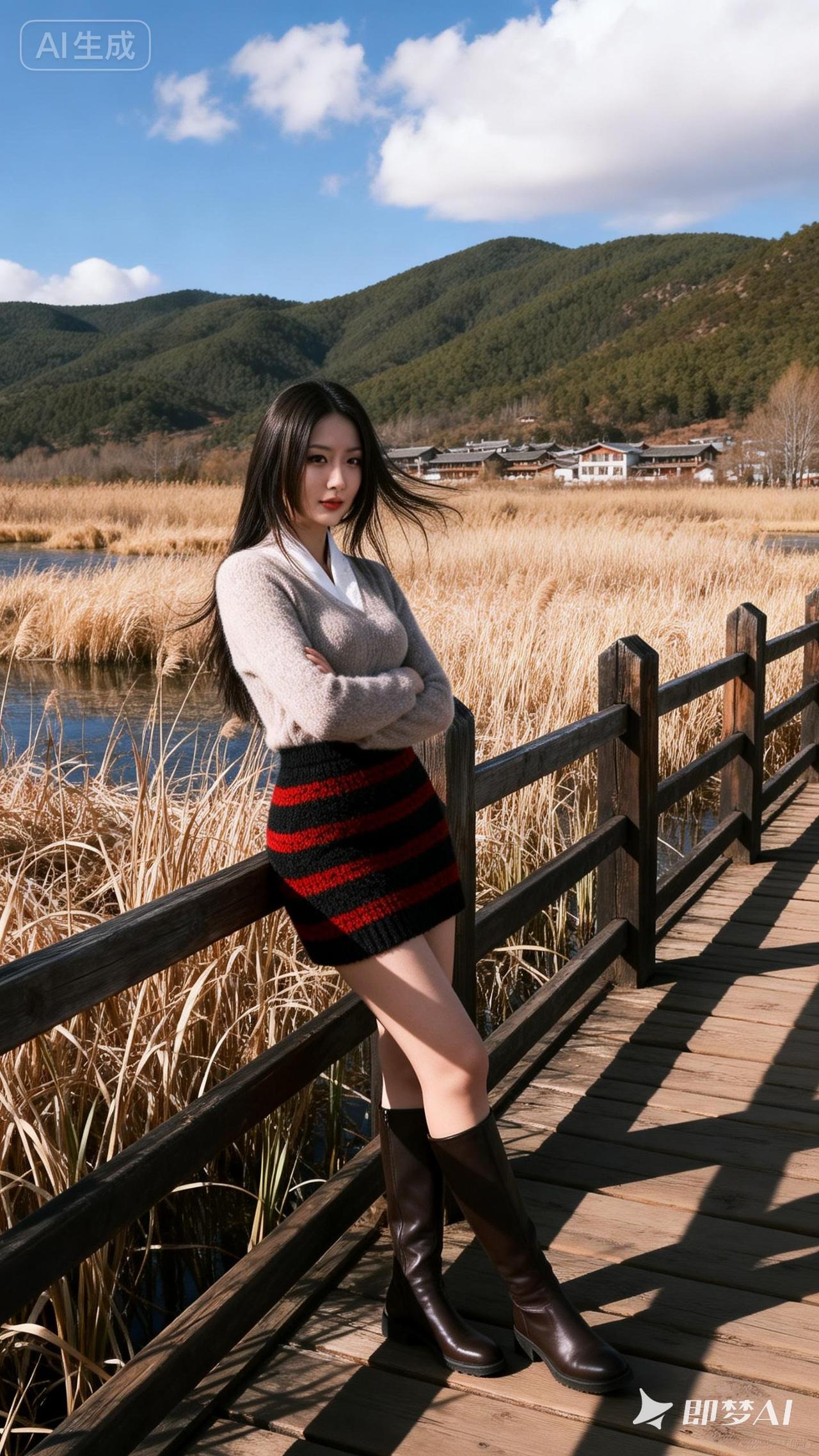 秋日暖阳下,红黑条纹裙搭配高筒靴,尽显时尚与自然之美。