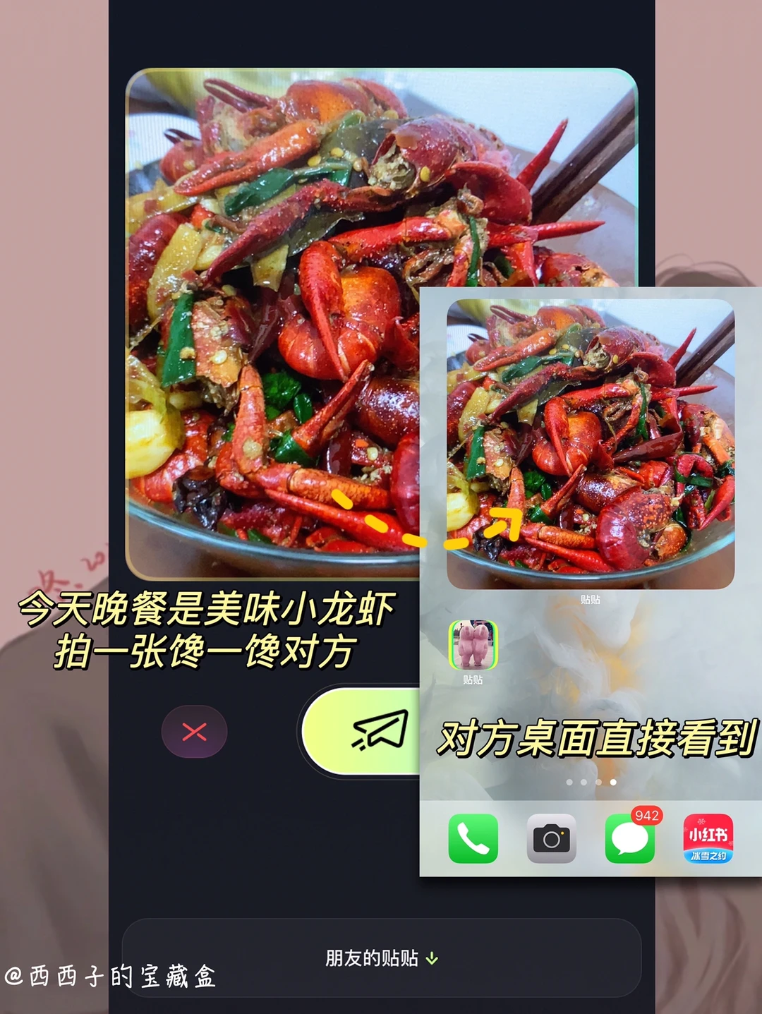 任意一方就可以通过这个小组件,把照片或视频传到对方的手机桌面,[暗中观察R]不需要打开其他APP就能直接看到~~