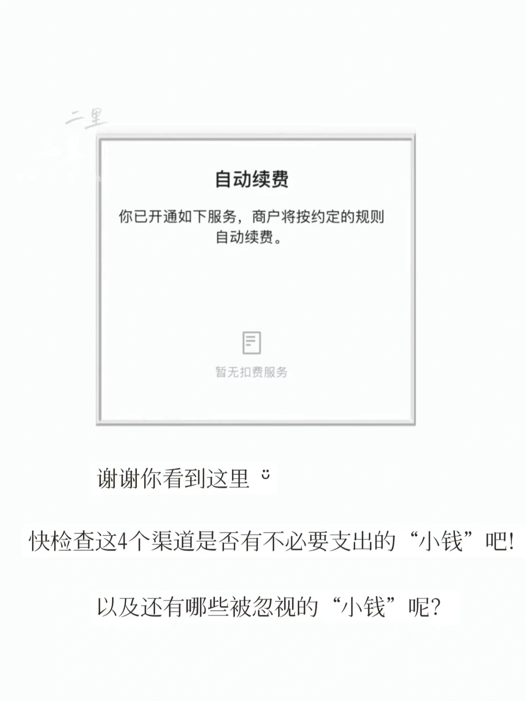 前两天的分享提到,不忽视每一笔小钱。不再看的视频会员、鲜少用的付费APP、不需要的短信服务等。 整理了手机上常见的,4个自动续费、扣款的渠道,快按图检查你的手机看看吧! ▪️ 微信支付 ▪️ 支付宝 ▪️ 银行卡 ▪️ 手机订阅 积少成多,聚沙成塔。开始存钱,理性消费,从不忽视每一笔“小钱”开始。 🌿🌿🌿 简单生活 |持续学习 |悦己爱人 记录在这 分享给你 ✐二里 ᵕ̈