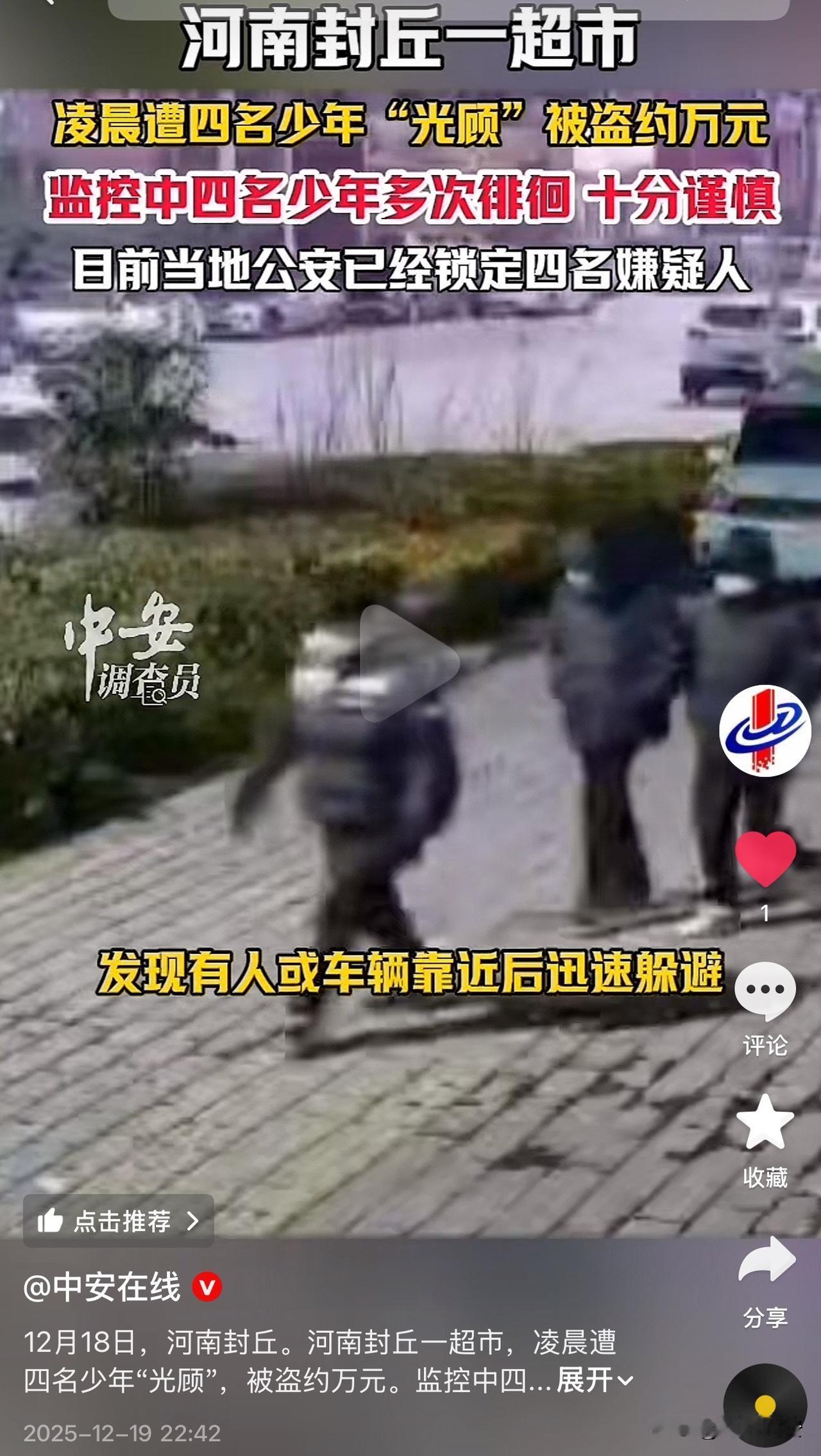 近日,河南封丘一超市遭到几名少年的“夜袭”,偷走的金额约万元。监控中发现这几名少年行为十分谨慎,多次徘徊后才实施行动。目前,警方已锁定这几名少年。 监控显示,当晚凌晨,几名少年在超市周围鬼鬼祟祟的东看西看,疑似进行踩点。发现有人经过或者车辆靠近后,他们迅速蹲在绿植旁躲避。 待无人后,他们快速跑到店门口,开始破门,门被打开后,没有第一时间进入,而是再一次跑到旁边,观察是否有人从超市出来。 他们发现超市没人后,立刻跑到店内,直接来到收银台“搜刮”一番,被盗约万元。 超市老板看到这一幕,真是气坏了,入室盗窃的行为太恶劣,他直接报了警。 看完视频不得不感慨,这几个少年真是太猖狂了,看他们从开始的踩点到后面的偷窃,全程谨慎迅速,感觉不像是第一次干这种事。 他们虽然是未成年,但是团伙作案,危害不小,必须得严惩! 俗话说,小时偷针,大时偷金。他们偷盗金额较大,已经触碰法律底线,即便是未成年,也不能算了,一定要让他们为自己的行为付出代价,让他们好好长长教训! 养不教父之过。几名少年深更半夜不睡觉,净干些不光彩的事,这属于家长教育不到位,失职了,如若不及时干预,那么以后,有可能会铸成更大的错误!