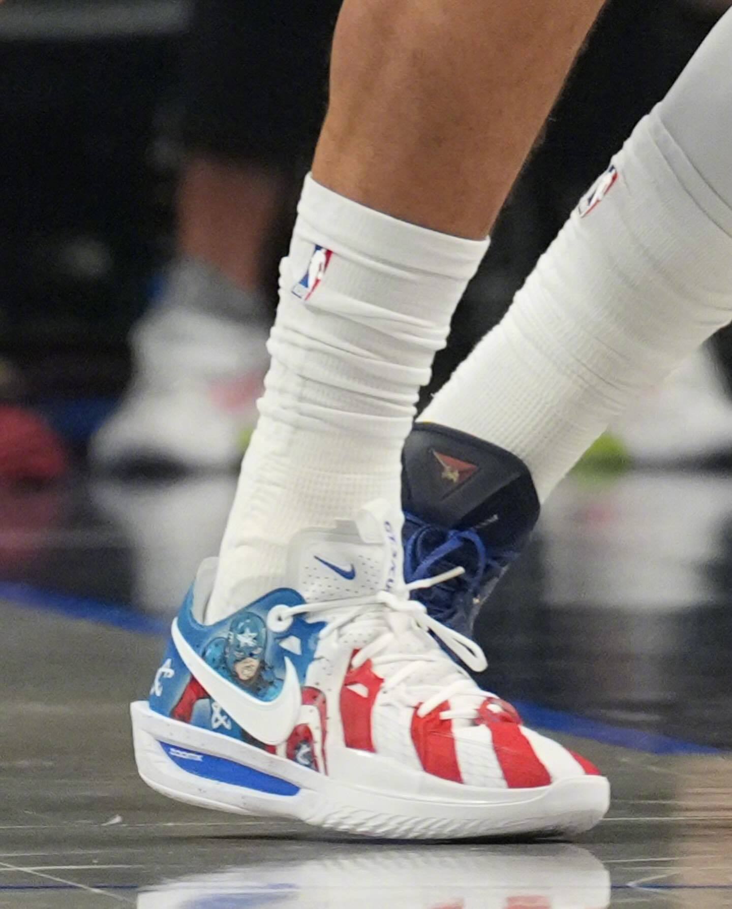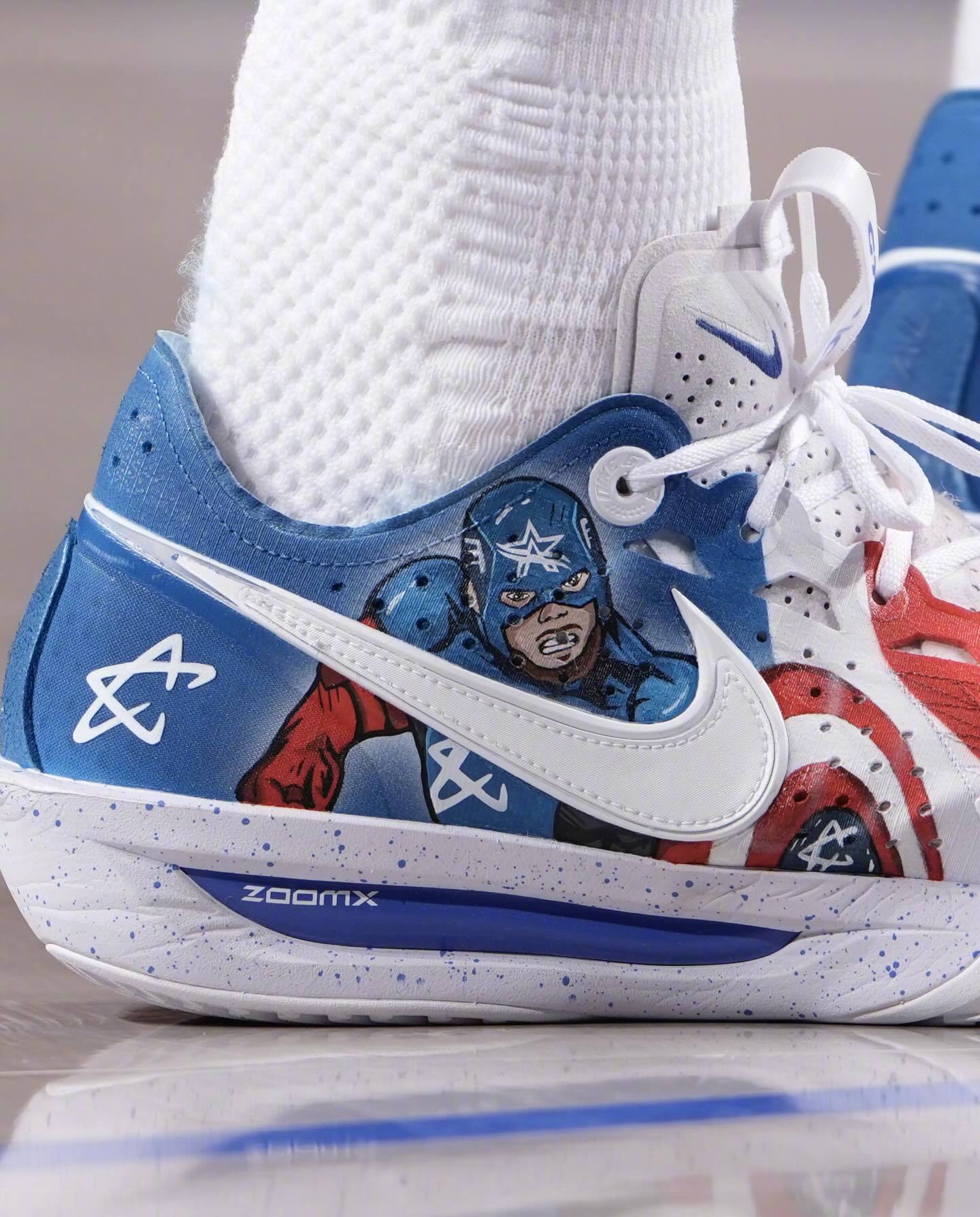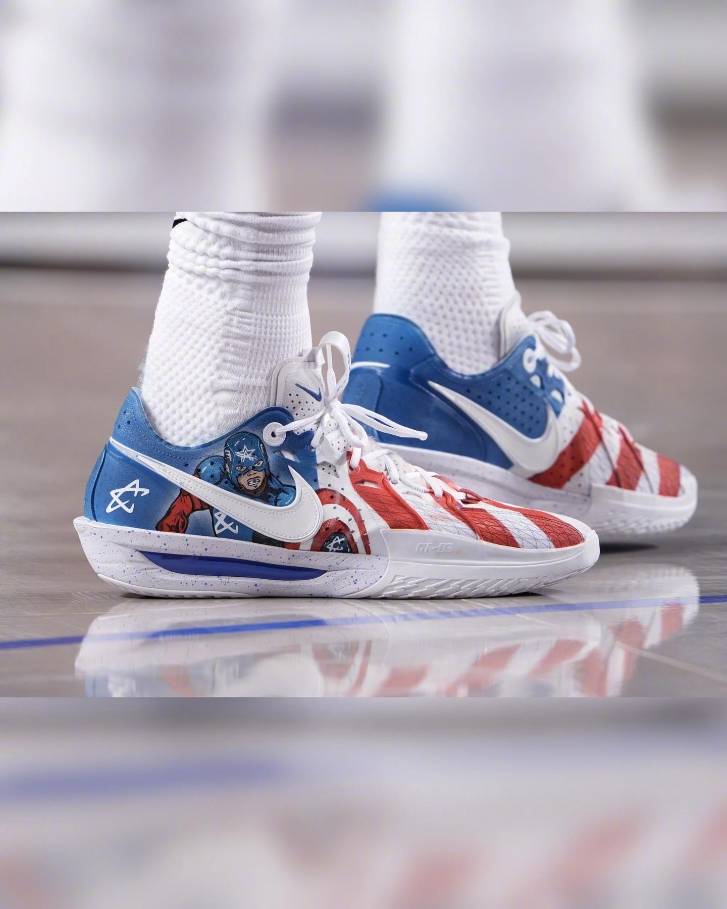 今天康宁汉姆穿的客制版本Nike GT Cut 3 PE,在美国队长主题基础上,将个人Logo融入到了美队的形象当中。