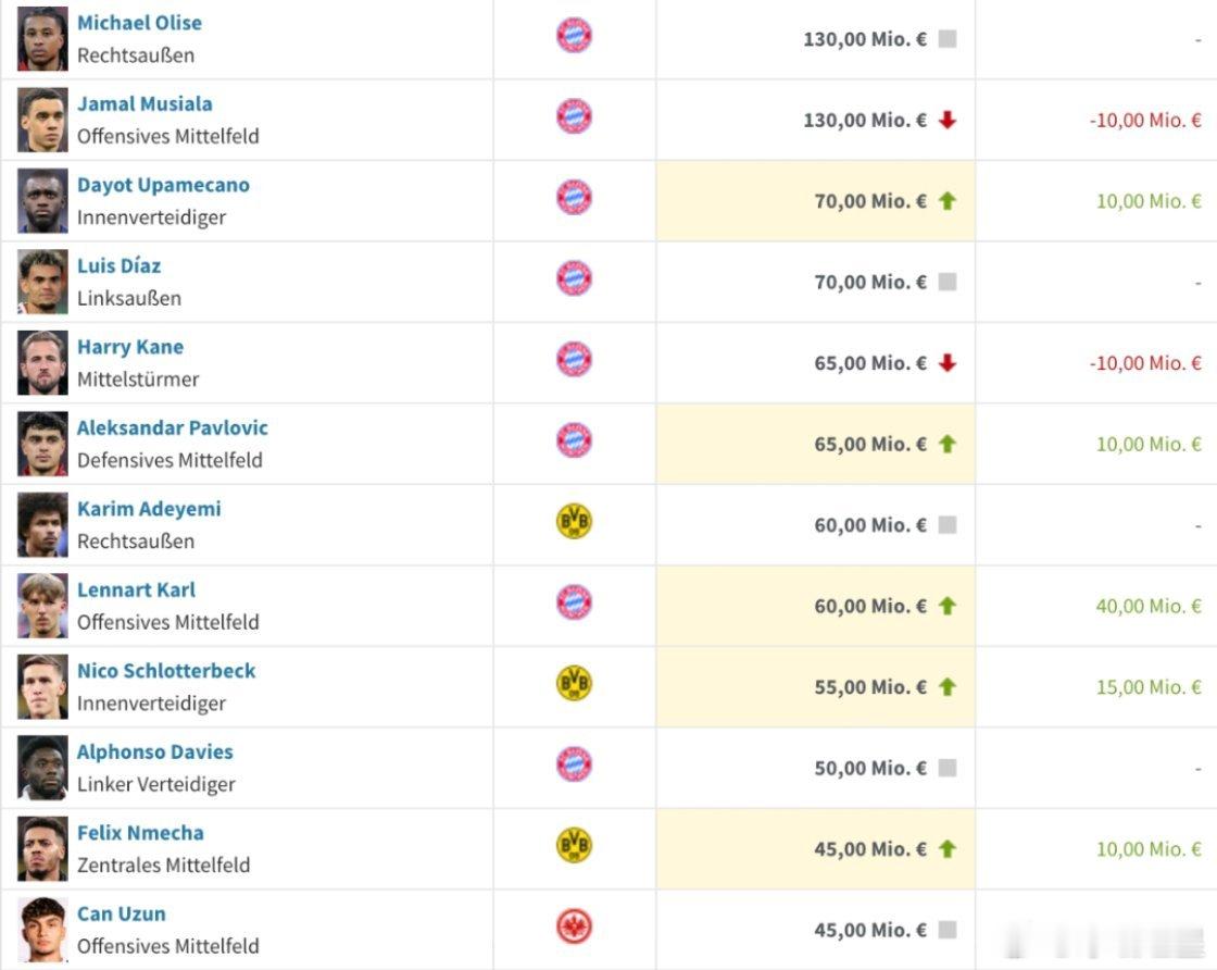 德甲最新身价:17岁小将卡尔暴涨至6000万,凯恩跌至6500万 德国转会市场网日前更新了德甲联赛最新身价,17岁拜仁小将卡尔身价暴涨至6000万欧,哈里·凯恩身价下降1000万欧至6500万欧,穆西亚拉因伤病下降1000万欧至1.3亿欧。