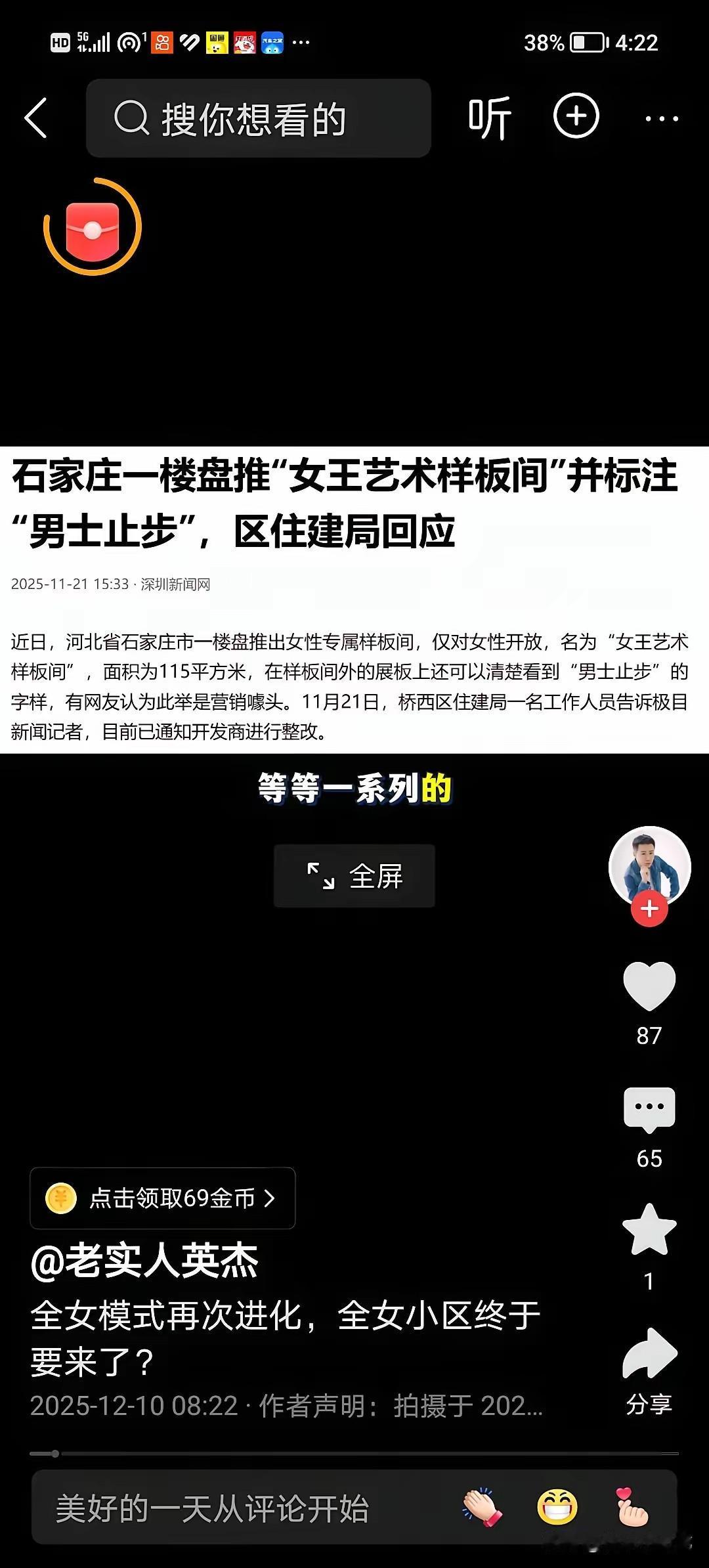 被整顿了!石家庄打响全女小区首炮,​该楼盘高调打出“男士止步”的招牌,广告宣称众多女性来看房,实际上只有3位女性预约看房。房产管理局知道此事后,勒令其整改。 石家庄有个新楼盘,为了卖房子真是瞎琢磨。直接挂个“男士止步”的牌子,还拍短视频雇人装热闹,说好多女的抢着买,结果真预约看房的就3个人,靠噱头博眼球,一点都不实在。 买房过日子,说句大白话,不少家里还是男人经济上扛得多点。不是说女的没本事,也不是贬低谁,就是咱们身边能看到的现实——很多时候买房的主要经济支撑是男性,楼盘连这都不管,纯属瞎折腾。 女的想住得安全、清净,这想法太正常了。但靠不让男的进这种办法实现,就太偏了,明显是在挑动性别对立。买房看的是地段好不好、配套全不全、价格合不合理,谁会因为一句“男士止步”就忽略房子本身的好坏啊? 我身边不管男的女的,买房都先看这些实在的,没人愿意为这种没用的噱头买单。网友们也都在吐槽,说好好的房子不卖,偏搞这些歪门邪道,除了惹争议,一点用都没有。 房管局让他们整改,真是太对了。做生意、卖房子都得守规矩,不能为了流量就搞性别对立,还无视市场情况。炒噱头当不了饭吃,实实在在做产品、尊重每个人,才能长久。 各位读者你们怎么看?欢迎在评论区讨论。