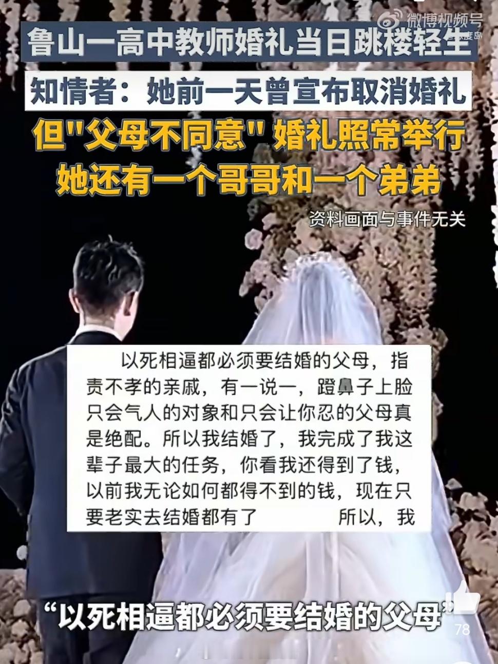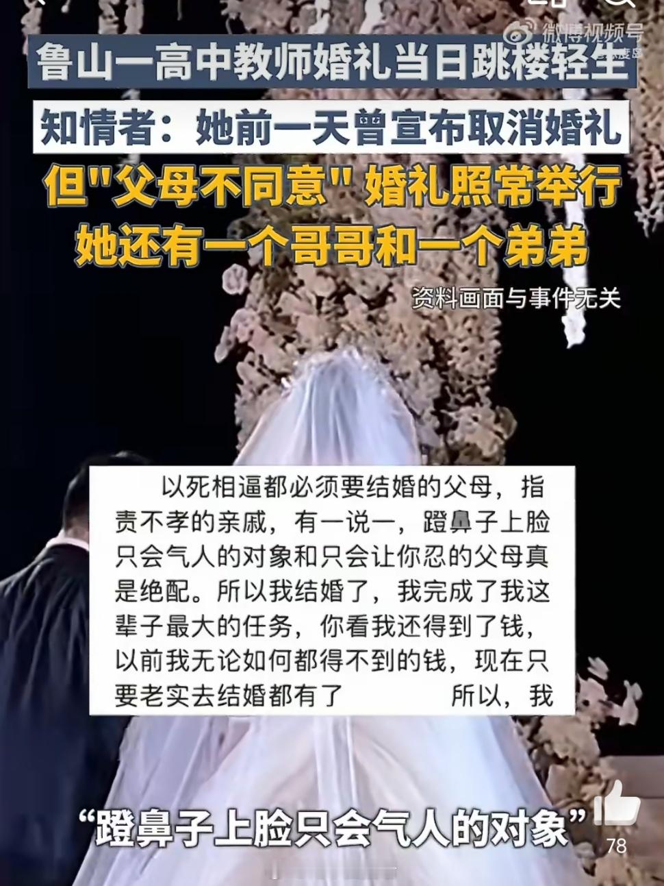 河南女教师新婚日自杀女教师的离世,撕开了“催婚”背后的精神困境。从朋友圈的恐惧独白到婚礼上的决绝之举,她的痛苦早已显露,却未被真正看见。优秀的职业履历下,是长期压抑的心理压力,而“抑郁症”的猜测更提醒我们:当代年轻人的精神负荷不应被忽视。家庭与社会不该只盯着“结婚”这一结果,更要关注个体的情绪状态与心理需求。多一份倾听、少一份逼迫,给年轻人喘息的空间,才能避免悲剧重演,让每个生命都能被温柔以待。