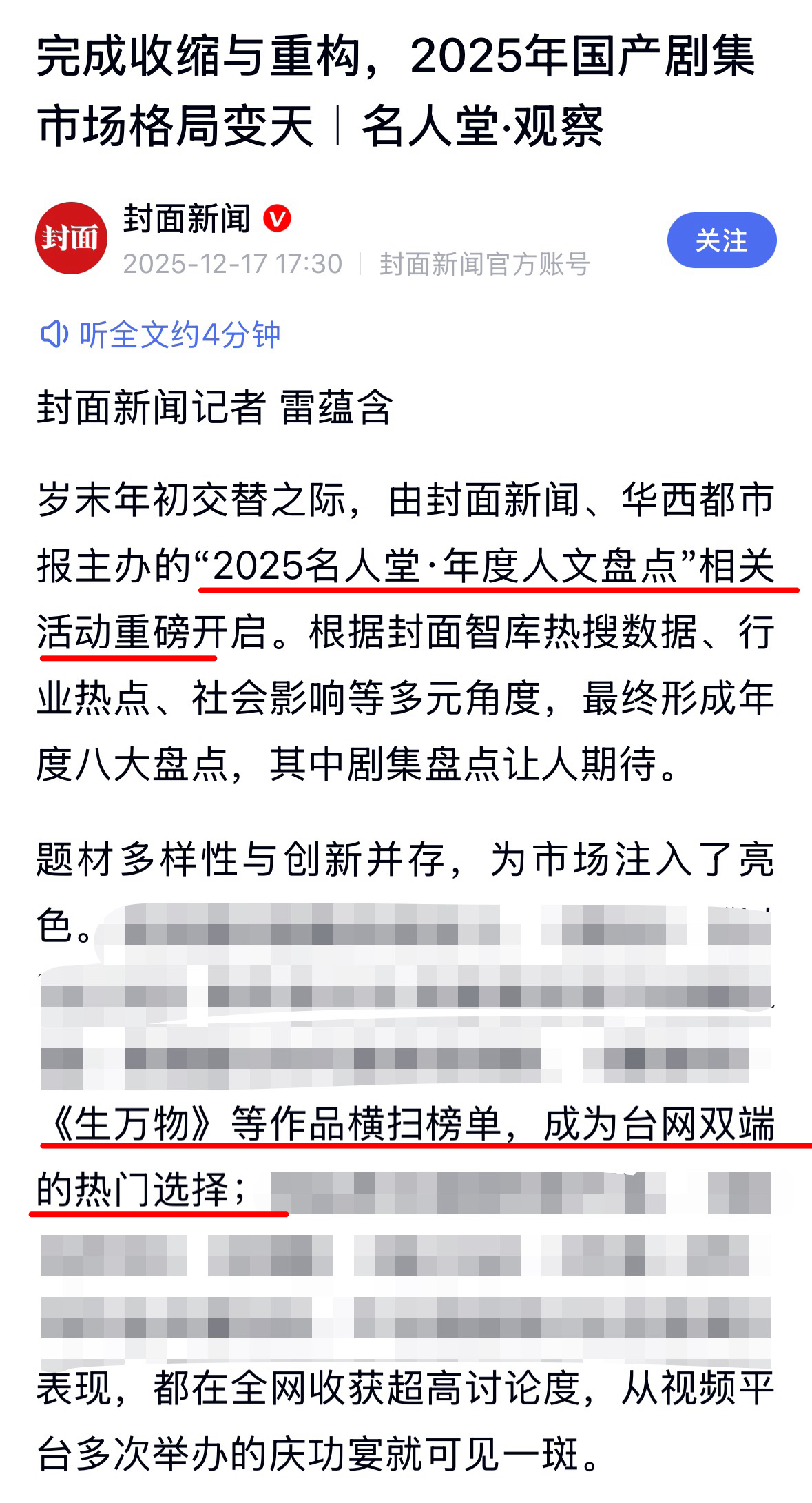 🔸新华社评 2025令人难忘的国产剧角色 提及杨幂《生万物》宁绣绣🔸封面新闻年度人文榜活动开启 剧集榜单提及《生万物》年底的评选都绕不开大爆剧和大爆角色杨幂宁绣绣