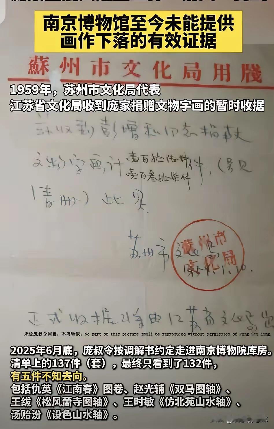 南京博物馆这次尴尬了。 估价8800万元的捐赠古画准备拍卖,被捐赠人发现了,一查才知道,自家捐赠给南京博物馆其它的4件文物也都不见了。 南京博物馆估计怎么都想不到,已经过了60多年,捐赠者后人还记得。更想不到,人家庞家还留着60多年前的捐赠票据。 60多年前,庞家把家里的宝贝捐给博物馆,就是盼着这些老物件能被好好护着,让更多人瞧见老祖宗的好东西,这份心意多实在多珍贵。 谁知道这么多年过去,那幅值8800万的古画竟然被拿去准备拍卖。要不是庞家后人偶然发现,这画指不定就流到哪儿去了。 更让人上火的是,一查发现另外四件捐出去的文物也没了踪影。博物馆觉得,过去这么久了,人家肯定早忘了这事儿,票据说不定也早丢了。哪想到庞家人这么细心,当年的票据还好好收着,白纸黑字写得明明白白,想赖都赖不掉。 博物馆本来是守护文物的地方,这么干真的太寒心了。不过好在庞家后人敢站出来较真,拿着证据讨说法,这股子劲儿特别提气。相信经过这事儿,相关机构肯定会好好整改,把文物保管的漏洞堵上,不让好心捐赠的人再寒心。 各位读者你们怎么看?欢迎在评论区讨论。