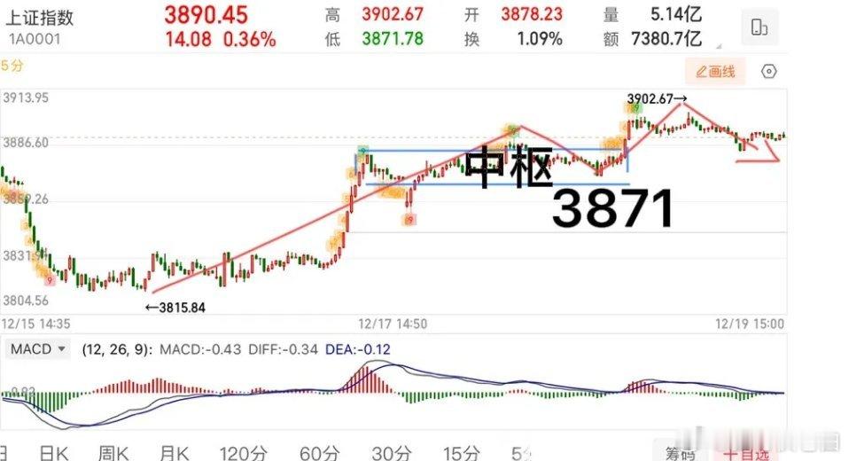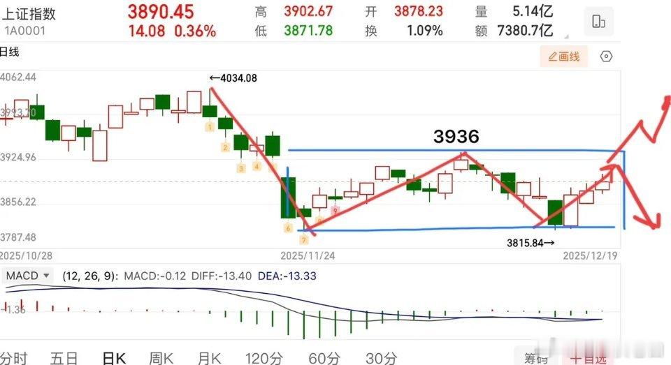 2025.12.19周五收评: 指数三连阳,但方向还未真正选择。 指数来讲,下午没有继续扩大涨幅,核心还是量没有明显放大,说明当下这个位置资金还是不愿意积极进场,说明市场还是得磨。总的来说,指数当前仍处于变盘周期当中,未真正选择方向,日/周均线粘合,还需要等市场共振icon变盘。 从结构上看,可以看作是中枢区间震荡,上轨3936,下轨3815,当前走势从3815开始的向上反弹,正往上轨3936附近靠拢,后续的关注重点👉走势分类:1.突破站稳3936出3买;2.突破不了则继续围绕中枢震荡,就还有可能再往下考验下轨支撑,图1所示。 短线来讲,图2所示,从3815开始的向上走势,当前运行小中枢内,目前来看走势还处于正常的震荡范畴,3871不破,问题就不大,还有可能继续向上往上轨3936靠拢,从均线的思路看,不破5日线还都是正常的走势。 板块上,当下主流的方向还是大消费、商业航天等,但需要注意的是大消费像零售,爆发之后会有内部分化,尽量不要去追涨,商业航天也是高位震荡分化,关键还是在于个股。 个人观点,仅供参考!