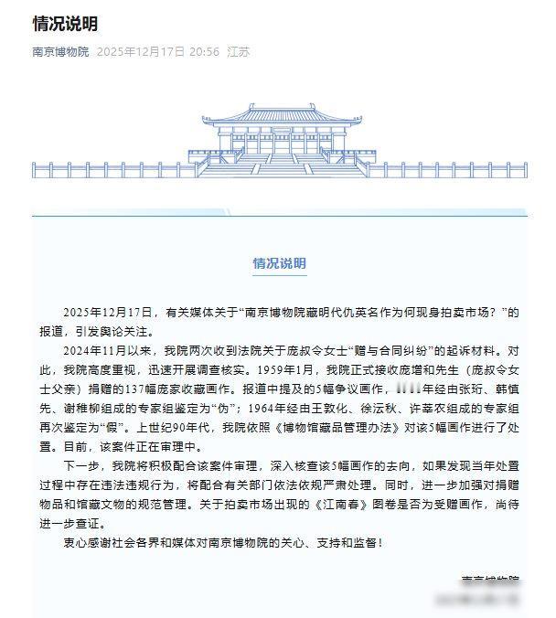 估价8800万元!捐赠给南京博物院的文物竟流至拍卖行?被捐赠者后人举报后撤拍,137件捐赠画作竟失踪5件,南京博物院发布情况说明 2025年6月,庞莱臣的曾孙女庞叔令按照法院的调解书,到南京博物院核对1959年家族捐赠的那137件古画,结果发现有5件找不到了,这里面就有仇英画的《江南春》图卷,这件事本身就很奇怪,捐出去的画,怎么会不见呢。 七月的时候,南博那边说那五件东西都是假的,早就调拨转给别处了,但就是不肯说到底给了谁,更让人想不到的是,十一月这幅画竟然出现在北京一家拍卖行的春季拍卖图录里,标价八千八百万,后来被紧急撤掉了,庞叔令直接提出质疑:你们没有通知我们鉴定结果,也没有按照规定归还给我们,反而悄悄处理掉了。 南博那边给出回应,说是在1961年和1964年都请专家做过鉴定,认定这幅画是假的,所以他们的处置方式没有问题,可是家属这边却指出,当时参加鉴定的徐沄秋,其实并不是专门研究书画的专家,而且当年的捐赠清册上清清楚楚地写着这幅画就在其中。 案子还在审理中,那幅画去了哪里呢,没有人能够说出答案。 庞叔令 南京博物院 仇英江南春 文物失踪案书画估价