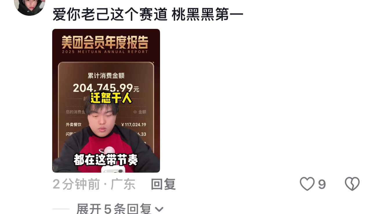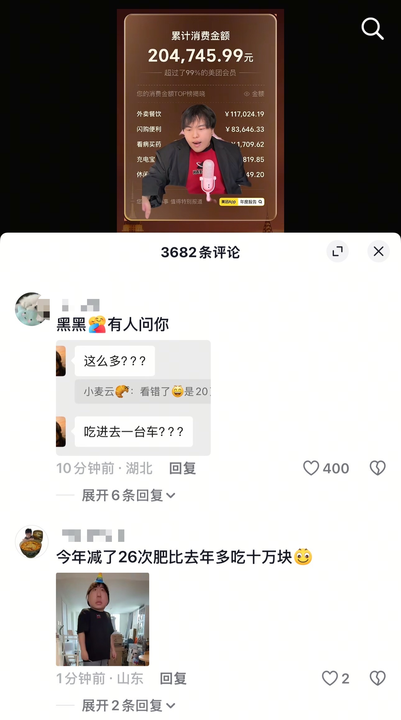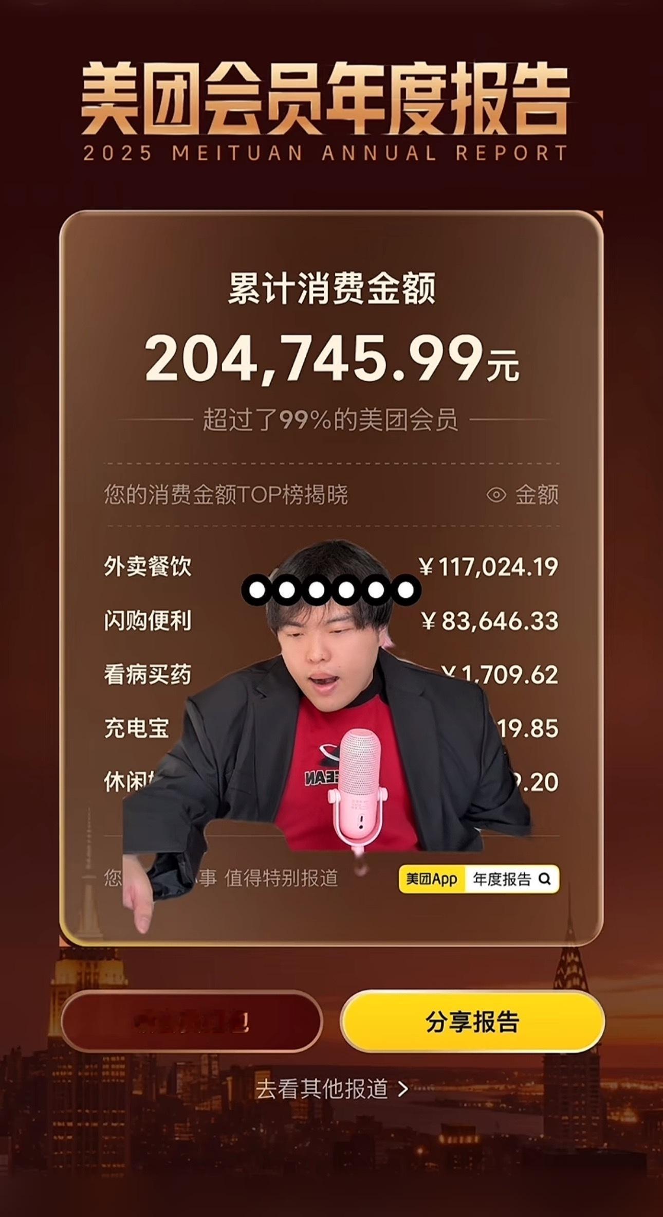 桃黑黑美团吃了20w真是太让人意内了,桃黑黑的美团年度报告总消费再创新高,伴随着高消费和高卡路里,还有桃黑黑的减肥高失败率,怎么不算是另一种三高呢?坠子哥。这就是头部博主的生活大型事故嘛?2025美团会员年度报告