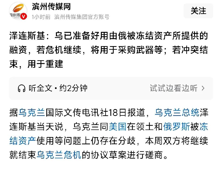 乌克兰已准备好使用被冻结的俄罗斯资产所提供的融资。泽连斯基总统表示,若乌克兰危机