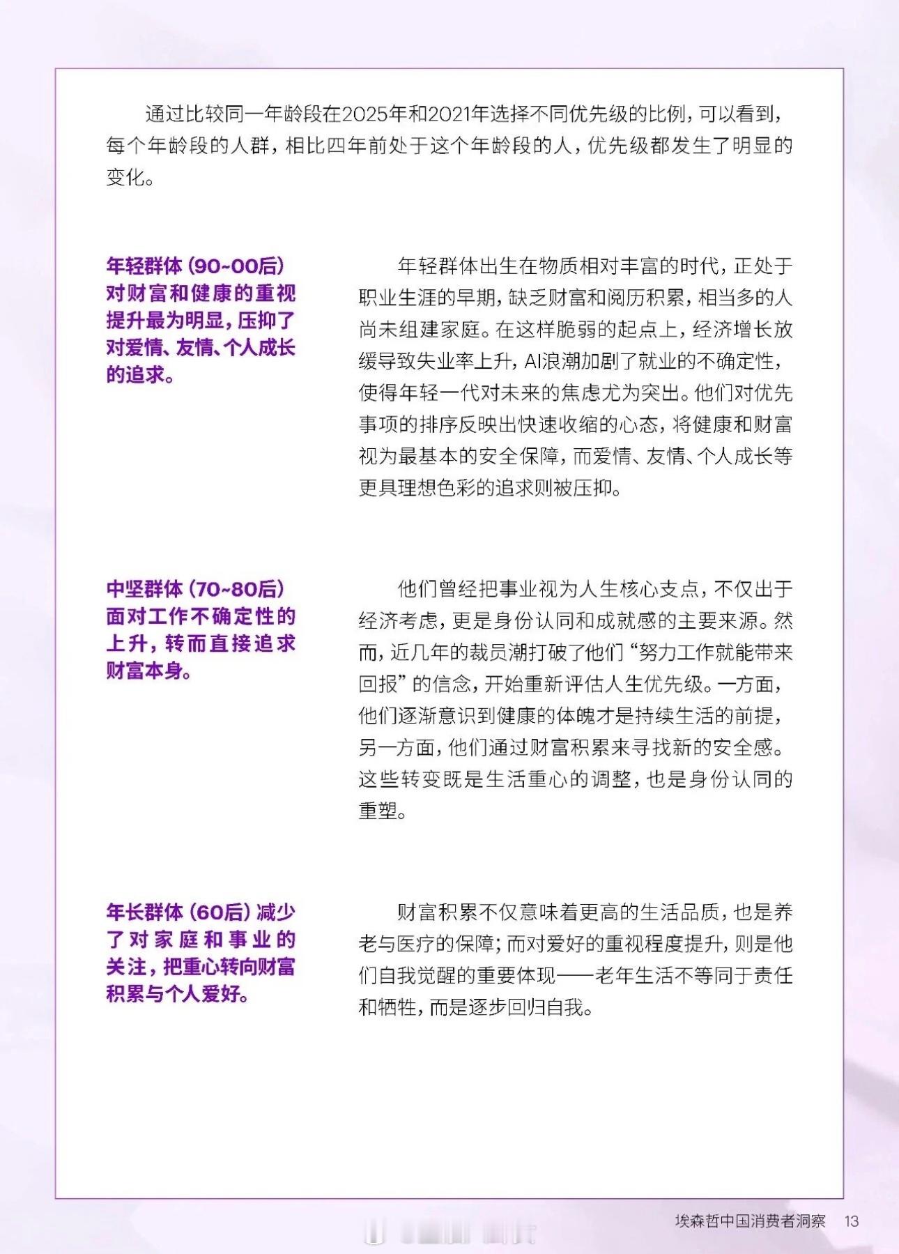 相比2021年,中国消费者对健康和财富的重视程度明显上升,对事业、爱情、成长的重视程度下降