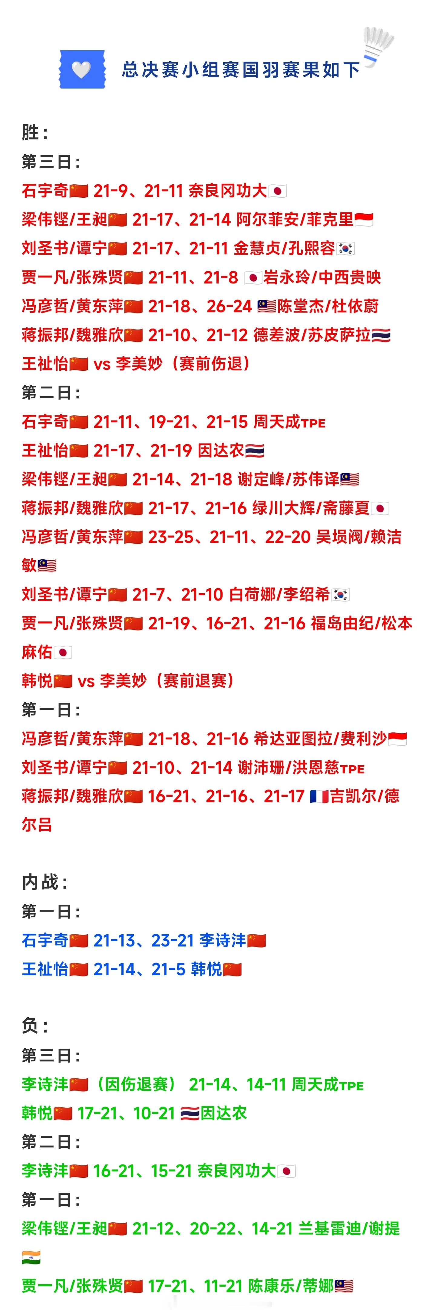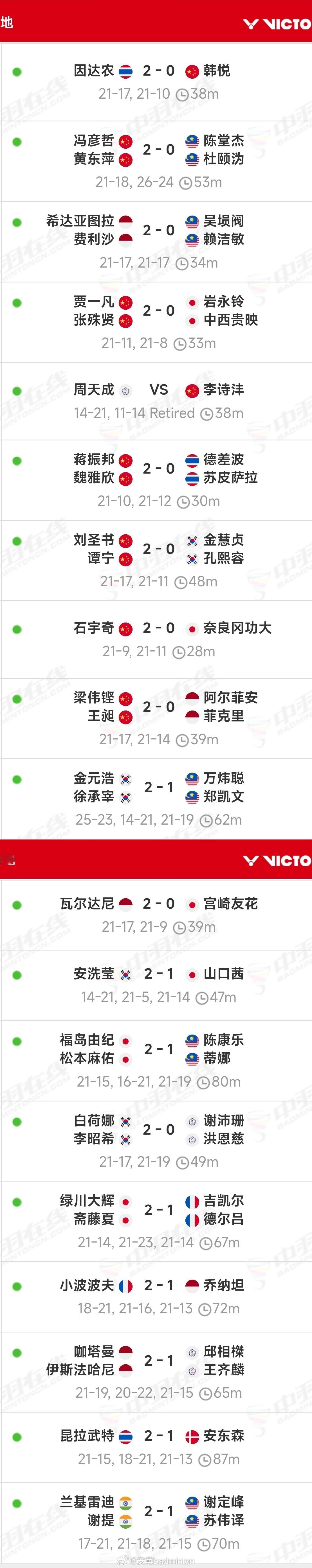 2025年世界羽联年终总决赛【半决赛】赛程(图1)|12.19日赛果(图2)|国羽小组赛赛果(图3)🟣上半场(9:30🕤开赛)1 安洗莹🇰🇷 vs 山口茜🇯🇵(16-15)2 因达农🇹🇭 vs 王祉怡🇨🇳(6-4)3 绿川大辉/斋藤夏🇯🇵 vs 冯彦哲/黄东萍🇨🇳(1-9)4 陈康乐/蒂娜🇲🇾 vs 福岛由纪/松本麻佑🇯🇵(5-2)5 小波波夫🇫🇷 vs 奈良冈功大🇯🇵(1-3)🟣下半场(17:00🕔开赛)6 蒋振邦/魏雅欣🇨🇳 vs 陈堂杰/杜颐沩🇲🇾(4-2)7 白荷娜/李绍希🇰🇷 vs 刘圣书/谭宁🇨🇳(5-6)8 昆拉武特🇹🇭 vs 石宇奇🇨🇳(3-6)9 金元浩/徐承宰🇰🇷 vs 咖塔曼/伊斯法哈尼🇮🇩(2-0)10 梁伟铿/王昶🇨🇳 vs 兰基雷迪/谢提🇮🇳(7-4)直播渠道📺:羽协公众号/央视频/优酷羽球🏸观赛聊天群:羽你一起来看球综合体育🏟️聊天群:综合体育畅聊群欢迎你的加入,一起开心^O^看球,聊球!🧧赛事抽奖福利:❶网页链接 ❷ 网页链接 ❸ 网页链接免费送!🔥梁王晋级总决赛半决赛石宇奇总决赛三连胜
