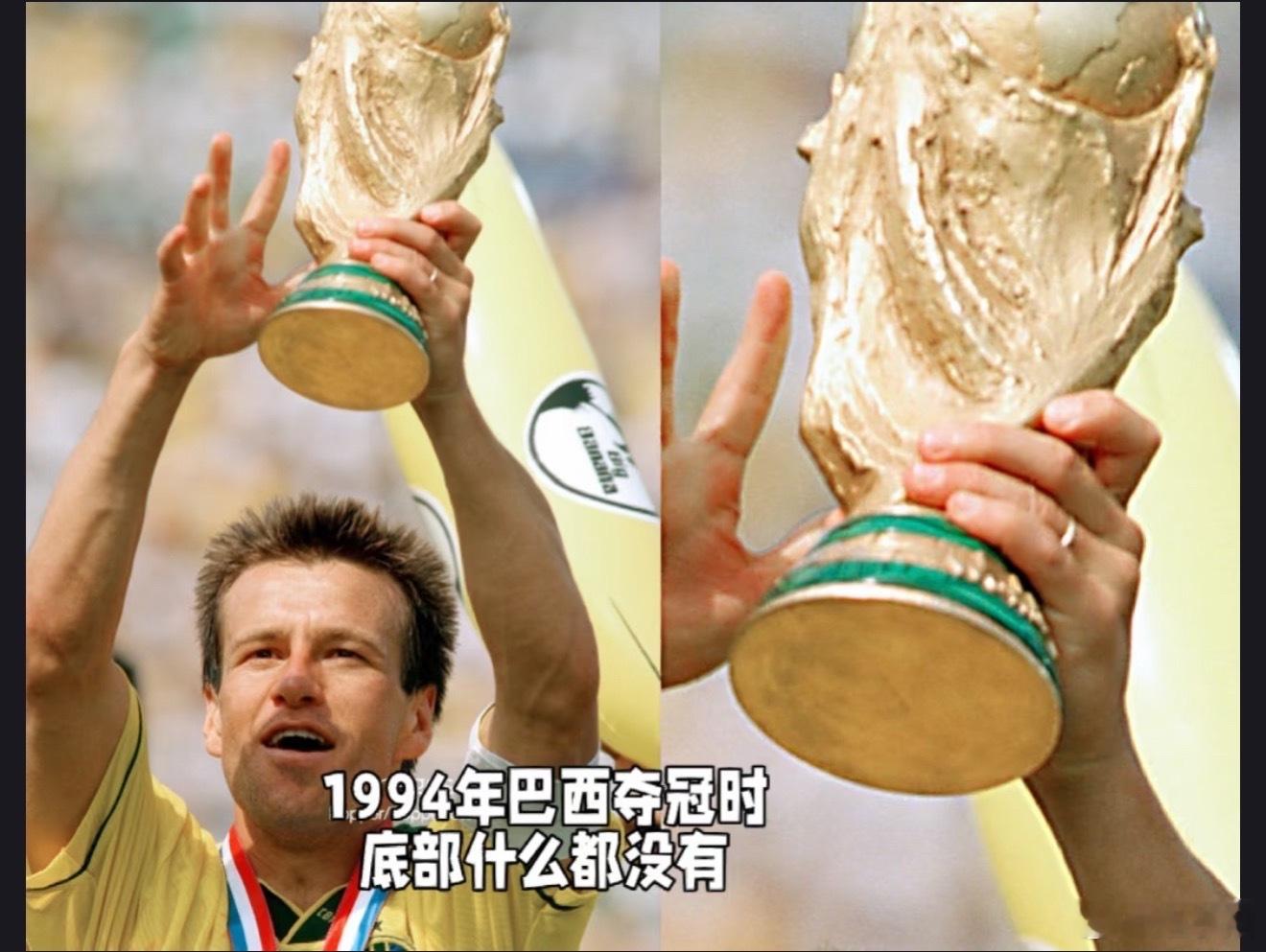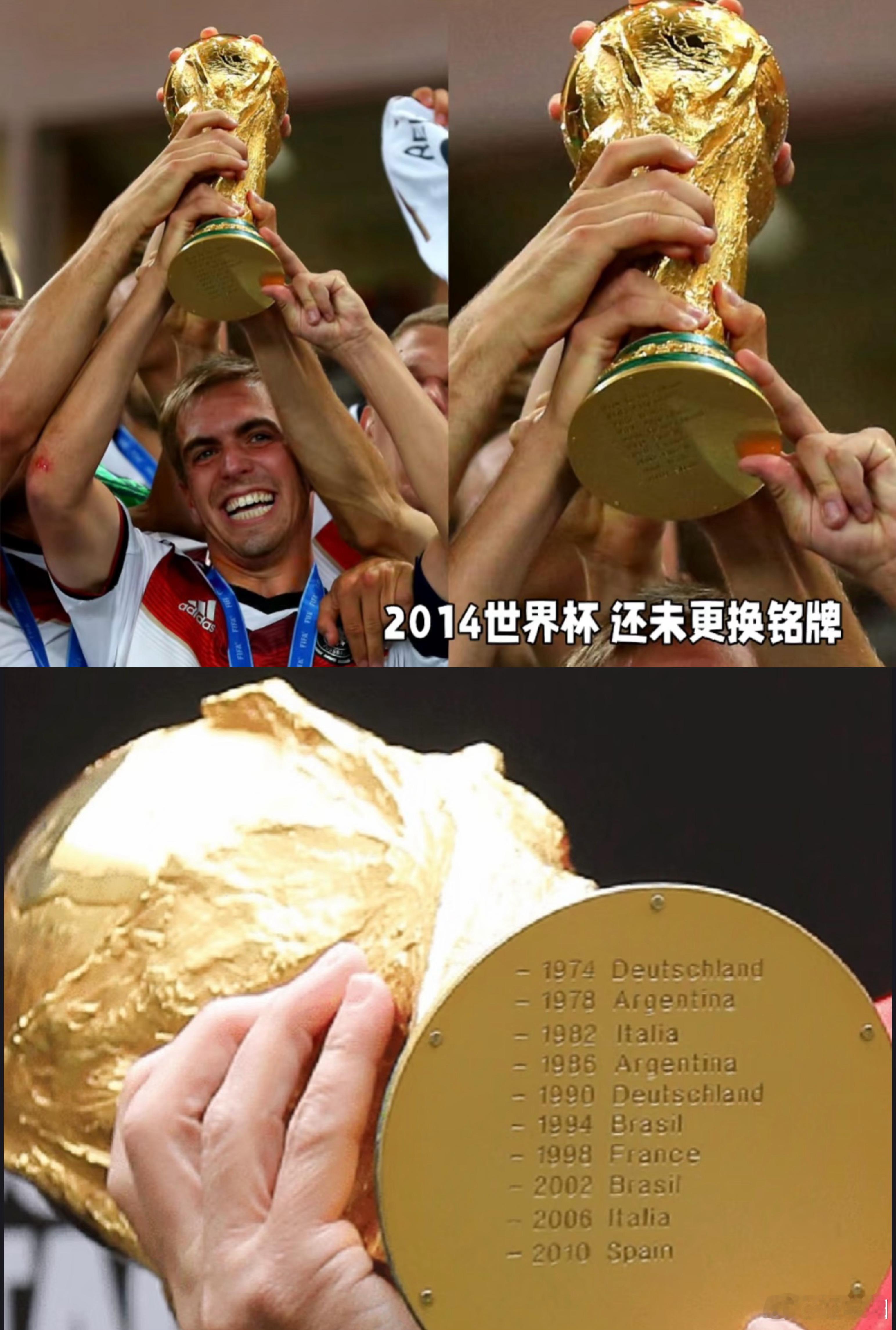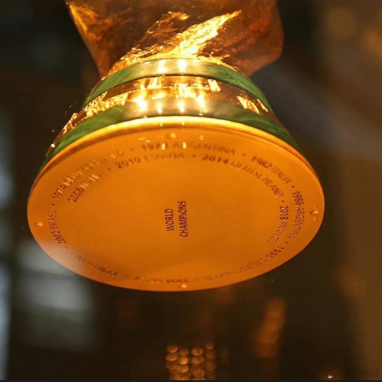 今天是 12 月 19 日,梅西社交媒体重新发布了 3 年前的这一天,他那张著名的获得 7400 万点赞的世界杯捧杯的照片。(图一)阿根廷世界杯夺冠三周年 有个插曲就是:那张创造史上点赞最多的著名照片中的大力神杯,其实是一位阿根廷球迷带去现场的赝品,从看台上就这么传到了场下梅西手里。(图二)图三中可以看到,当迪玛利亚发现自己和梅西手里同时都有奖杯时,他一度以为自己拿的那个是假的,还告诉寸步不离的几位保安应该去保护梅西手里的那个真的奖杯,但保安明确告诉他,你手里那个才是真杯。迪玛利亚于是立刻找到梅西,通过指出杯底的细节告诉梅西,真的世界杯奖杯在我这里。图四这张近照,可以清楚看到梅西手里,球迷带入球场的那座赝品金杯的量产质感。大力神杯真杯是以4.97公斤18K黄金铸造,底座上镶嵌的是绿色孔雀石。图五图六可以看到大力神杯真杯底部的细节,和欧冠决赛不同的是,世界杯决赛没有现场铭刻冠军球队名字这个环节。阿根廷捧杯时,杯底还没有刻上阿根廷的名字,当颁奖典礼结束后,世界杯真杯会被送到专业机构,这时候才会开始在底部铭刻上冠军球队的名字。图七是 1994 年世界杯巴西队夺冠时大力神杯杯底照片,底部当时没有铭文,1998 年世界杯颁奖时候,世界杯底部已经通过铆钉固定方式加了圆形铭牌,刻上了冠军的名字。图九可以很清楚看到当时的杯底铭文。但这种刻法的问题就在于比较占地方。所以从2018年世界杯开始,球队的名字变成了沿周边的圆形排列(图十)。杯底中央是 world champions。这样一来,杯底空间就能管用很多届杯赛了,而且看上去更加美观。