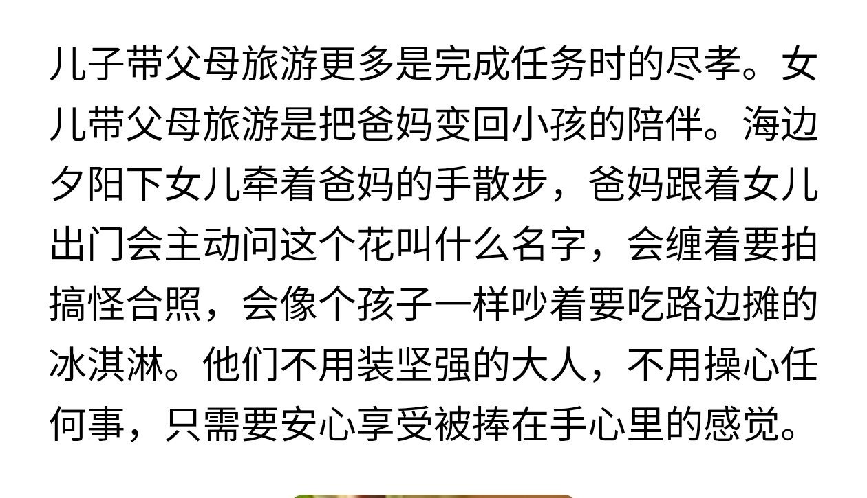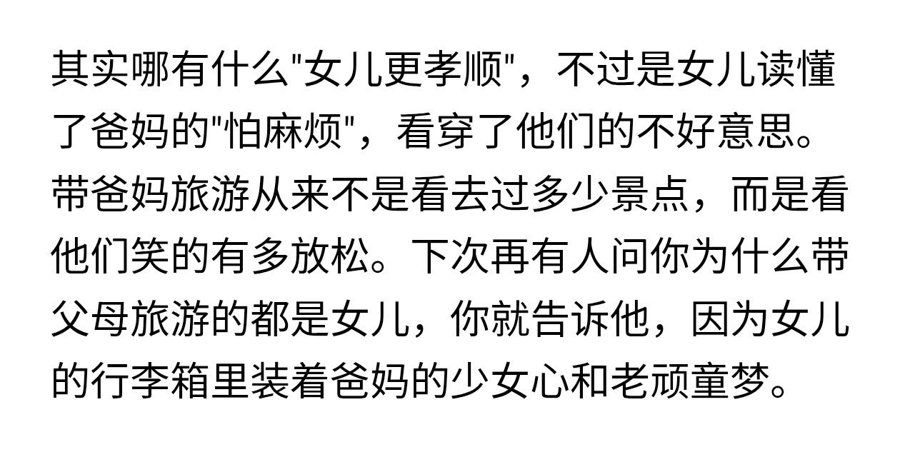 兴趣潜力计划为什么带父母旅行的大多都是女儿儿子带父母旅游更多是完成任务时的尽孝,女儿带父母旅游是把爸妈变回小孩的陪伴。你觉得是这样吗?真正在乎你的真的只有你的父母生活碎碎念