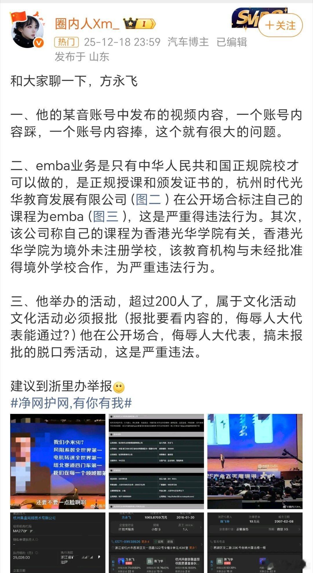 方永飞言论反转被指蹭流量近日,方某在其年度演讲针对某企业家的言论,引发网友关注,也导致该企业家被网暴。不过,随着网友深扒方某,事情出现了反转,网友指出方某一直在蹭该企业家的流量,此外,还有网友已经投诉到有关部门请求调查他的疑似违法违纪行为。方永飞非浙大正职教授