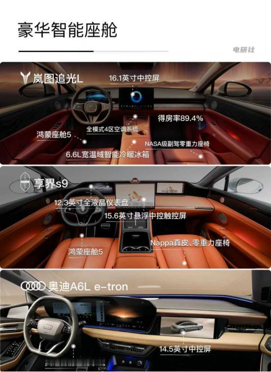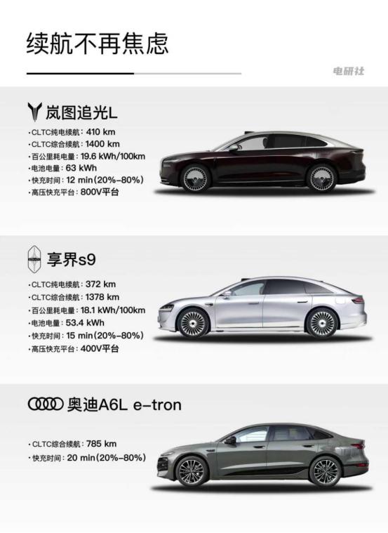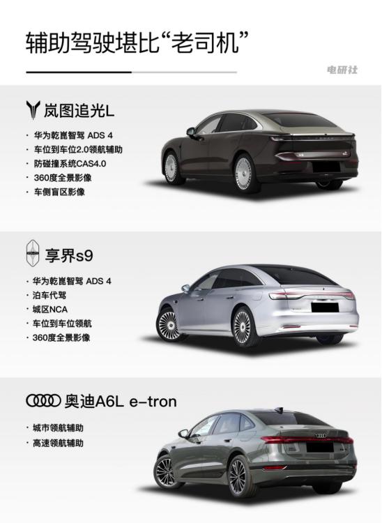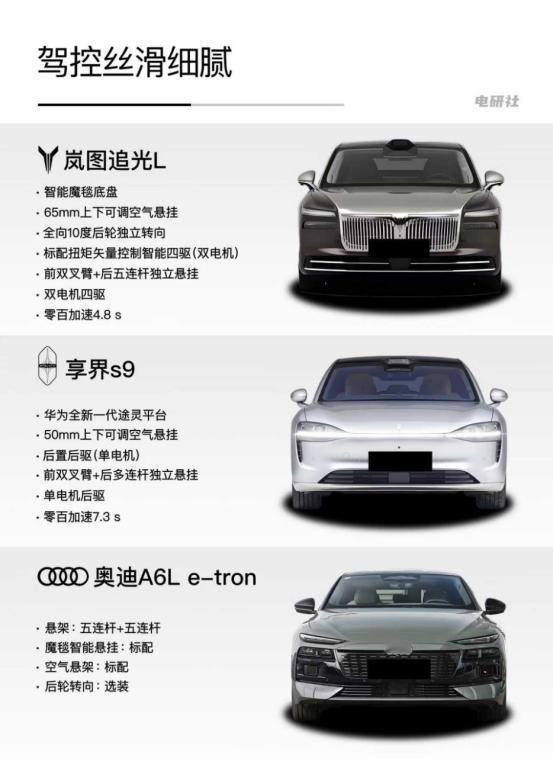 预算30w买豪华车,BBA不是第一选择? 在之前想到豪华。想到高级基本上都是想到BBA,但是在现在国产新能源给了消费者更多的选择,在看过中大型新能源轿车后,会发现今年同级的智能化已经来到一个新的阶段,有没有可能华系旗舰出现就已经把BBA的垄断打破了。 岚图追光L、享界S9、奥迪A6L e-tron 核心卖点全解析 续航与补能:全场景出行零焦虑 • 岚图追光L:综合续航直达1400km,搭载800V高压快充平台,20%-80%快充仅需12min,快充效率拉满,不管是日常通勤、短途自驾,还是长途跨城、高速远行,都能轻松hold住,全场景出行毫无续航顾虑。 • 享界S9:综合续航1378km,续航表现扎实能打,补能效率适配日常高频使用,完美覆盖日常上下班通勤与周末短途旅行需求,满足多数用户的基础出行续航期待。 • 奥迪A6L e-tron:配备107千瓦时大容量电池组,纯电续航可达770公里,续航稳定性突出,补能节奏适配常规使用场景,足以稳定支撑日常通勤与商务出行需求。 智能驾驶:高阶辅助省心又灵活 • 岚图追光L:搭载华为乾崑智驾ADS 4,城区NCA、泊车代驾功能全覆盖,城市复杂路口、社区狭窄地库等场景都能自主应对,大幅减少驾驶压力。更独有全向10度后轮独立转向,窄路通行、掉头灵活度直接拉满,复杂路况操控更从容。 • 享界S9:同样搭载华为乾崑智驾ADS 4,高阶辅助驾驶能力在线,城区NCA与泊车代驾功能一应俱全,面对城市拥堵路段、常规泊车场景,能精准规避风险,让驾驶更轻松省心。 • 奥迪A6L e-tron:搭载自研高阶无图智驾系统,配备双激光雷达融合感知方案,可轻松实现高速与城区NCA点对点领航,还支持跨楼层记忆泊车等复杂泊车功能,智驾场景覆盖全面,应对多样路况更显稳健可靠。 座舱与内饰:差异化风格适配多元需求 • 岚图追光L:搭载鸿蒙座舱5,操作流畅顺滑,多设备联动高效便捷,日常用车交互体验拉满。内饰走沉稳大气路线,用料扎实细腻,质感与舒适感兼具,不管是个人驾驶还是商务接待,都能彰显格调。 • 享界S9:标配鸿蒙座舱5,系统响应迅速,多设备互联无缝衔接,更深度适配家庭设备生态,实现车上车下信息连续同步,实用性拉满。内饰主打轻奢风格,设计简约精致,兼顾舒适感与日常使用便利性。 • 奥迪A6L e-tron:延续家族化豪华内饰设计,质感沉稳高级,车内静谧性表现出色。配备多块高清大屏与第二代AR-HUD,科技感呈现低调内敛,既保留豪华调性,又能满足用户对科技配置的需求。 驾驶与定位:精准匹配专属出行场景 • 岚图追光L:搭载双电机电驱系统,动力输出强劲稳定,高速驾驶时的稳定性与操作性尤为出色,底盘调校扎实,不管是长途跨城远行还是日常复杂路况驾驶,都能带来从容安心的驾驶体验,全场景出行适配性拉满。 • 享界S9:驾驶节奏偏向柔和舒适,即便车身尺寸不小,操控依旧轻盈灵活,上手难度低,日常城市通勤驾驶无压力,兼顾舒适性与实用性,是城市日常出行的优质之选。 • 奥迪A6L e-tron:延续品牌一贯的沉稳平顺驾驶风格,配备自适应空气悬架,行驶稳定性与舒适性大幅提升,驾驶质感贴近油车,能完美适配油车转电车用户的驾驶习惯,同时沉稳格调也契合商务出行场景需求。 总结:总的来说,BBA的垄断可能已经不复存在,国产新能源已经迈向了下个阶段,性价比豪华是否会成为国产豪华的一张王牌呢?【来自懂车帝车友圈】