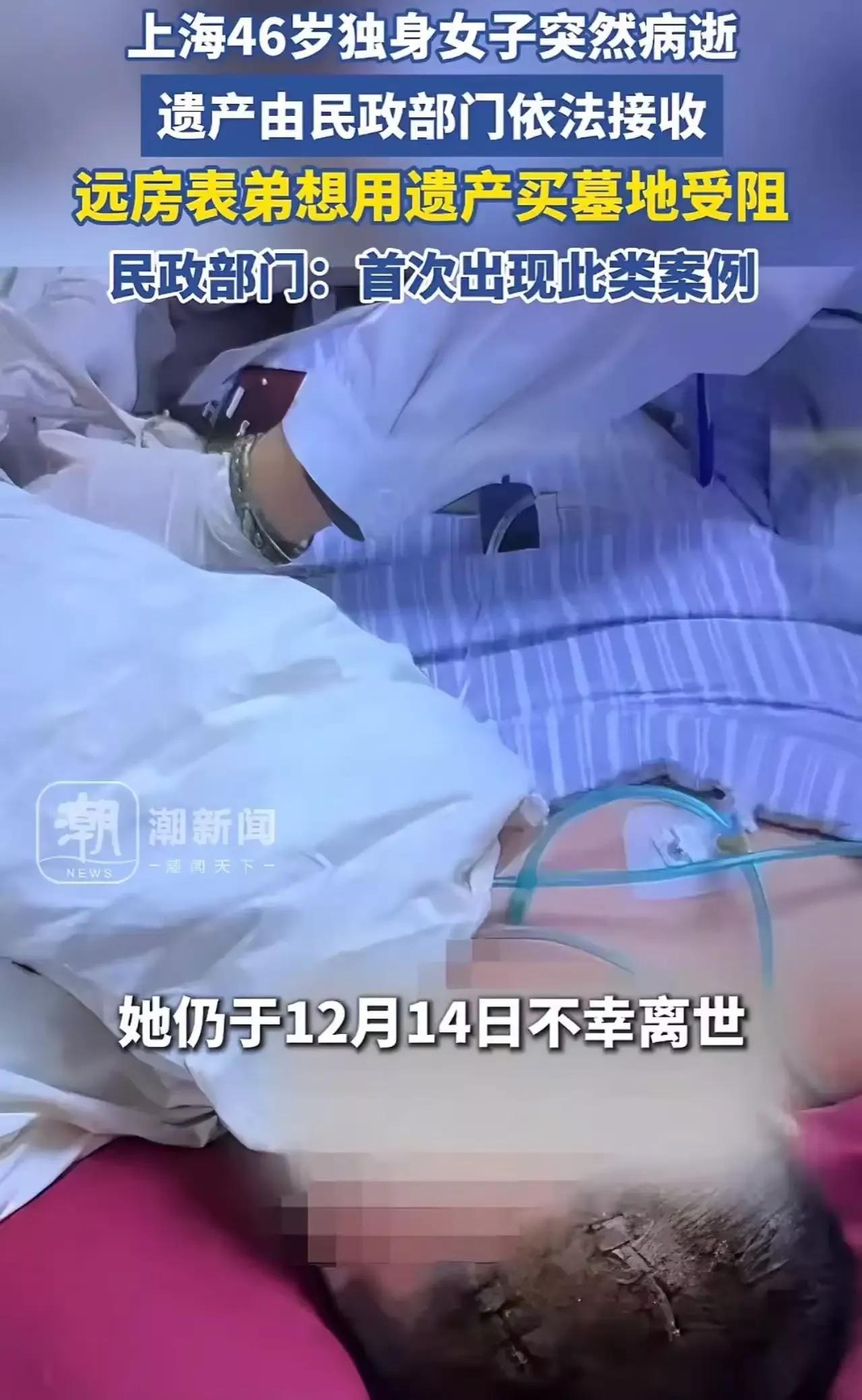 看完你还敢单身吗?上海icon46岁独身女子突然病逝,遗产由民政部门依法接收,远方表弟想用她的遗产买个墓地都受阻!民政部门回应:首次出现此类案件,正在研究解决!网友:自己的钱,给自己买个墓地都不允许吗? 看完你还敢单身吗?上海ICON的46岁独身女子突然离世,留下的遗产竟然引发了一场社会的深思。她没有婚姻,没有子女,却拥有一份属于自己的财产和生活选择权,可是谁曾想到,这份“自由”竟会变成一场“无解”的难题。 这位女子生前低调,却在离世后成为了舆论的焦点。民政部门依法接收了她的遗产,但令人震惊的是,远方的表弟打算用这笔钱为她买个墓地,却遭遇了前所未有的阻碍。官方回应:这是首次出现此类案件,正在研究解决方案。听起来似乎合理,但细细一想,背后折射出的却是一个令人心碎的现实——在某些人眼里,个人的财产、个人的意愿,似乎都被社会规则所限制。 网友们的反应也异常激烈:“自己的钱,给自己买个墓地都不允许吗?”“难道独身就意味着没有家人,没有归属感?”“这不是在剥夺一个人的最后尊严吗?”一时间,关于个人权益、社会伦理、传统观念的讨论铺天盖地。 其实,这个事件折射出一个更深层次的问题:在现代社会,个人的选择权到底有多大?特别是对于那些没有传统家庭纽带的人,他们的遗愿、财产归属,是否还被“规矩”所绑架?我们是否在无形中,给了“传统”太多的权力,让个人的意愿变得无关紧要? 更令人深思的是,社会的“规范”到底是保护还是限制?在这个信息高速发展的时代,个人的自主权应得到怎样的尊重?我们是否还在用老旧的观念去衡量一个现代人的生活?这场风波或许只是冰山一角,但它提醒我们,每个人都应拥有为自己生活、为自己权益发声的勇气。 单身,不是孤独,也不是孤立。它是一种自由,一种选择。我们应该为每一个敢于追求自己生活方式的人鼓掌,而不是用传统的枷锁去限制他们的最后尊严。 也许,这个事件的终点还未到来,但它点燃了公众对个人权益的关注,也唤醒了我们每个人对“尊重个体”的思考。毕竟,生命的最后一刻,最希望的,或许只是“尊重”和“自由”。你,准备好为自己争取那份尊重了吗? 独身女子病逝 上海人去世