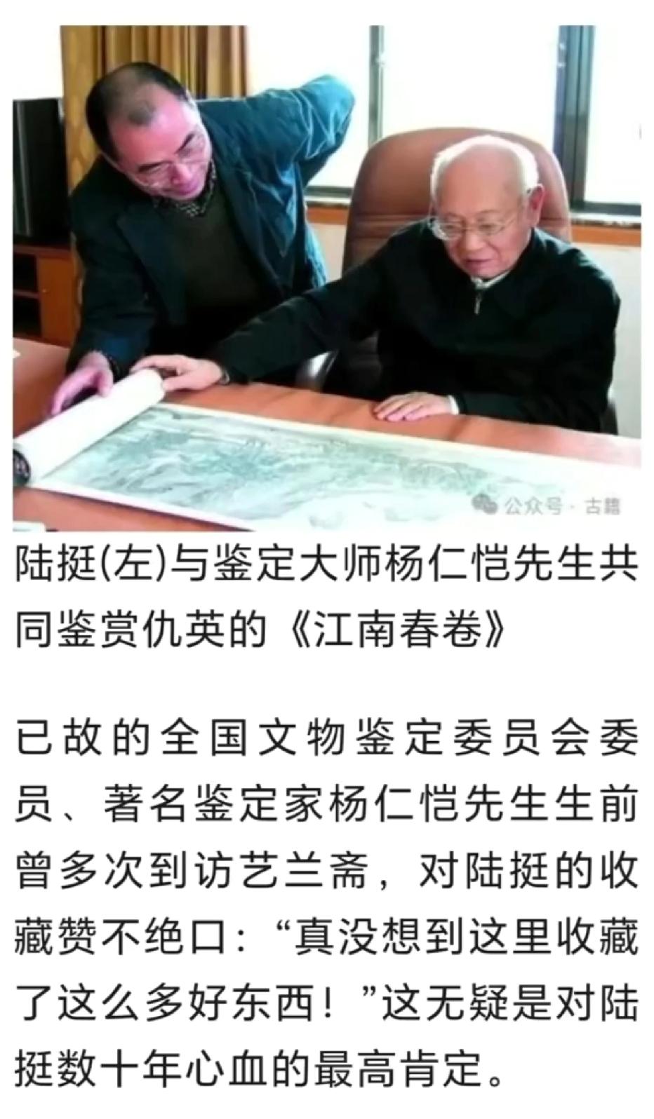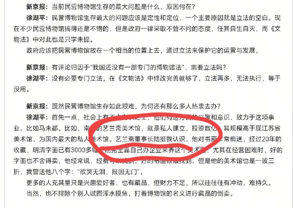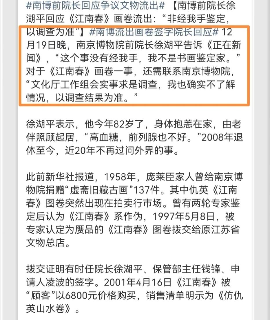 南京博物院藏品流拍事件,记者采访了经手《江南春》的最后一位在世的南博院长徐湖平。徐湖平表示《江南春》调剂买卖根本没有经手,自己不是书画鉴定家。但是从《江南春》买卖手续中可以看出徐湖平的亲笔签名,作为院长应该非常清楚,不然不会平白无故的签名吧?而且,据报道,国内最大私人美术馆的陆挺早就收藏了《剑南春》并请国内鉴定大师杨仁凯鉴定,两个人颇为满意。而徐湖平曾经在接受采访时说过,艺兰斋的陆挺,他是认识的,而且还比较欣赏。不信谣,不传谣,不过这种事也太巧了吧!希望有关部门调查清楚吧!
