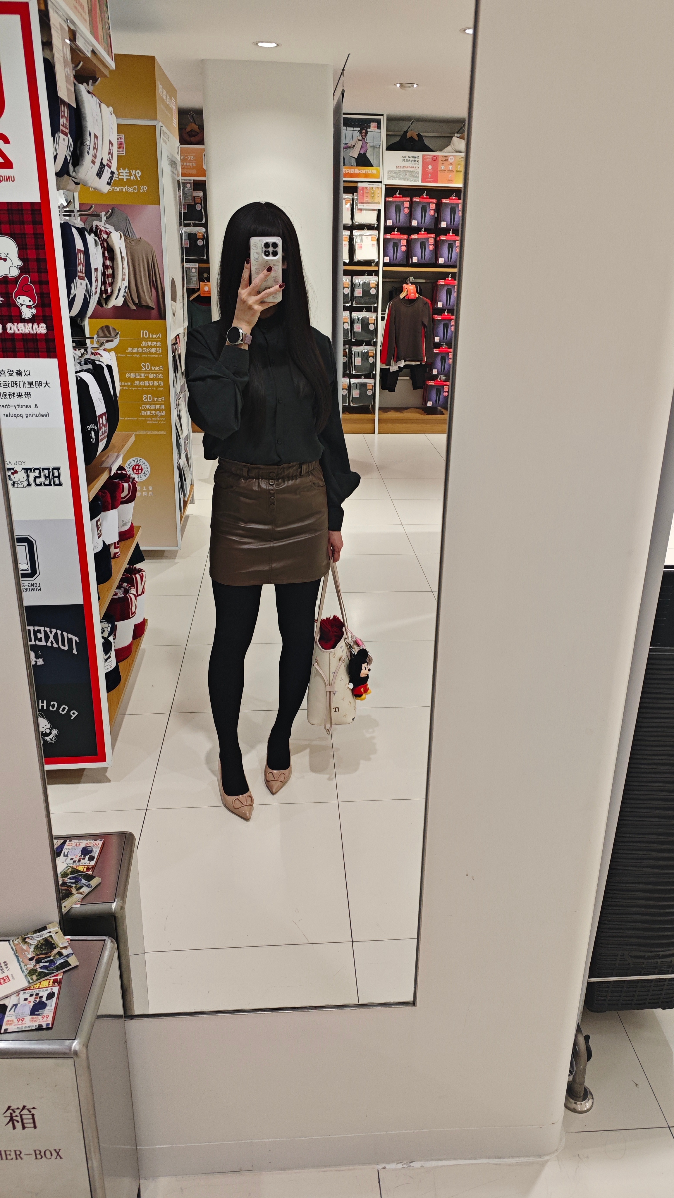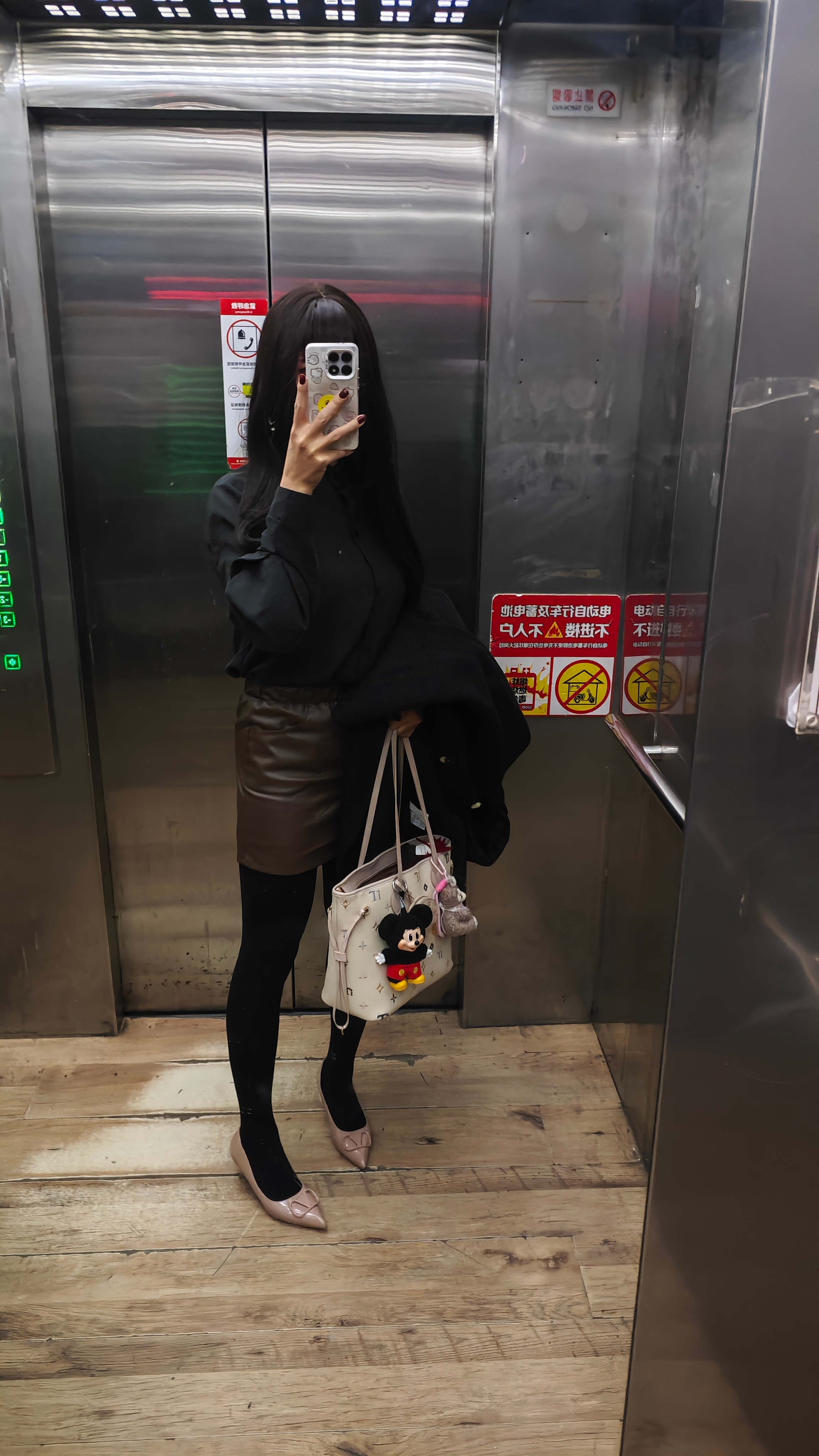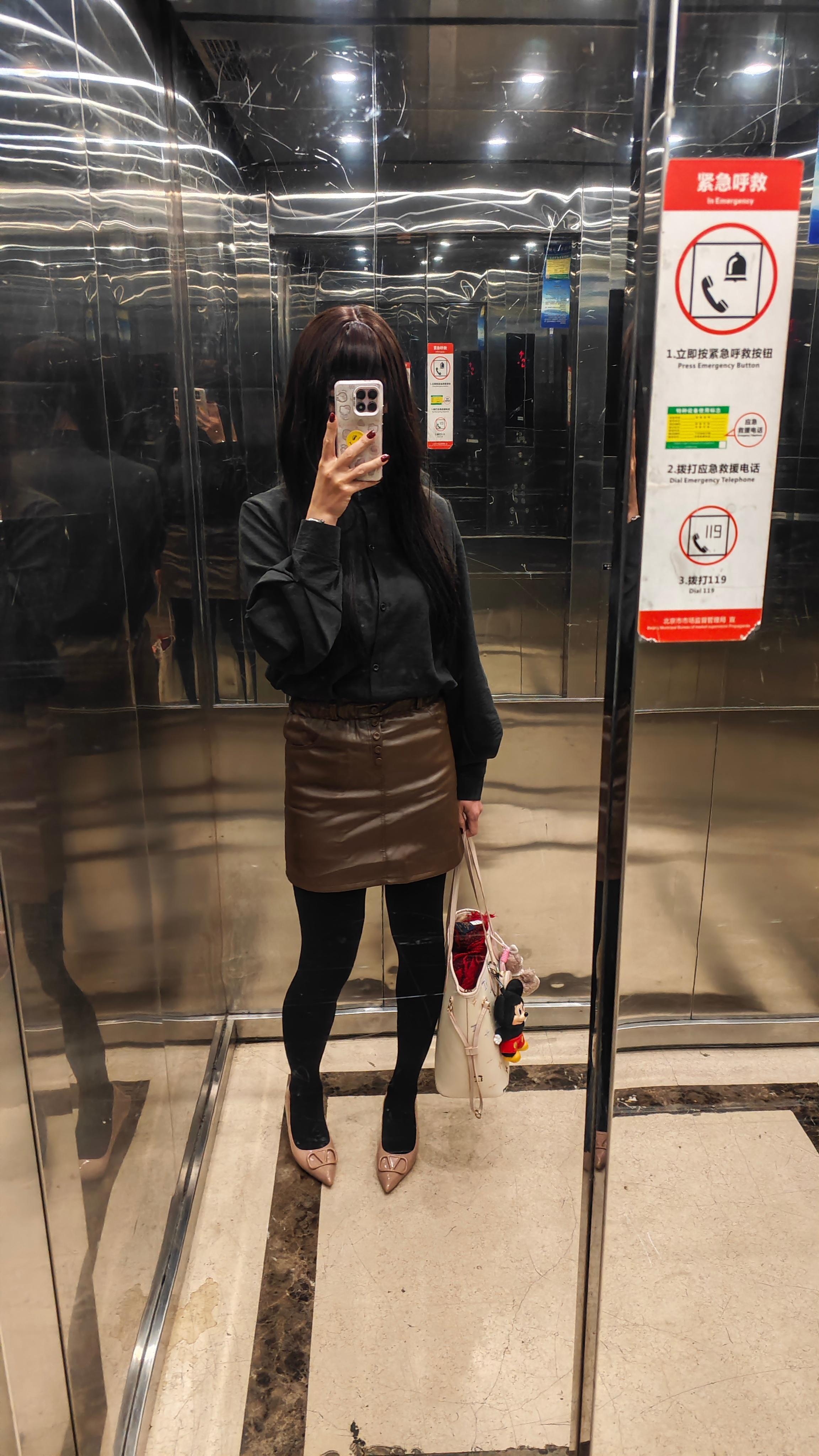 晚上去了ZhaoDai,蹦迪的氛围太好啦~今天穿得黑衬衫,棕色PU皮裙,厚黑裤袜,小高跟鞋,外面还是羽绒夹层的毛呢大衣。 北京·格纳斯大厦