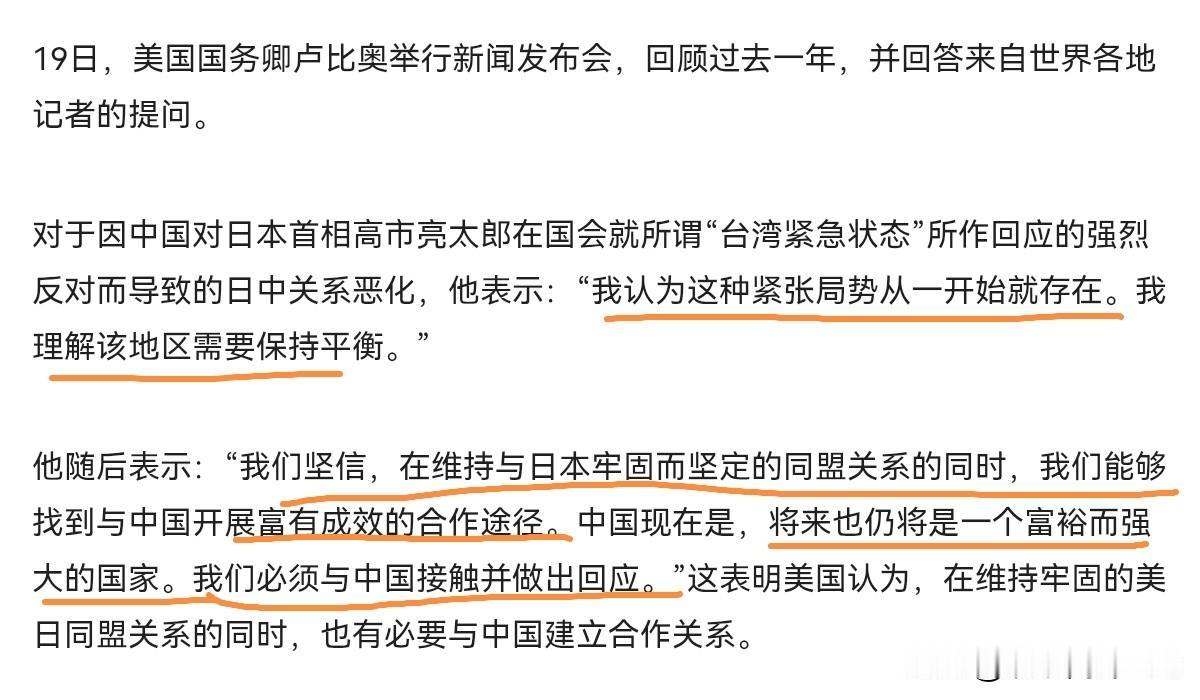罕见!对华鹰派的鲁比奥出来讲话了!鲁比奥表示,不会因为有美日同盟的存在,而不与中国进行合作!12月20日,根据日媒NHK报道,美国国务卿鲁比奥举行新闻发布会上表示,对于中日关系的恶化,我认为这种紧张局势从一开始就存在。我理解该地区需要保持平衡。 鲁比奥称,我们坚信,在维持与日本牢固而坚定的同盟关系的同时,我们能够找到与中国开展富有成效的合作途径。中国现在是,将来也仍将是一个富裕而强大的国家。我们必须与中国接触并做出回应。很显然,鲁比奥的这一番讲话非常的罕见,为什么这样说呢? 因为鲁比奥在强调美日同盟关系时,鲁比奥并没有对我们使用负面的字眼,而是强调与中国合作,接触的一面。更让人感到意外的是,之前长期批评我们的鲁比奥竟然声称“中国现在是,将来也仍将是一个富裕而强大的国家”,这充分说明,美国对待我们的态度确实发生了转变。若非美国对华政策出现转变,很难相信这话能从鲁比奥口里面说出来。 如果说对于中美关系,美国此前的态度是遏制,竞争,远大于合作的话,那么现在中美合作的一面正呈现扩大的势头。而这当然也意味着,美国也在平衡盟友与对华关系,也就是美国不愿为日本背书而与中国全面对抗,避免被盟友“绑上战车”,同时也防止中日紧张外溢冲击美国在印太的布局。对于美国这样的转变,高市早苗估计会感到后背发凉。