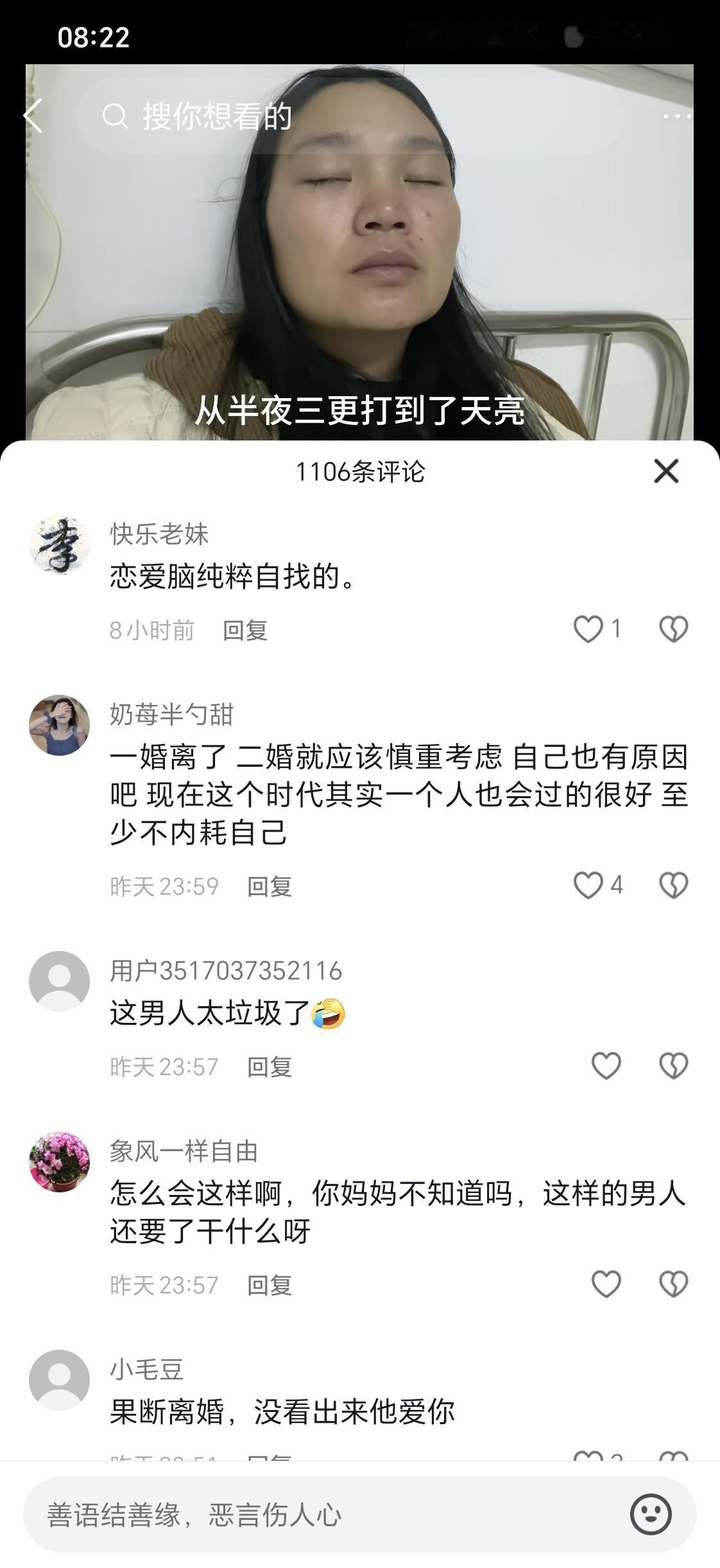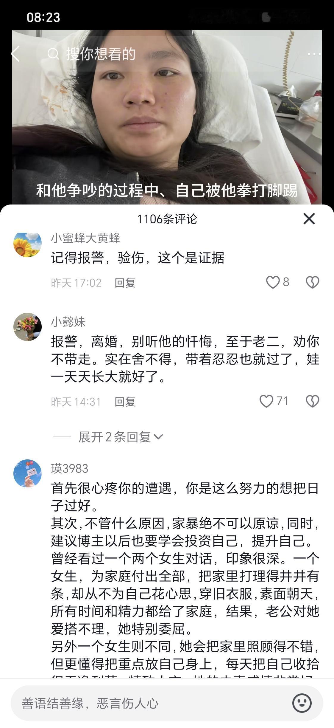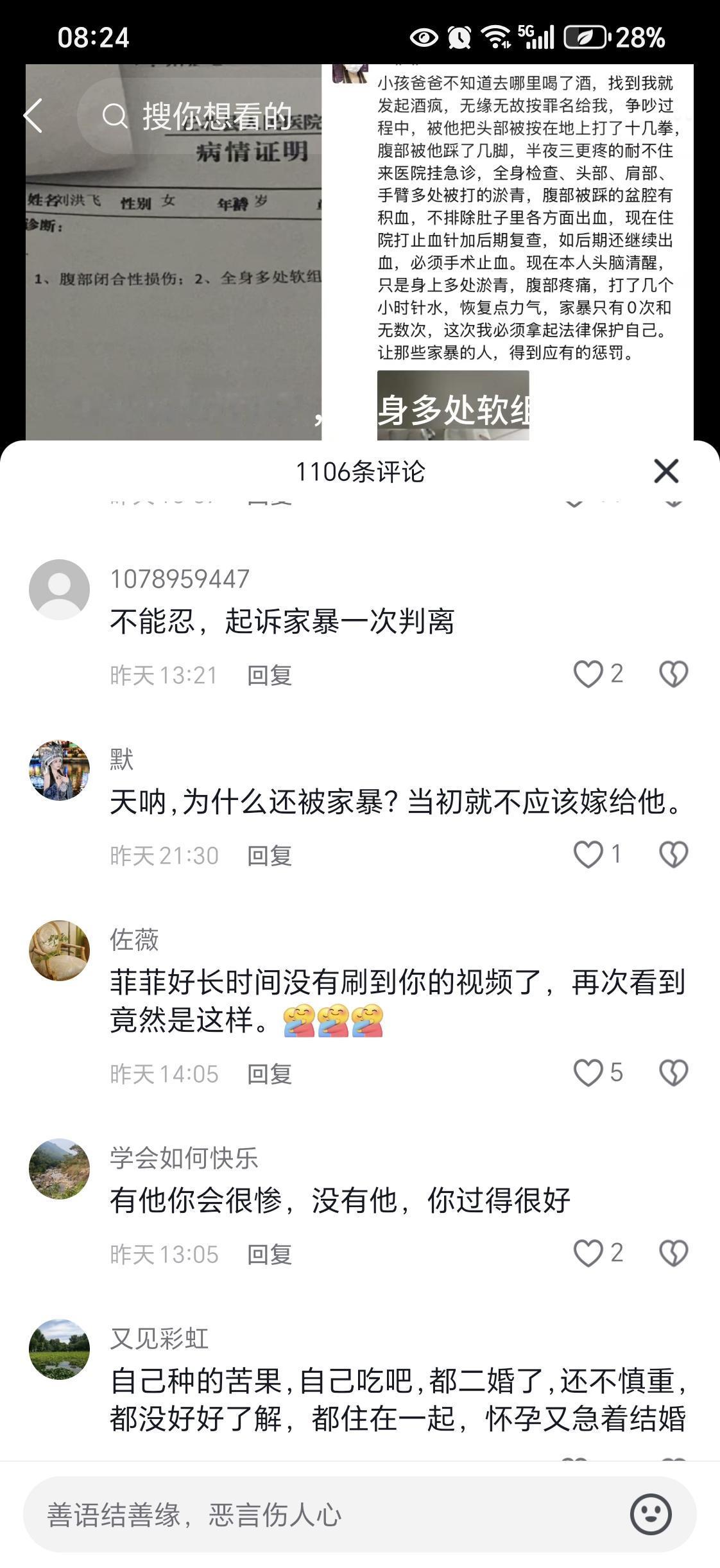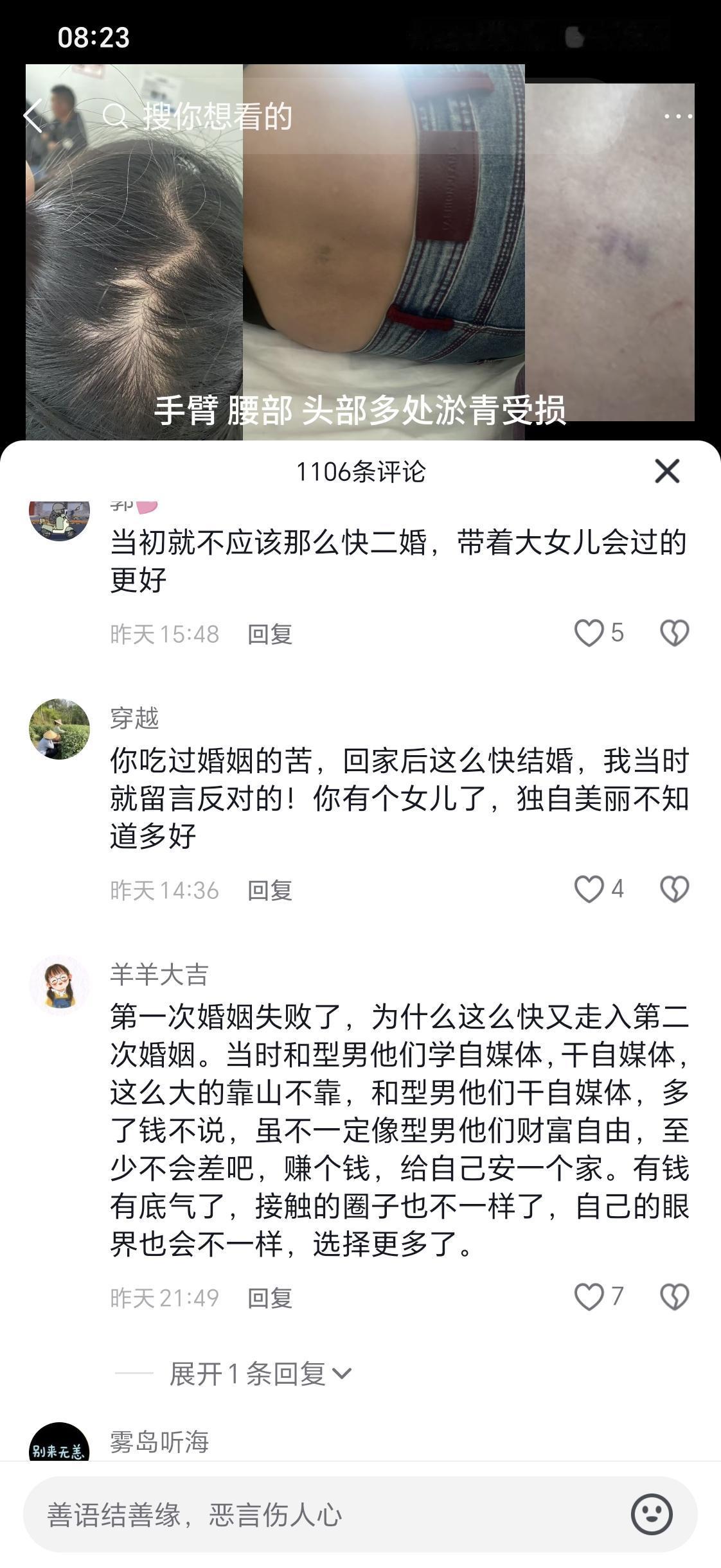 型男后妈女儿菲菲家暴这件事情是零容忍的。喝醉酒的老公对菲菲的动手,把手机摔碎,把家里环境弄得狼狈不堪,把菲菲打得头晕脑胀,盆腔积血,打到进医院治疗。 菲菲心中的痛不轻于皮下的痛, 严重家暴,破坏家庭的平衡。 家暴肯定是不值得原谅的。 菲菲才29岁,着急都二婚二胎了,肉眼可见地苍老与憔悴, 婚姻到底多重要?没有想清楚就快速进入第二段婚姻了?现在骑虎难下?离婚不?小孩子怎么办? 经济又不是说富贵得流油! 型男后妈与型男爸爸婚姻也是因为菲菲的二婚影响极大,型男后妈在四川活着可滋润为了去减轻菲菲的负担把她的婚姻也整得支离破碎, 本来型男后妈和型男爸爸相互有个伴, 为了一个菲菲二婚生活为了支持菲菲这个亲生女儿,后妈跑回云南去照顾, 型男爸爸就只能和型男幺叔结伴过日子。 尴尬得很,两头都不讨好。 看似是菲菲的家暴,劝得是菲菲离婚。 实际是反映了, 没有经营好的各自的婚姻都是一潭死水,如果自己没有经营婚姻的能力, 一定要慎重,不要一头陷进去,亲人也跟着纠结! 在没有经济能力之前,哪里来的底气去二婚?? 家暴 家暴女人离婚 二婚家暴