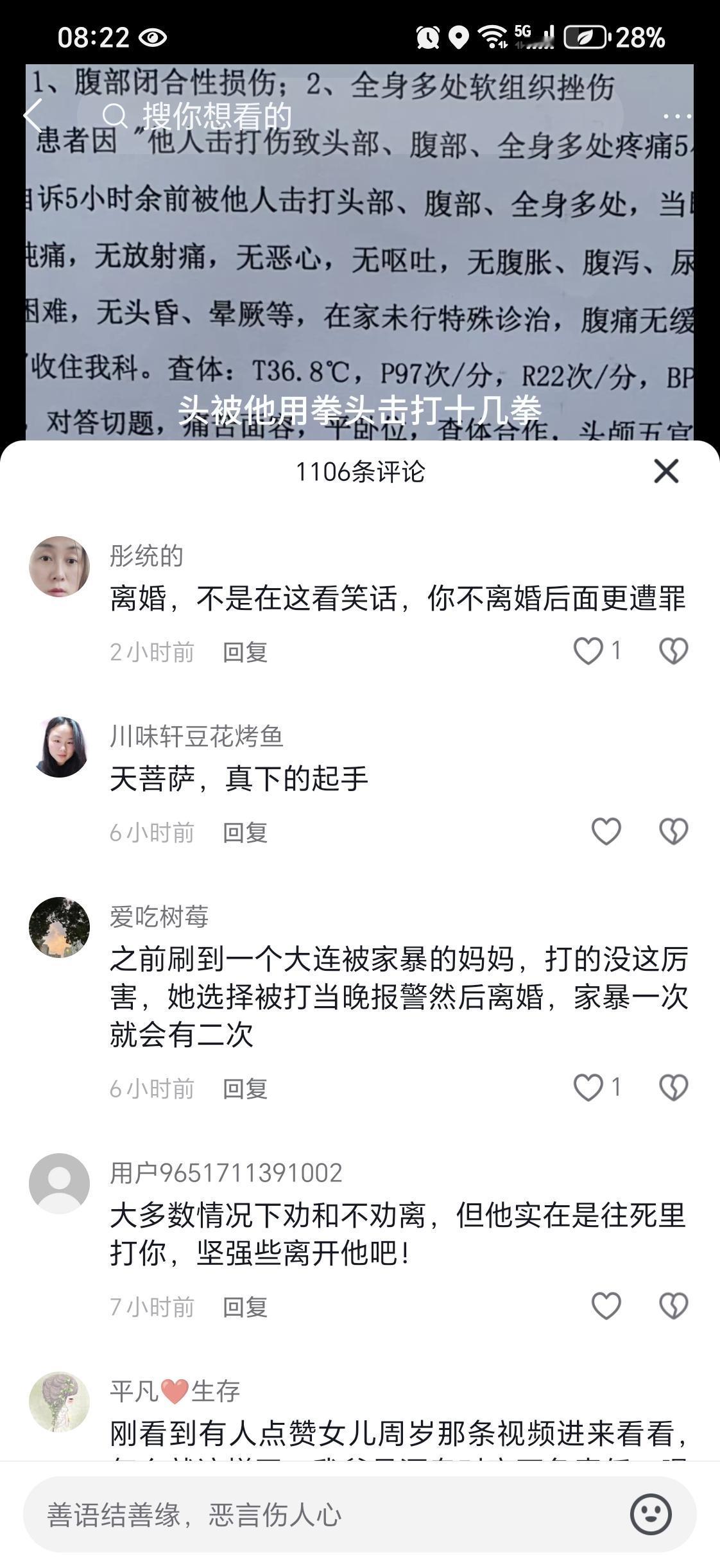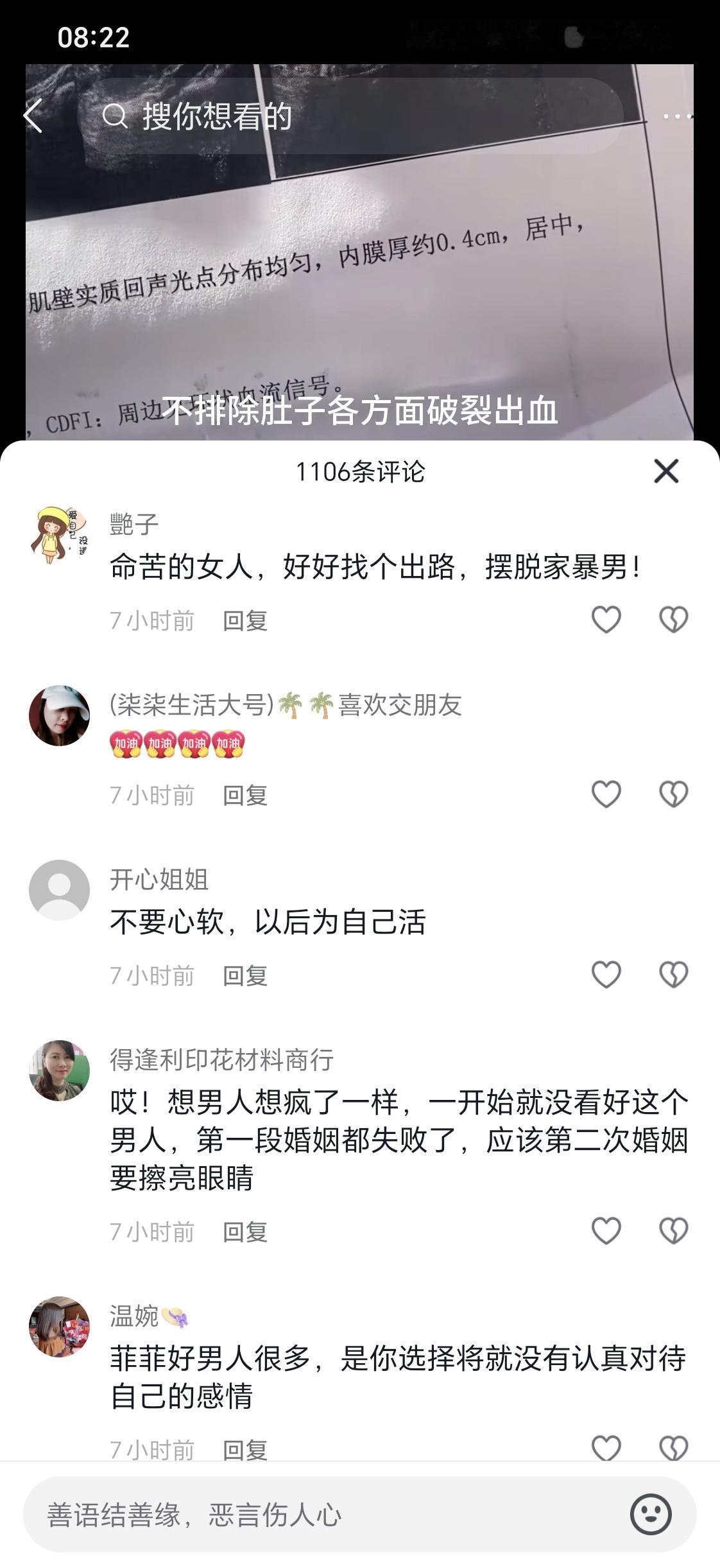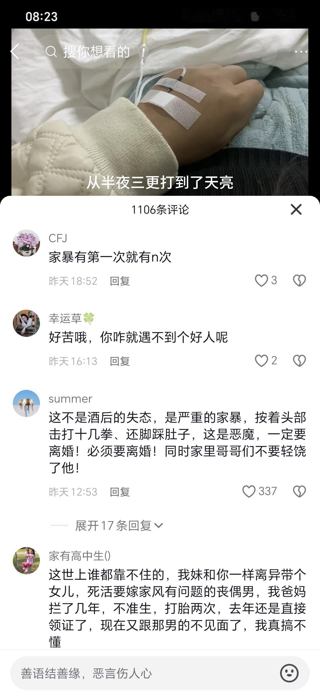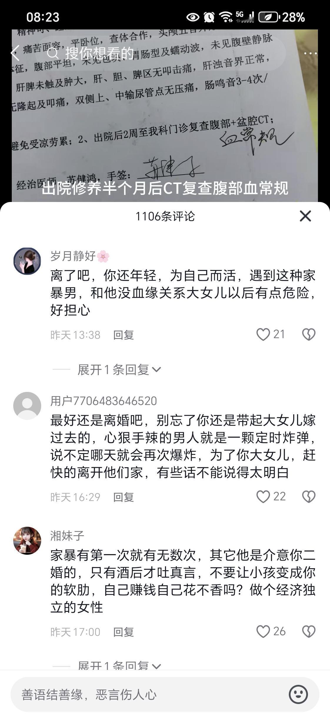 型男后妈女儿菲菲家暴这件事情是零容忍的。喝醉酒的老公对菲菲的动手,把手机摔碎,把家里环境弄得狼狈不堪,把菲菲打得头晕脑胀,盆腔积血,打到进医院治疗。 菲菲心中的痛不轻于皮下的痛, 严重家暴,破坏家庭的平衡。 家暴肯定是不值得原谅的。 菲菲才29岁,着急都二婚二胎了,肉眼可见地苍老与憔悴, 婚姻到底多重要?没有想清楚就快速进入第二段婚姻了?现在骑虎难下?离婚不?小孩子怎么办? 经济又不是说富贵得流油! 型男后妈与型男爸爸婚姻也是因为菲菲的二婚影响极大,型男后妈在四川活着可滋润为了去减轻菲菲的负担把她的婚姻也整得支离破碎, 本来型男后妈和型男爸爸相互有个伴, 为了一个菲菲二婚生活为了支持菲菲这个亲生女儿,后妈跑回云南去照顾, 型男爸爸就只能和型男幺叔结伴过日子。 尴尬得很,两头都不讨好。 看似是菲菲的家暴,劝得是菲菲离婚。 实际是反映了, 没有经营好的各自的婚姻都是一潭死水,如果自己没有经营婚姻的能力, 一定要慎重,不要一头陷进去,亲人也跟着纠结! 在没有经济能力之前,哪里来的底气去二婚?? 家暴 家暴女人离婚 二婚家暴