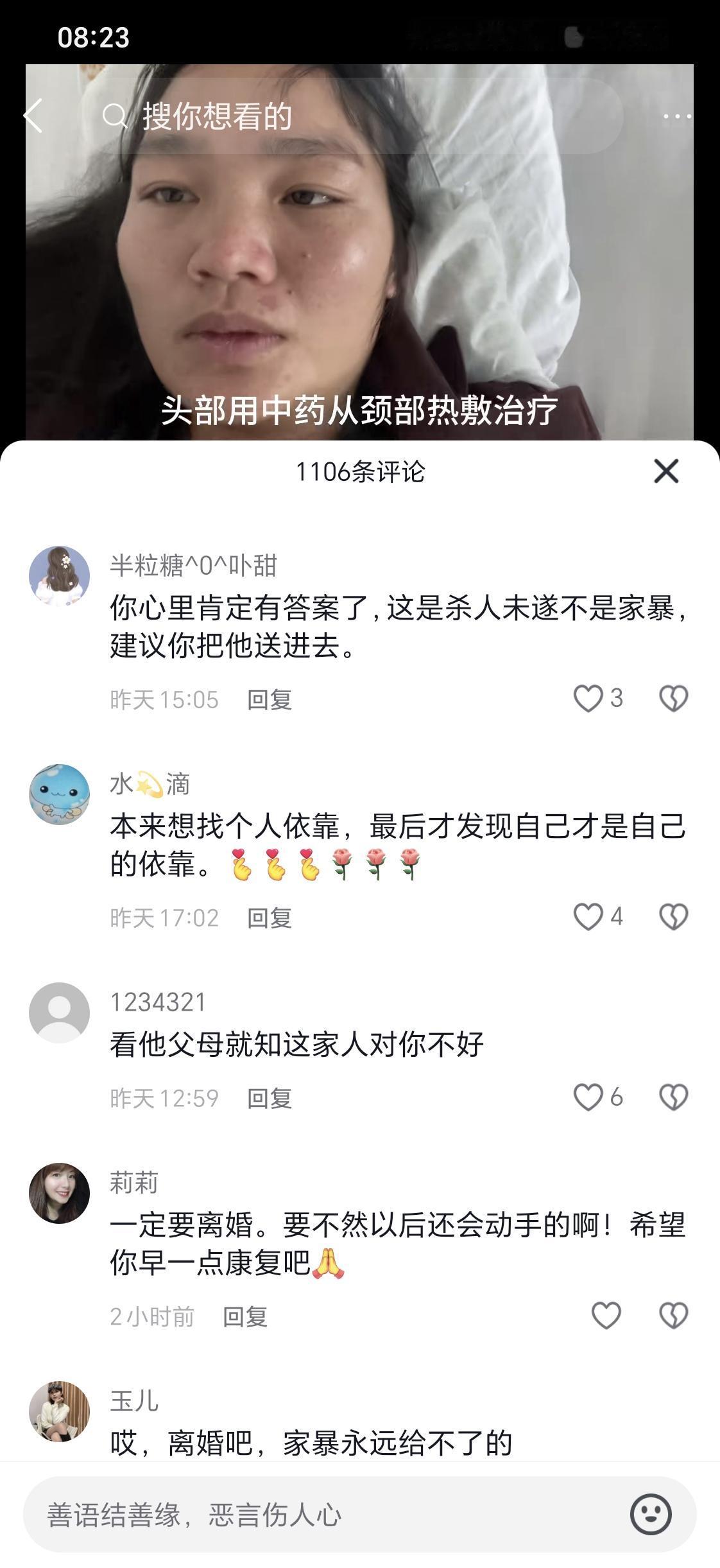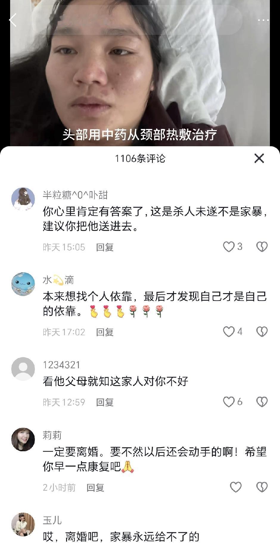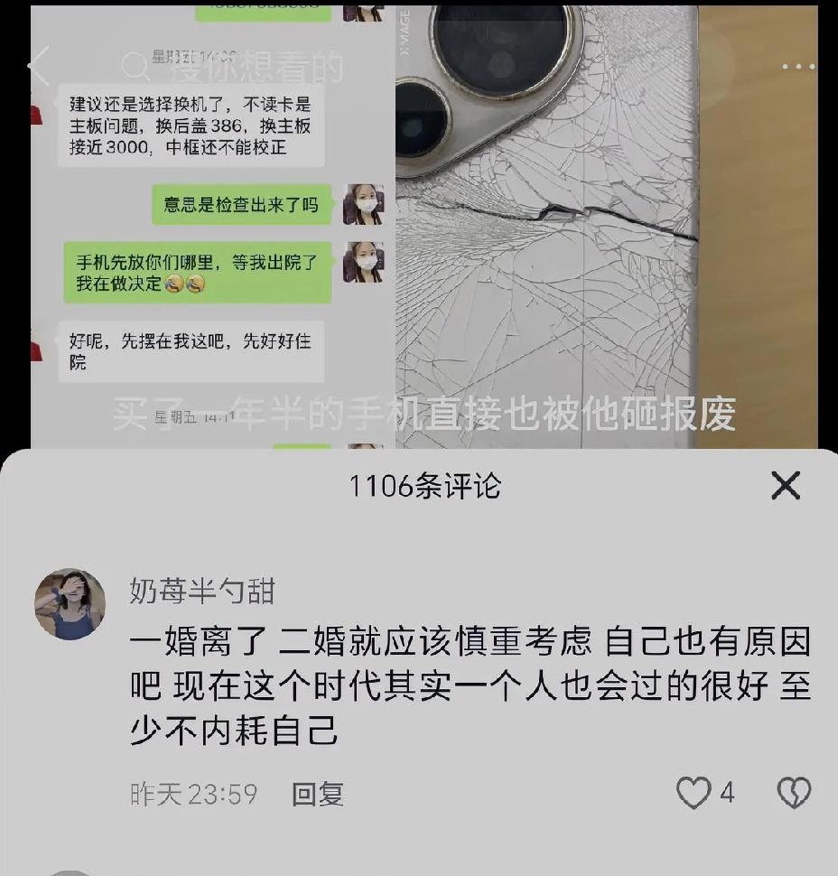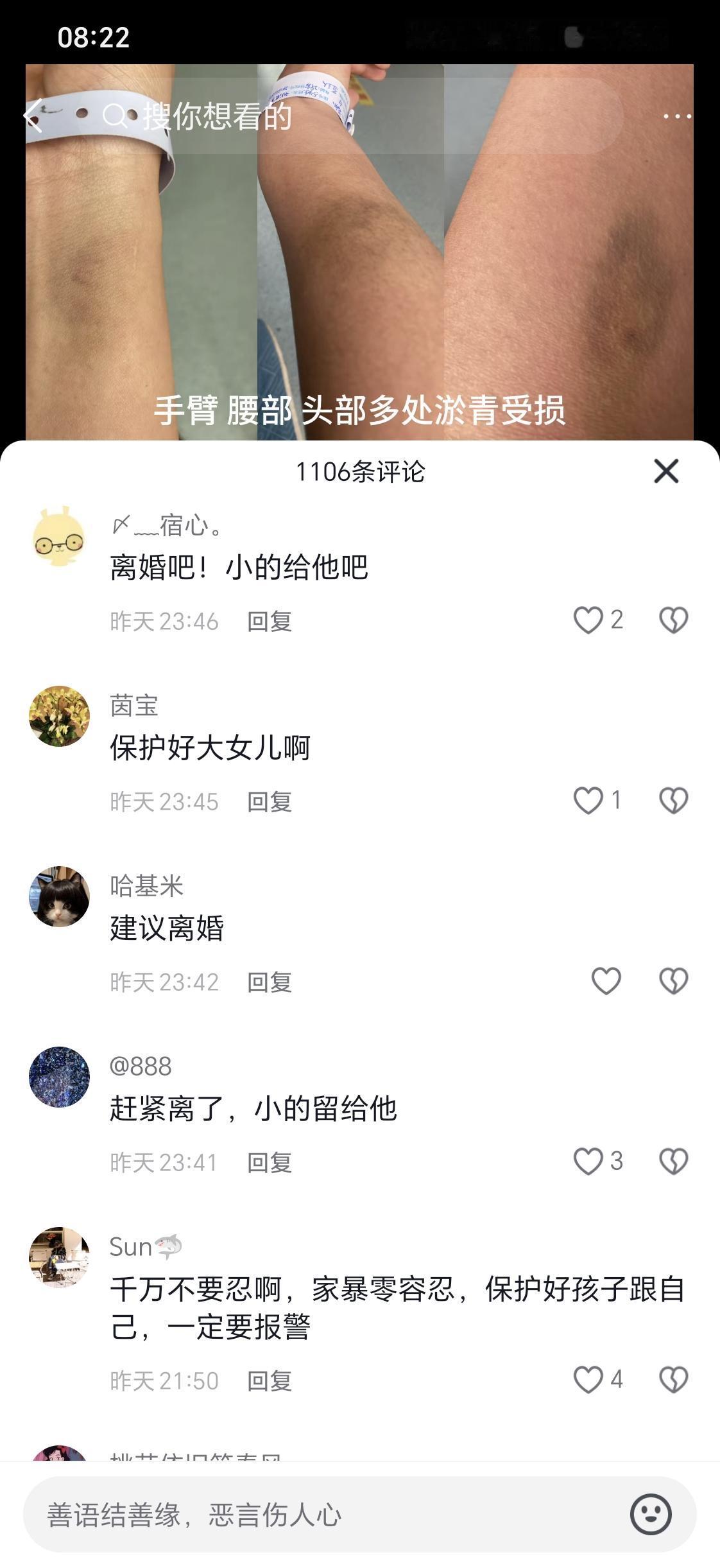 型男后妈女儿菲菲家暴这件事情是零容忍的。喝醉酒的老公对菲菲的动手,把手机摔碎,把家里环境弄得狼狈不堪,把菲菲打得头晕脑胀,盆腔积血,打到进医院治疗。 菲菲心中的痛不轻于皮下的痛, 严重家暴,破坏家庭的平衡。 家暴肯定是不值得原谅的。 菲菲才29岁,着急都二婚二胎了,肉眼可见地苍老与憔悴, 婚姻到底多重要?没有想清楚就快速进入第二段婚姻了?现在骑虎难下?离婚不?小孩子怎么办? 经济又不是说富贵得流油! 型男后妈与型男爸爸婚姻也是因为菲菲的二婚影响极大,型男后妈在四川活着可滋润为了去减轻菲菲的负担把她的婚姻也整得支离破碎, 本来型男后妈和型男爸爸相互有个伴, 为了一个菲菲二婚生活为了支持菲菲这个亲生女儿,后妈跑回云南去照顾, 型男爸爸就只能和型男幺叔结伴过日子。 尴尬得很,两头都不讨好。 看似是菲菲的家暴,劝得是菲菲离婚。 实际是反映了, 没有经营好的各自的婚姻都是一潭死水,如果自己没有经营婚姻的能力, 一定要慎重,不要一头陷进去,亲人也跟着纠结! 在没有经济能力之前,哪里来的底气去二婚?? 家暴 家暴女人离婚 二婚家暴