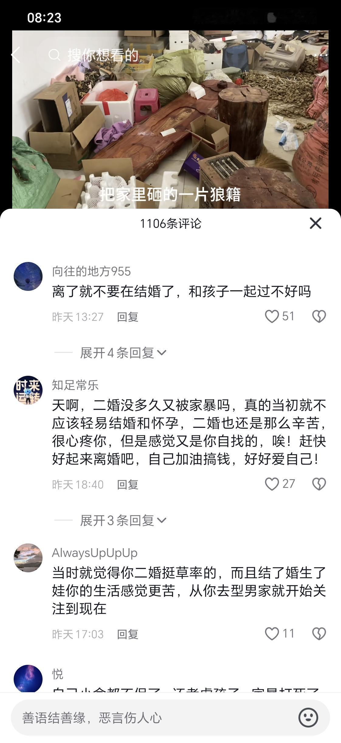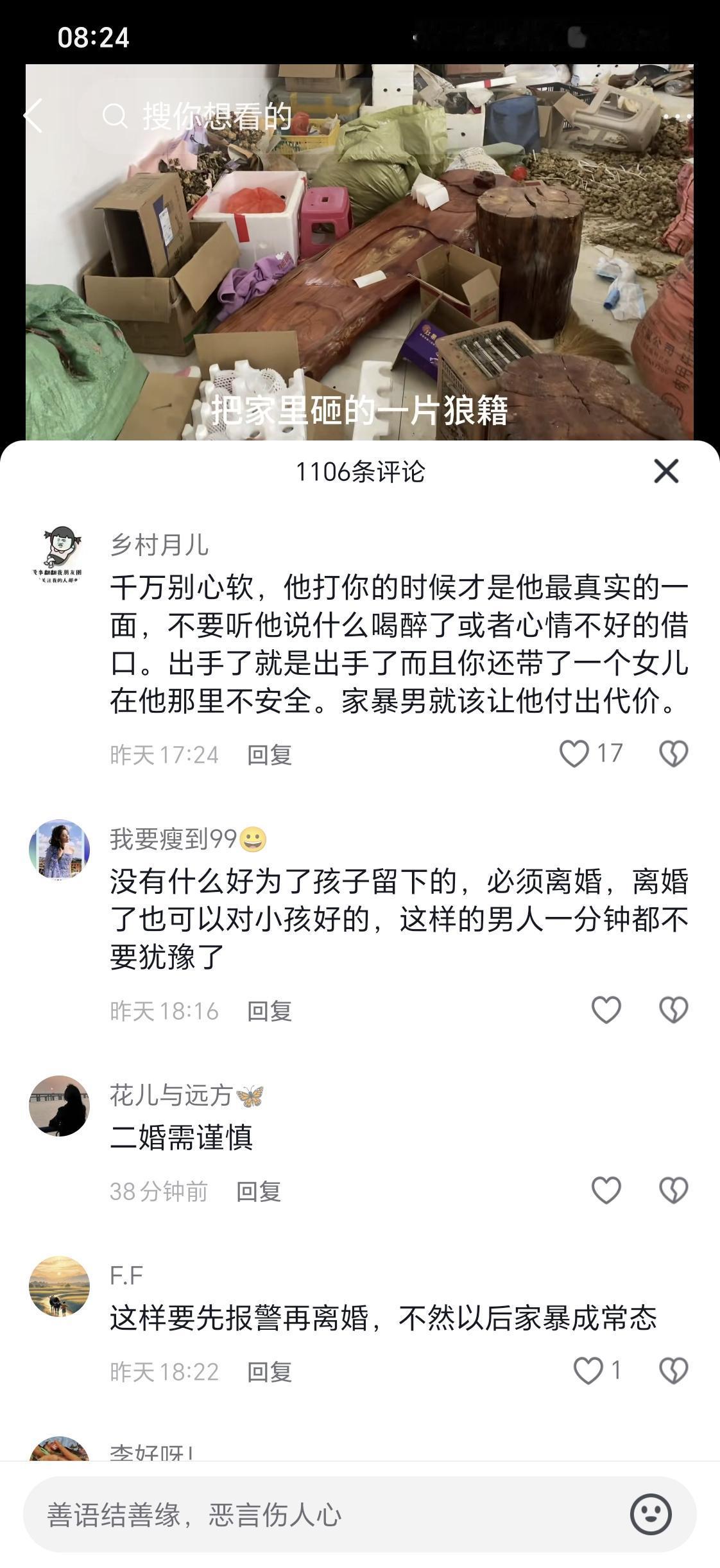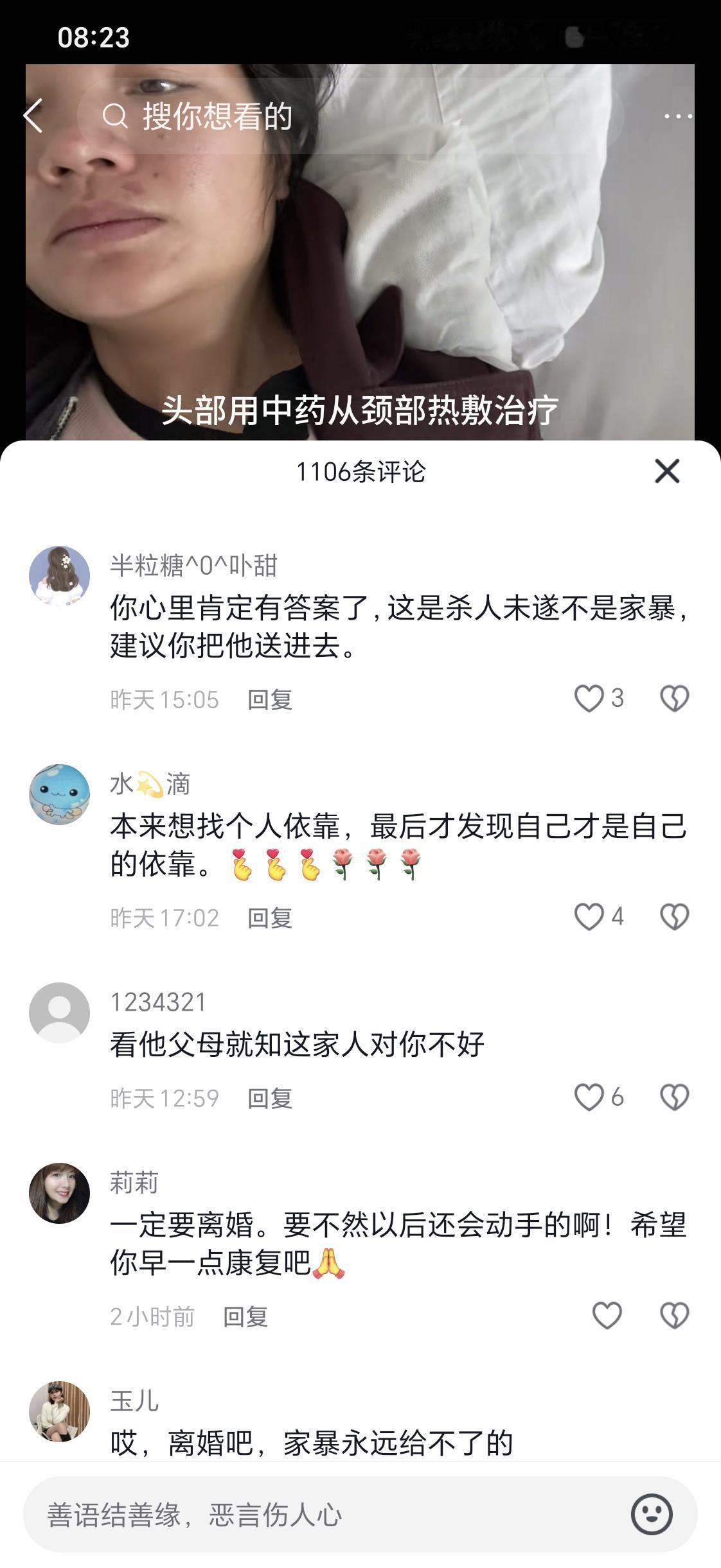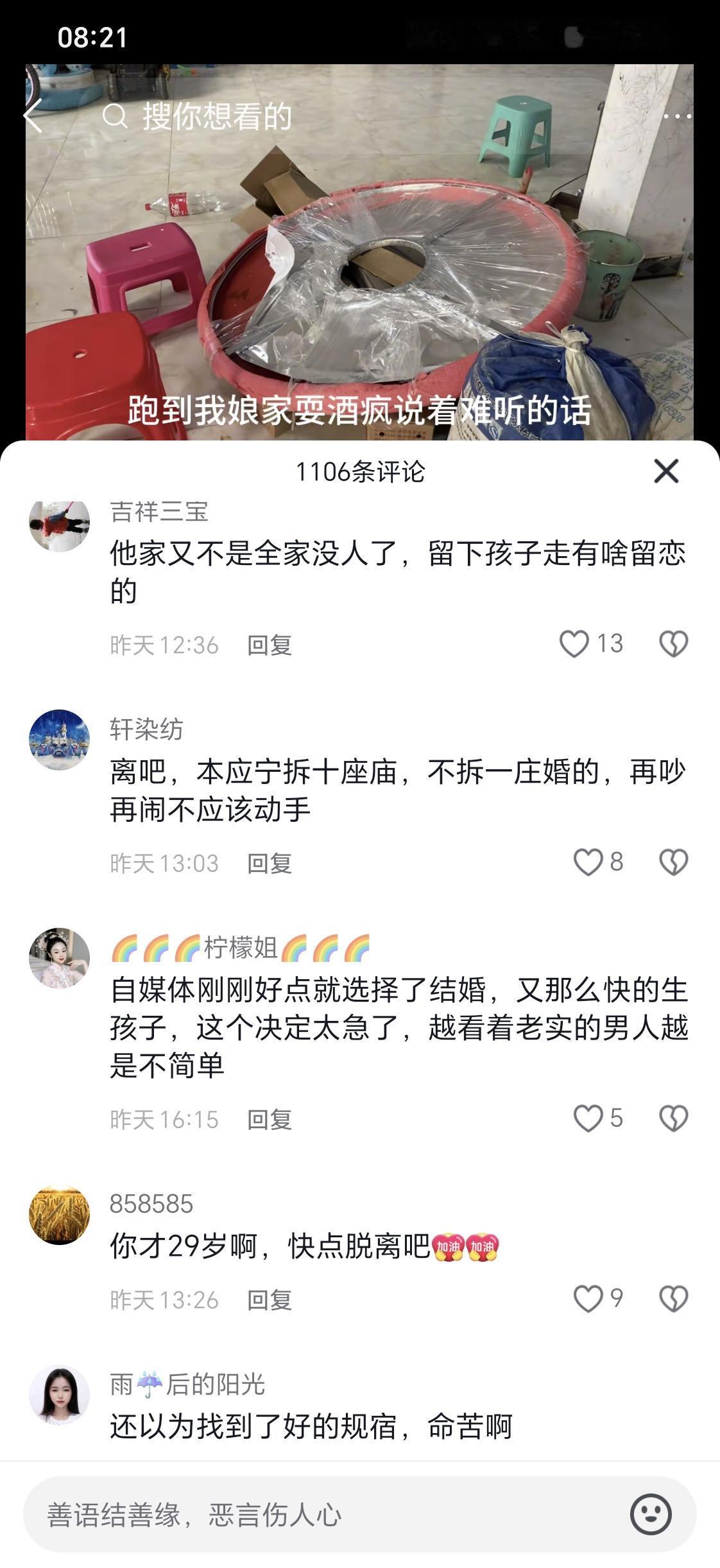 型男后妈女儿菲菲家暴这件事情是零容忍的。喝醉酒的老公对菲菲的动手,把手机摔碎,把家里环境弄得狼狈不堪,把菲菲打得头晕脑胀,盆腔积血,打到进医院治疗。 菲菲心中的痛不轻于皮下的痛, 严重家暴,破坏家庭的平衡。 家暴肯定是不值得原谅的。 菲菲才29岁,着急都二婚二胎了,肉眼可见地苍老与憔悴, 婚姻到底多重要?没有想清楚就快速进入第二段婚姻了?现在骑虎难下?离婚不?小孩子怎么办? 经济又不是说富贵得流油! 型男后妈与型男爸爸婚姻也是因为菲菲的二婚影响极大,型男后妈在四川活着可滋润为了去减轻菲菲的负担把她的婚姻也整得支离破碎, 本来型男后妈和型男爸爸相互有个伴, 为了一个菲菲二婚生活为了支持菲菲这个亲生女儿,后妈跑回云南去照顾, 型男爸爸就只能和型男幺叔结伴过日子。 尴尬得很,两头都不讨好。 看似是菲菲的家暴,劝得是菲菲离婚。 实际是反映了, 没有经营好的各自的婚姻都是一潭死水,如果自己没有经营婚姻的能力, 一定要慎重,不要一头陷进去,亲人也跟着纠结! 在没有经济能力之前,哪里来的底气去二婚?? 家暴 家暴女人离婚 二婚家暴
