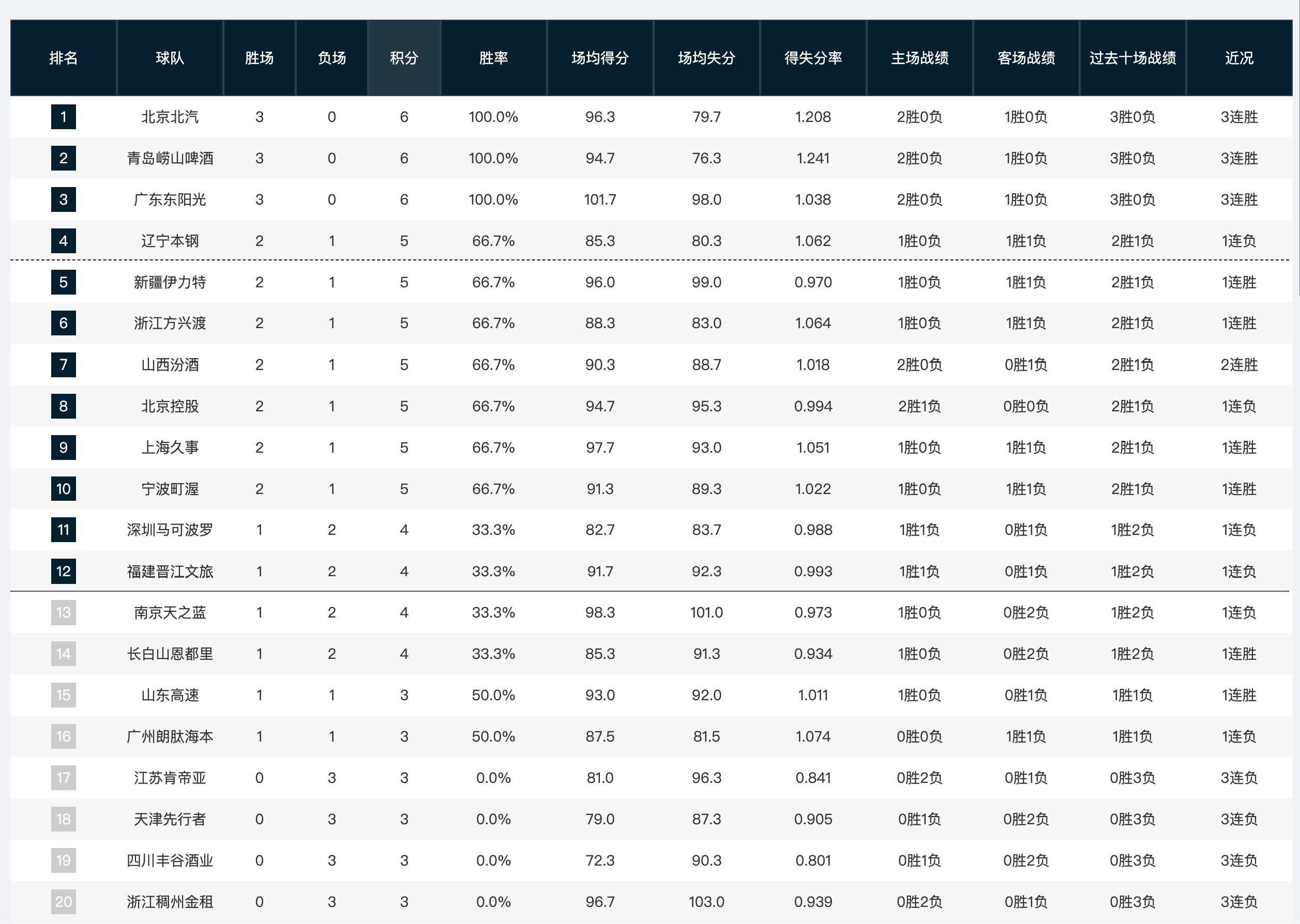 前三轮打完的积分榜,北京、青岛、广东暂时全胜,浙江稠州垫底,场均失分体现着他们在防守端的崩溃。(山东、龙狮少赛一场)cba