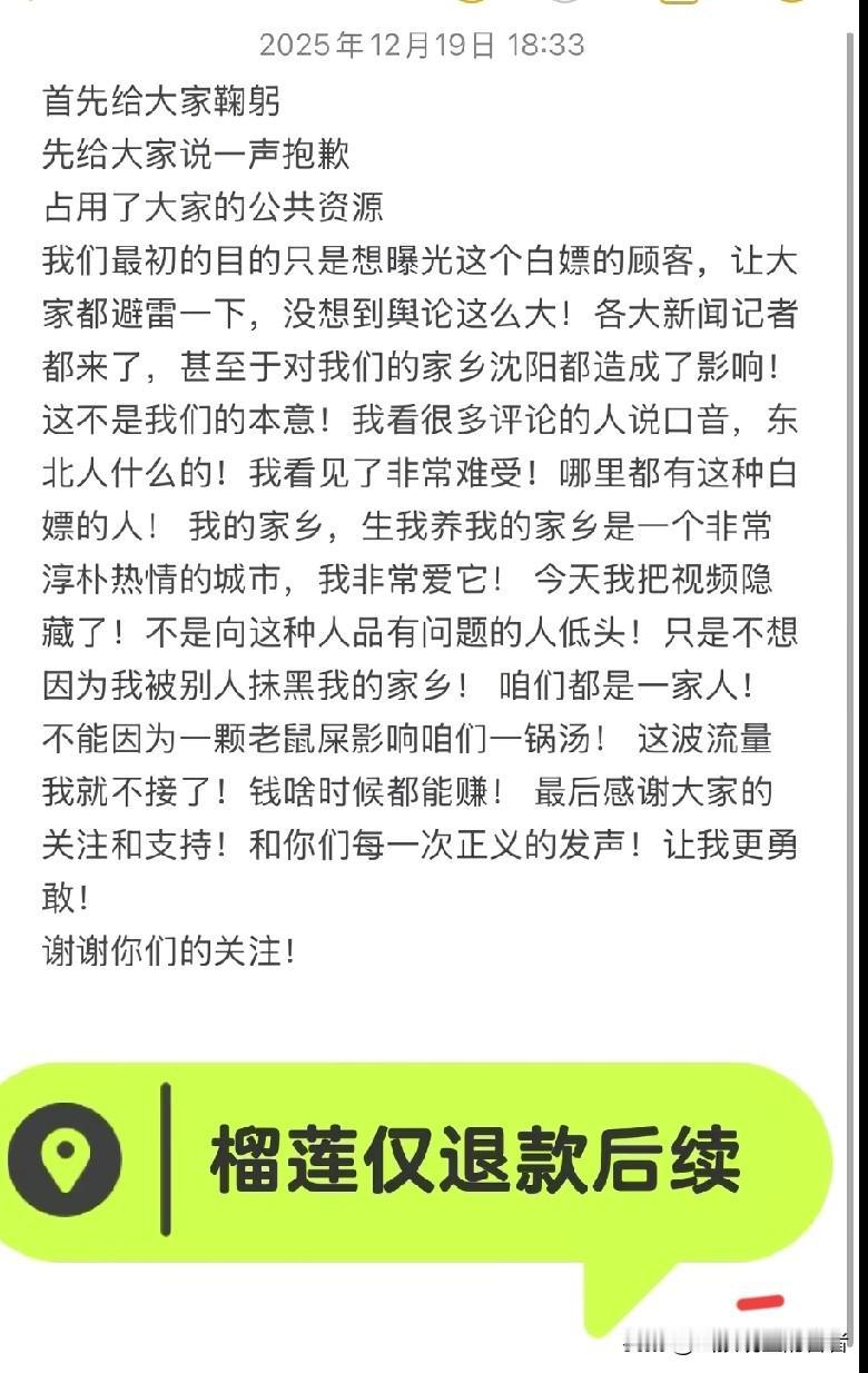 万万没想到!榴莲仅退款事件大结局,道歉的竟是水果店老板! 谁能料到,闹得沸沸扬扬的榴莲“白嫖”风波,最后会是这样的结局! 本以为店主曝光维权能讨个公道,结果他却被迫出面发声,还把相关视频全下架了!原因很直白——文旅部门找上门了。 有网友追问那笔榴莲钱到底退没退,店主无奈回应:早被某团直接退给对方了,他根本拦不住。 更离谱的是,这事发酵后,有人揪着涉事女子的东北口音不放,直接上升到地域黑,各种不堪入耳的言论刷屏,简直让人血压飙升! 店主都忍不住替东北人喊冤:口音根本说明不了什么!哪个地方没几个想占便宜的人?别拿一颗老鼠屎,坏了一锅粥啊! 说到底,这事儿的核心是个别消费者的不诚信行为,还有平台规则是否合理的问题,扯地域黑纯属转移重点。平台不能一味偏袒买家,也得给小商家的权益留条活路;而网友更该理性吃瓜,别让地域偏见盖过事情本身。 你觉得平台的“仅退款”规则,该怎么调整才能兼顾买卖双方的利益?