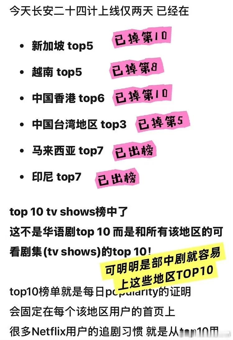 视组打假24计之二:“国内首部杀进奈飞全球榜TOP10,掀起收视狂潮,中剧最佳出海成绩”,实际在各地区热度榜均不断下跌!【打假1】没什么收视狂潮,只是在各地区上映后热度榜上不断下跌,包括后上映的泰国地区,两天后马上从第5跌到第9。吹爆的ww地区本周五也跌到第5了!(图2、3)【打假2】“奈飞没有全球榜,yxh称进入全球榜只是指进入多国家地区榜单”(图4)众所周知网飞每周公布全球榜,非英语榜一向是检验网飞亚剧全球影响力最重要的榜单。24计上周上映,反正上周榜里没见你,那。。。本周周榜见?(图5)【打假3】“中剧以往很难进地区榜TOP10,只在华语榜上”,事实是同时上ww榜、hk榜、坡坡榜、越南榜等几乎大大小小中剧标配,本周你能上,其他剧以往也都能上,还能同时上十多个国家地区周榜,人家还夺冠,不像你抱着只要是部👖剧就能上的ww榜冒充全球榜还秒失前三。(图678)被冒充全球榜的ww榜,难道不是只要是部中剧就能上?图9