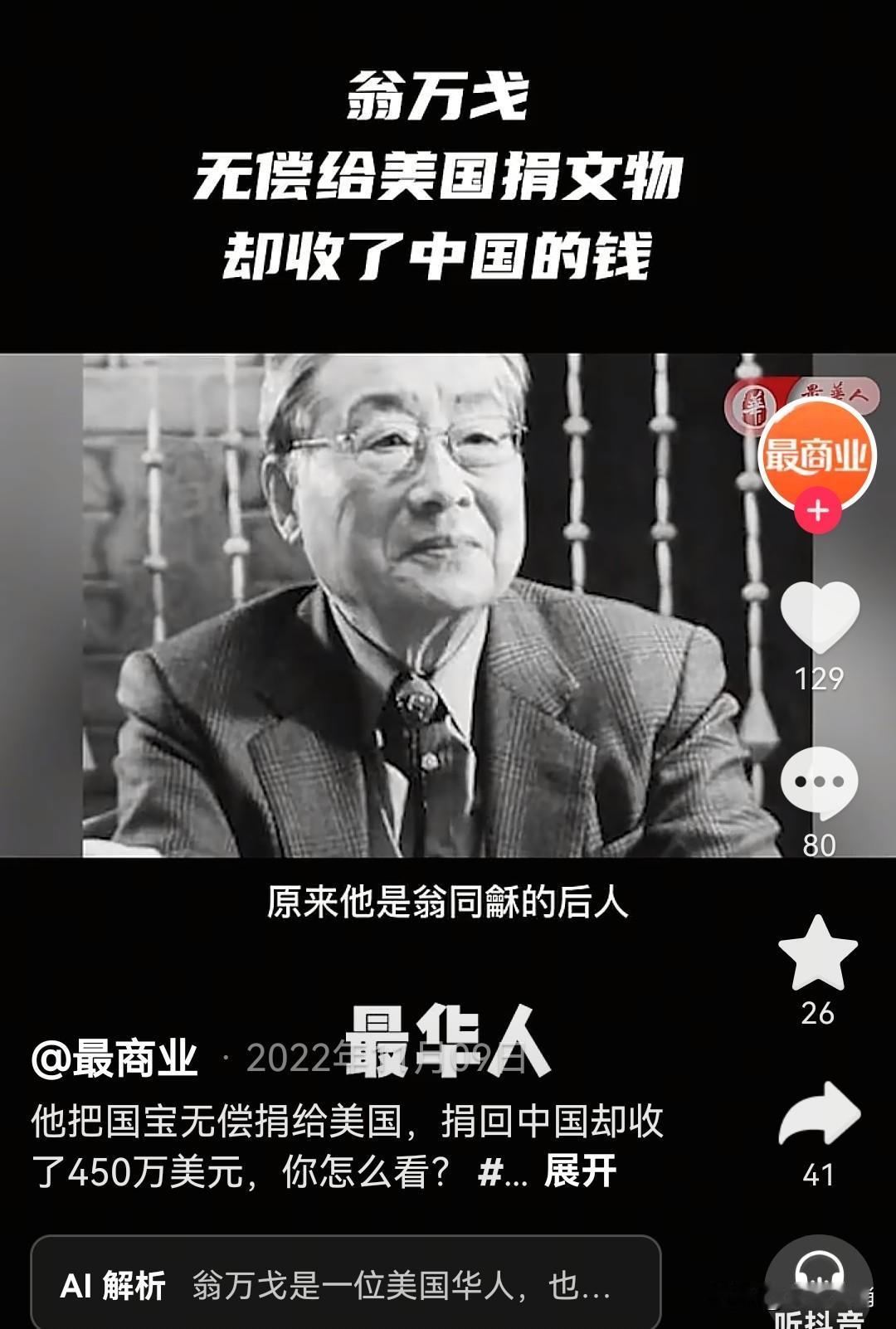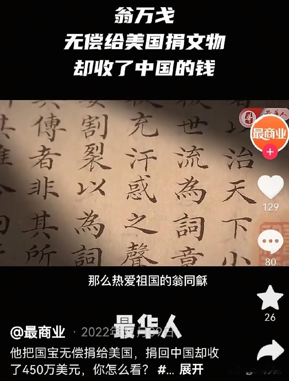 翁万戈无偿给美国捐献183件珍贵文物,而给中国的文物确收了450万美元的钱。 美籍华人翁万戈收藏了巨量的中国文物,他把183件国宝捐美国,拒国内回购,理由竟是“我们保管不好”? 这哪是担心保管万,分明是私心作祟。今天中国无论是技术还是经济实力,都有这个能力保护好些文物。有几个原因。 第一,他无偿捐赠美国,可以让他的子孙后代可以在博物馆里做董事,可以在美国的精英阶层里。 第二,部分卖给中国,经济利益也有了,这妥妥的名利双收啊!这哪是我们管不好,分明是为了自己家族的利益。 大家怎么看,欢迎来聊!翁万戈 万戈财富 海外捐赠文物