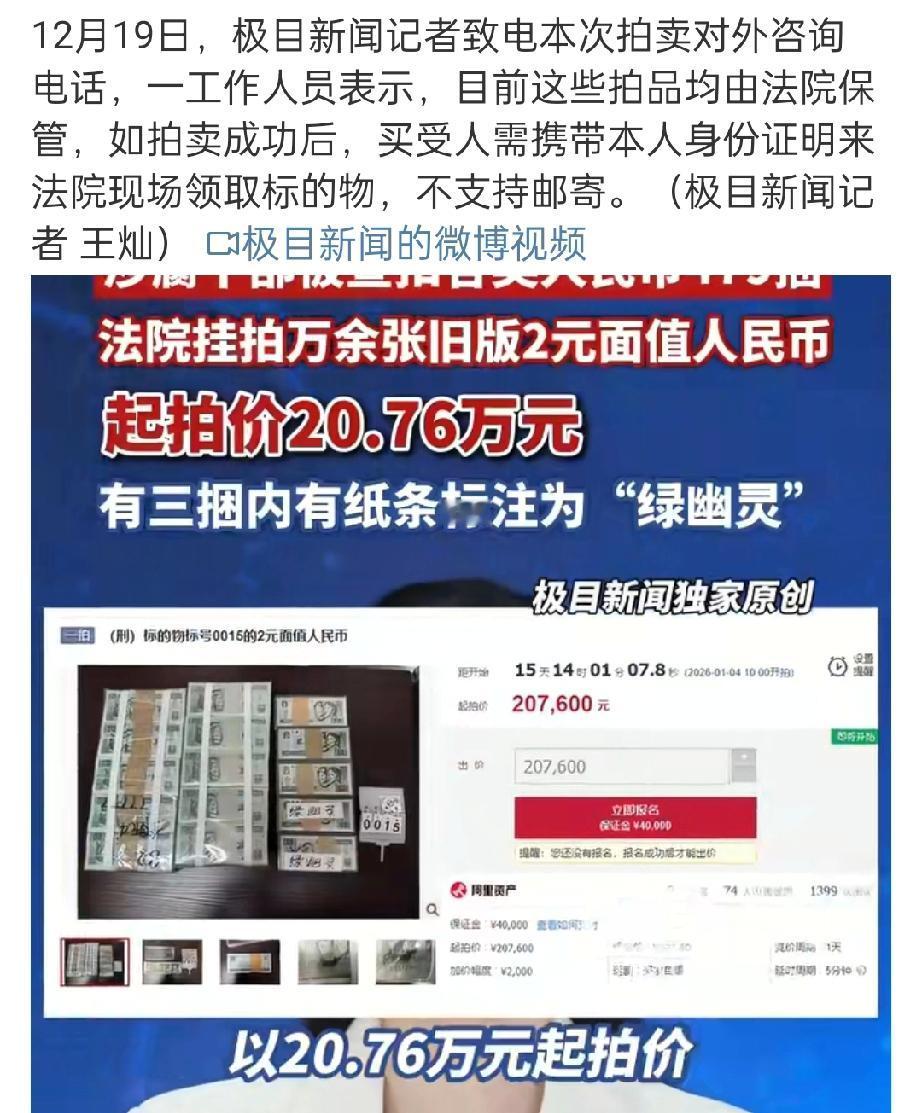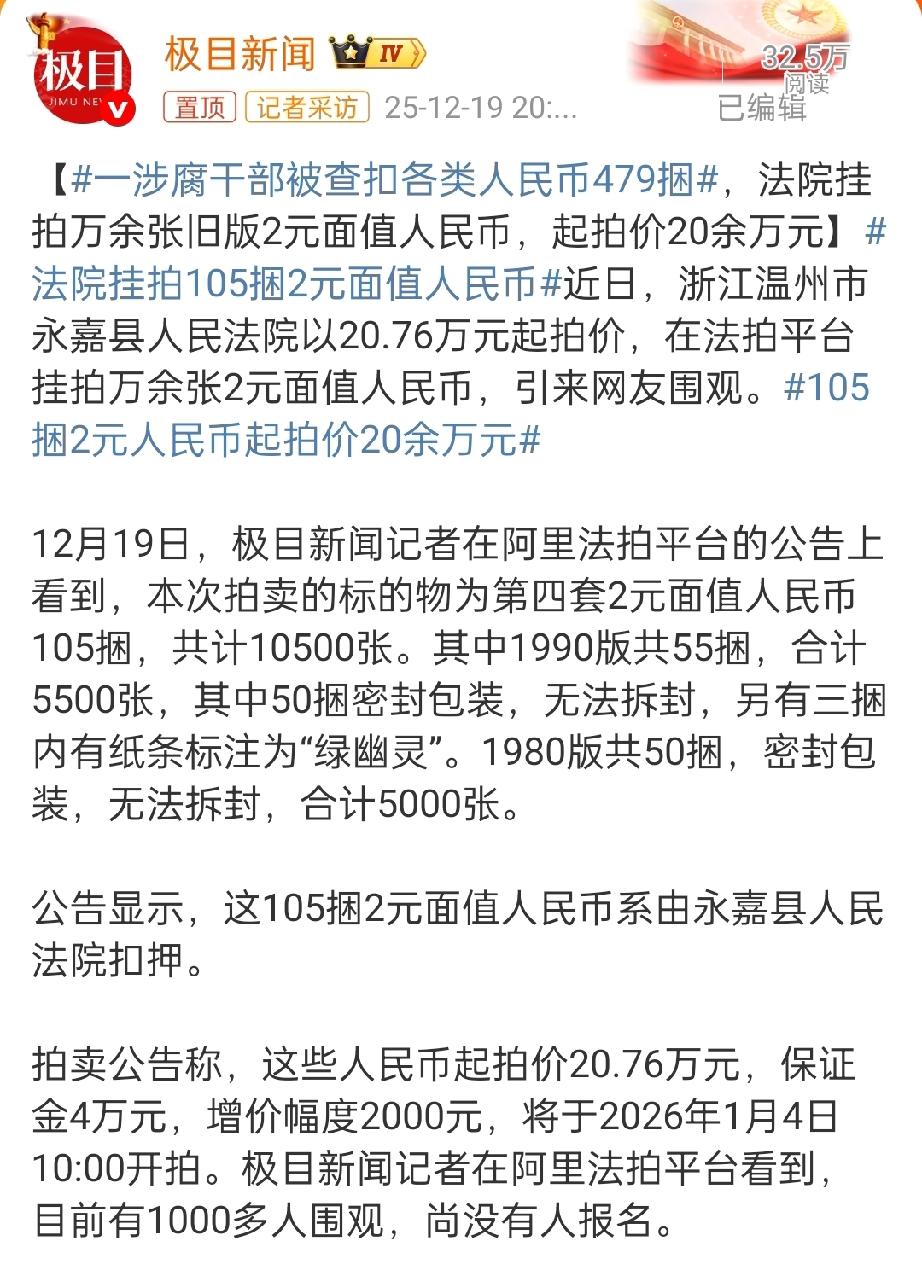 💰贪官藏的2元旧钞法拍火了!105捆起拍20万,还藏“绿幽灵”彩蛋~ 🔸 家人们谁懂啊!温州法院挂拍的这波操作太秀了! 被执行人贪了479捆现金,现在105捆第四套2元钞被拿出来卖,足足10500张! 🔸 重点来了!里面有3捆标着“绿幽灵”✨ 懂行的都知道,这可是收藏界的硬通货,单张能涨上千倍,简直是开盲盒既视感! 🔸 起拍价20.76万,现在1000多人围观零报名😂 是怕密封包装看不到品相,还是在等捡漏?毕竟贪官的“遗产”,这波性价比有点迷~